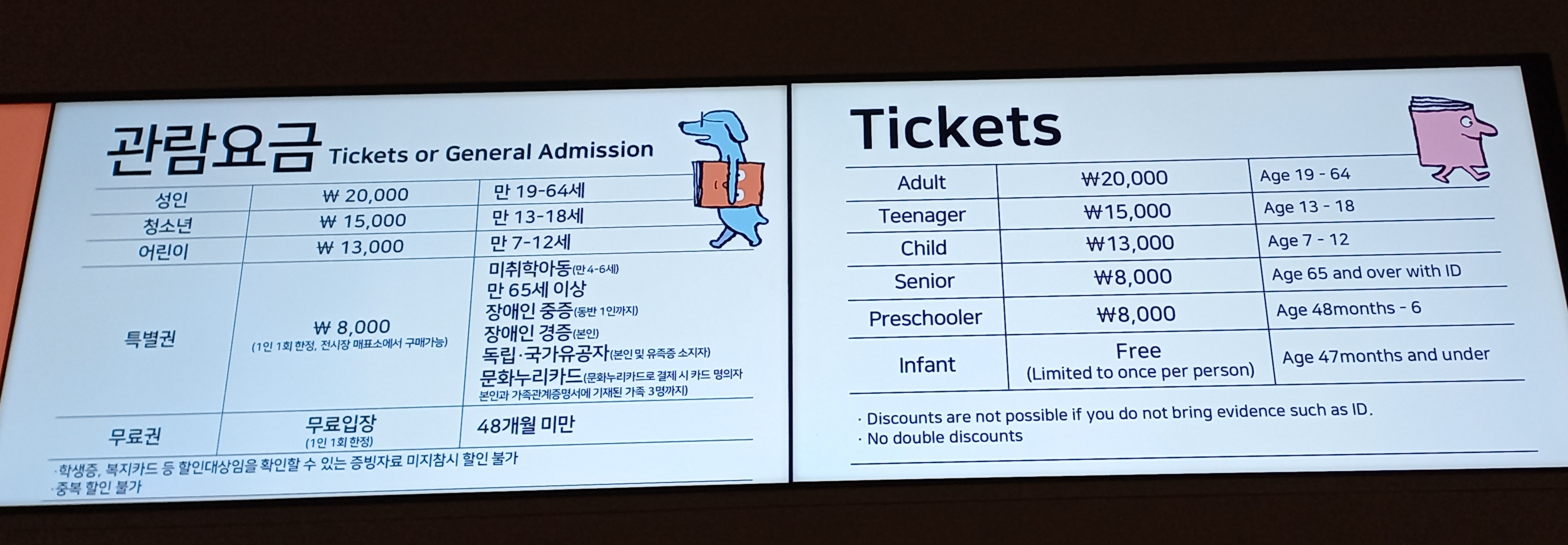 관람료(입장료) 성인 2만원, 청소년 15,000원, 어린이 13,000원, 미취학아동 8,000원