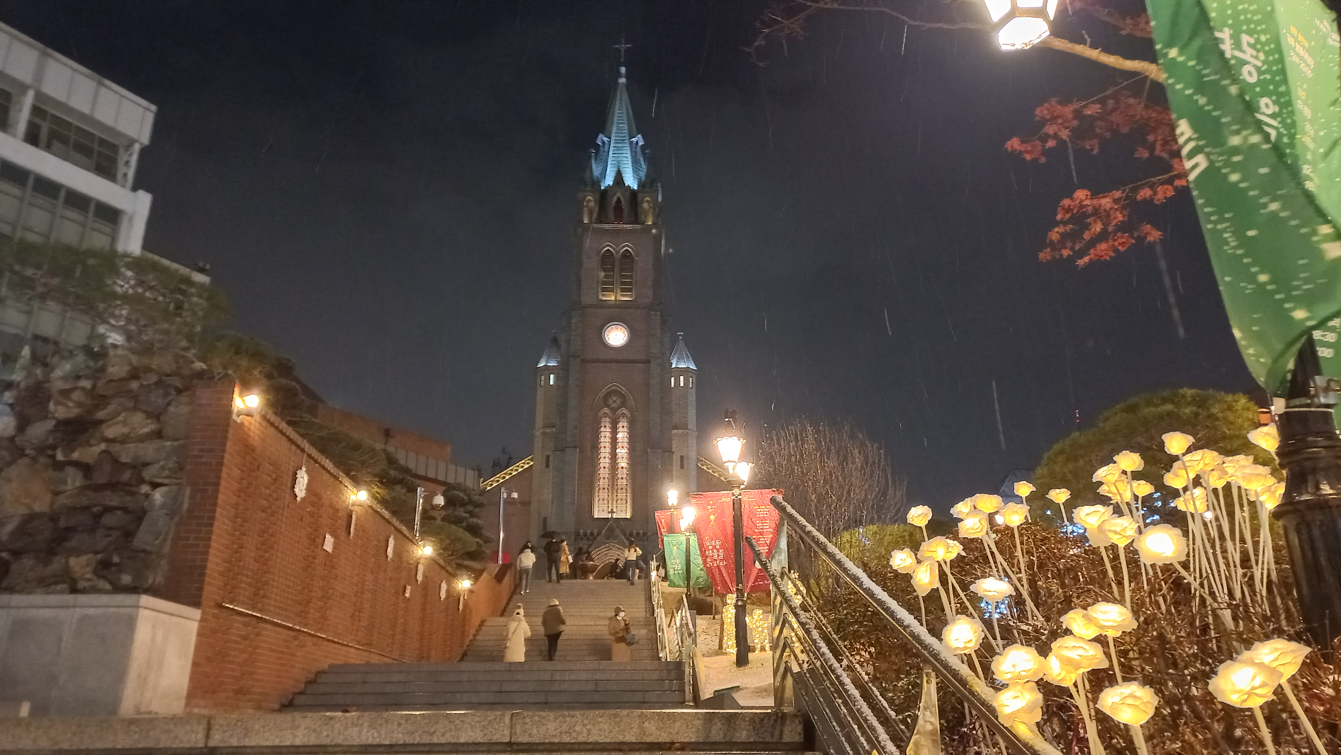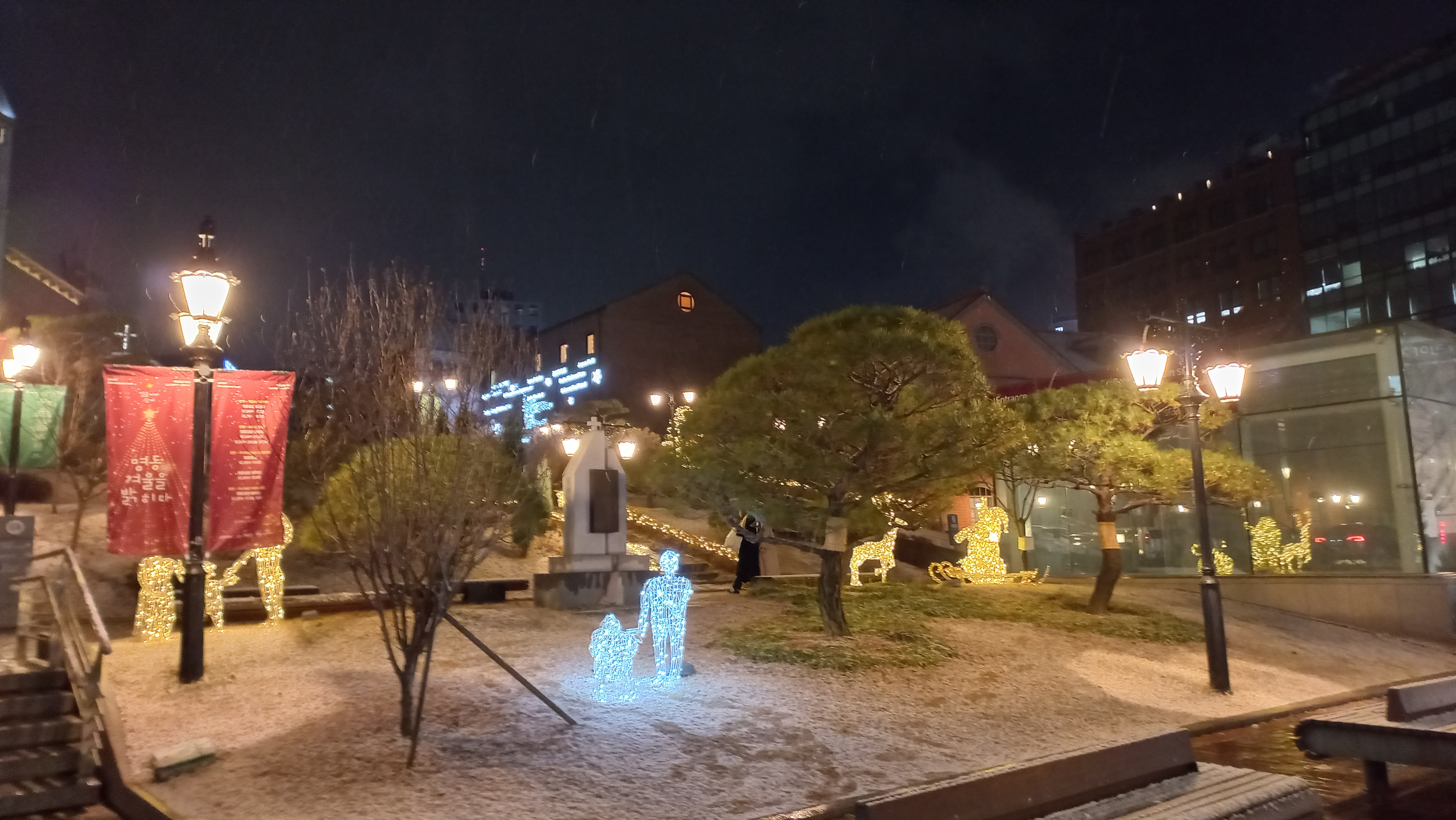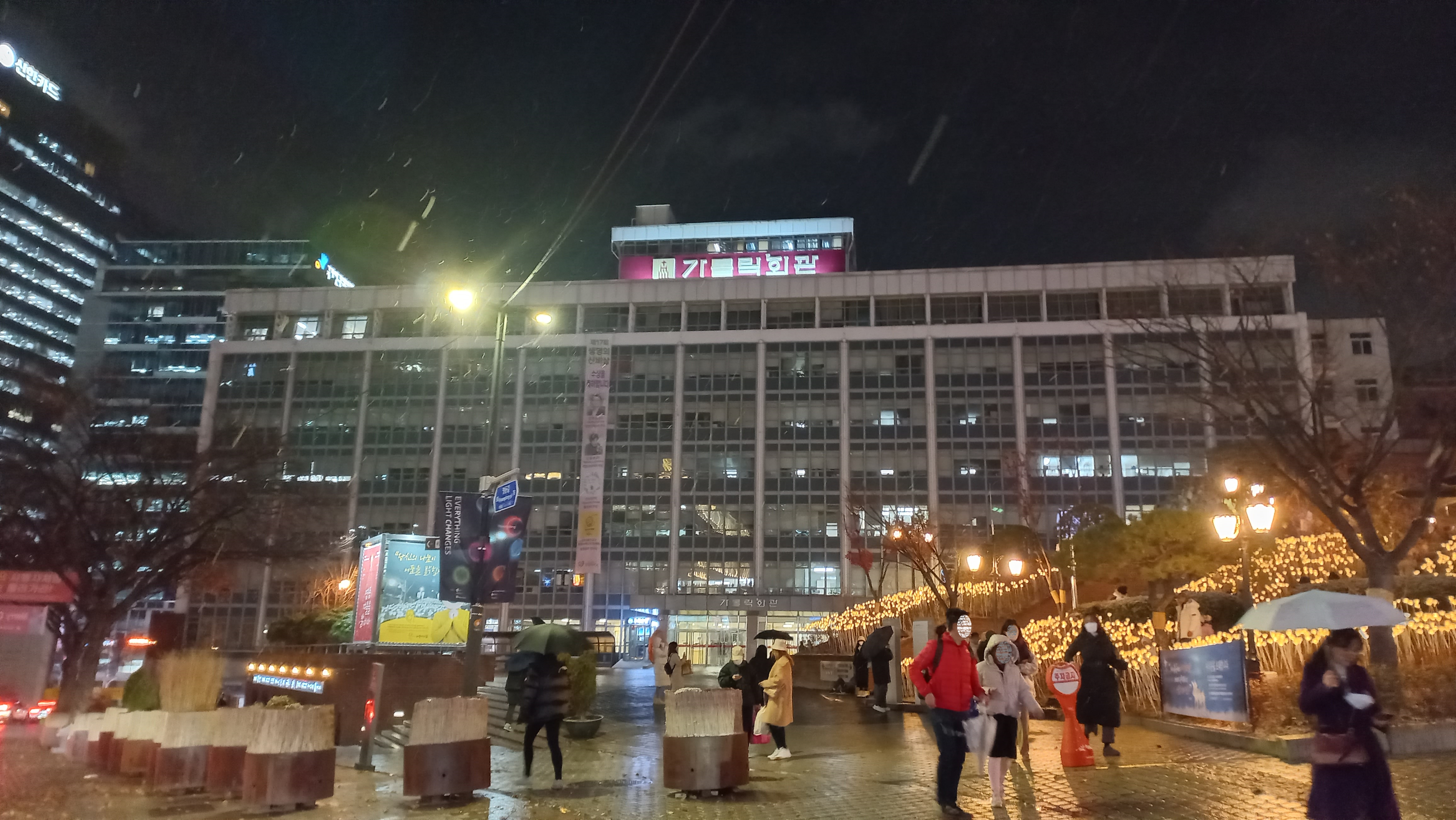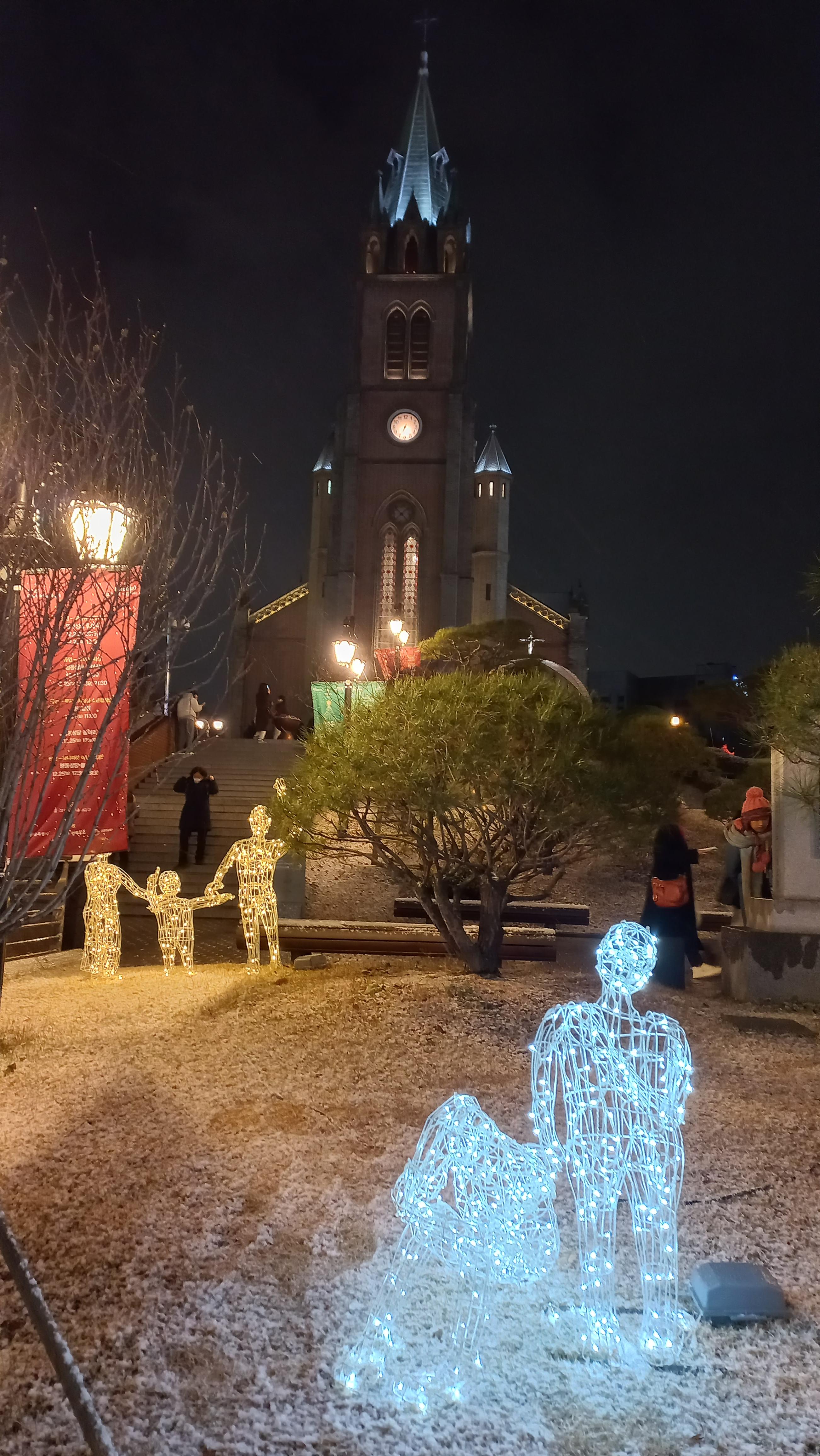 롯데백화점 미디어 파사드와 명동거리의 크리스마스 분위기가 느껴지는 풍경을 보고 명동성당으로 이동했습니다.