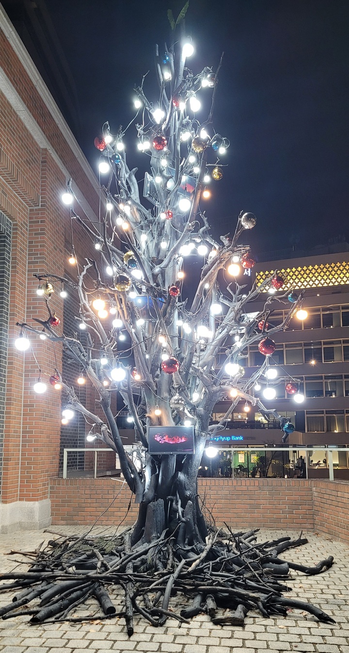 명동성당 파밀리아채플 앞에 세워진 타버린 나무에 꾸며진 크리스마스 블랙트리