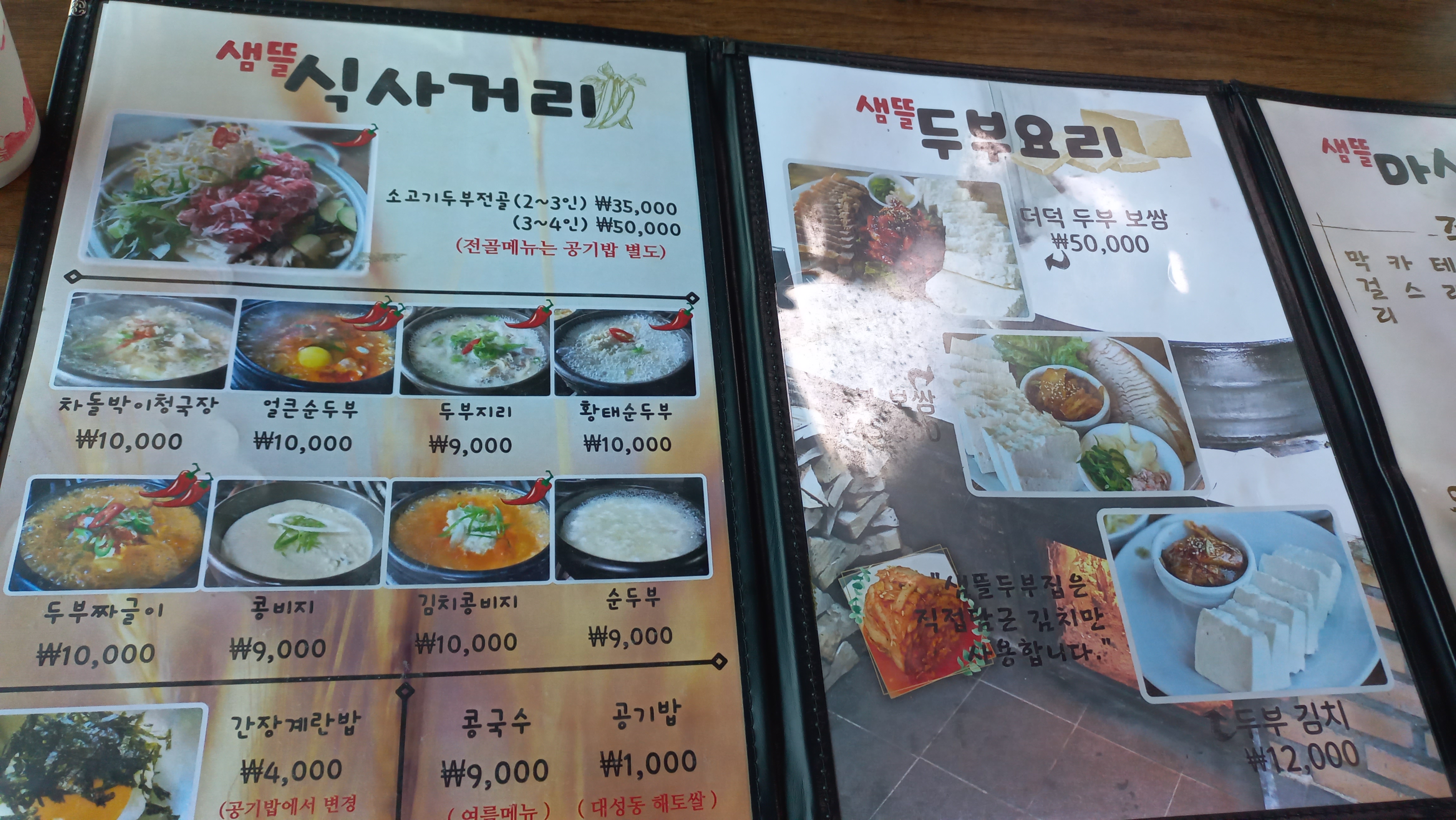 차돌박이 청국장, 얼큰 순두부, 두부지리, 황태순두부, 두부짜글이, 콩비지, 김치콩비지, 순두부 등의 식사메뉴까지 있습니다.