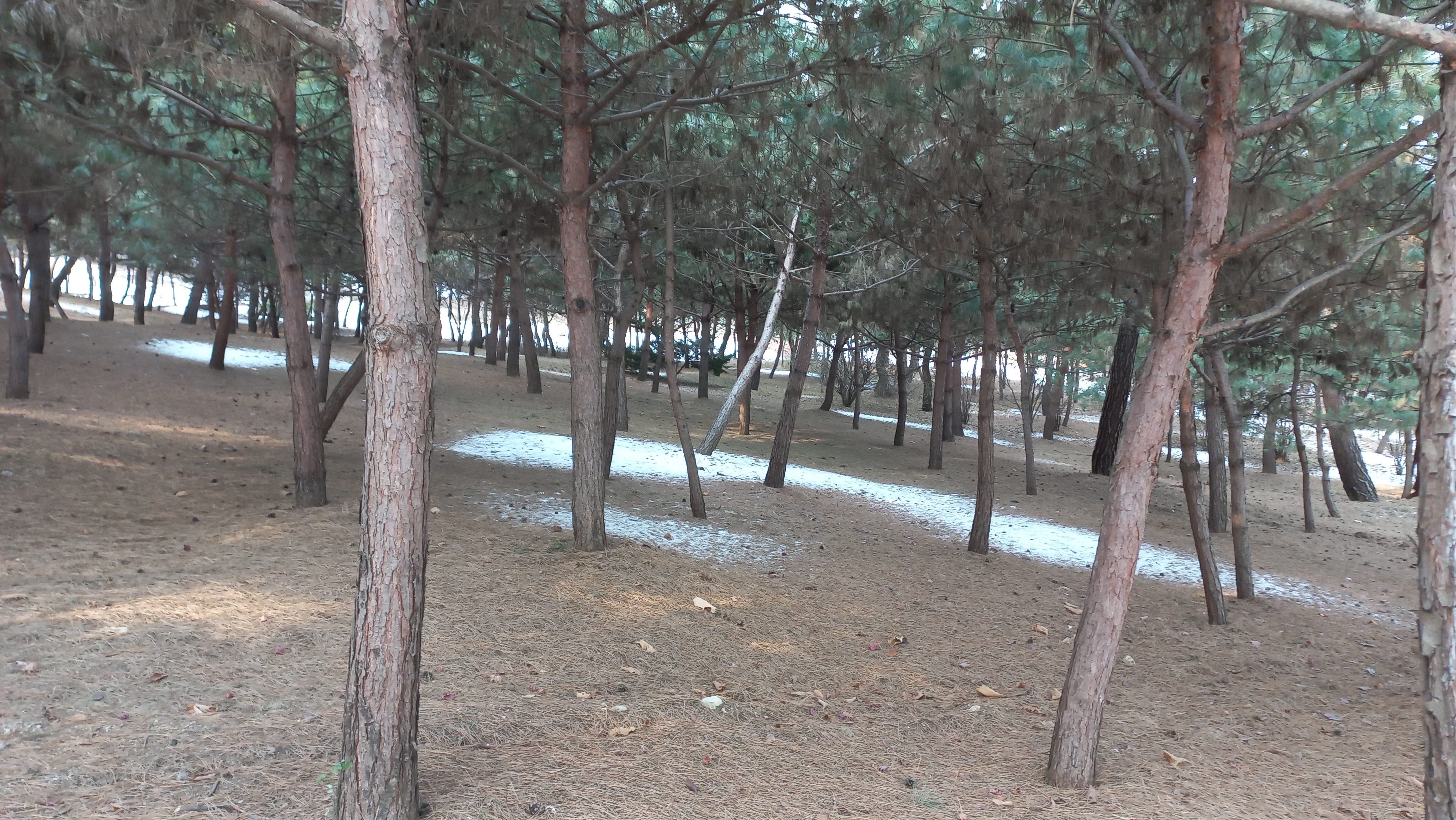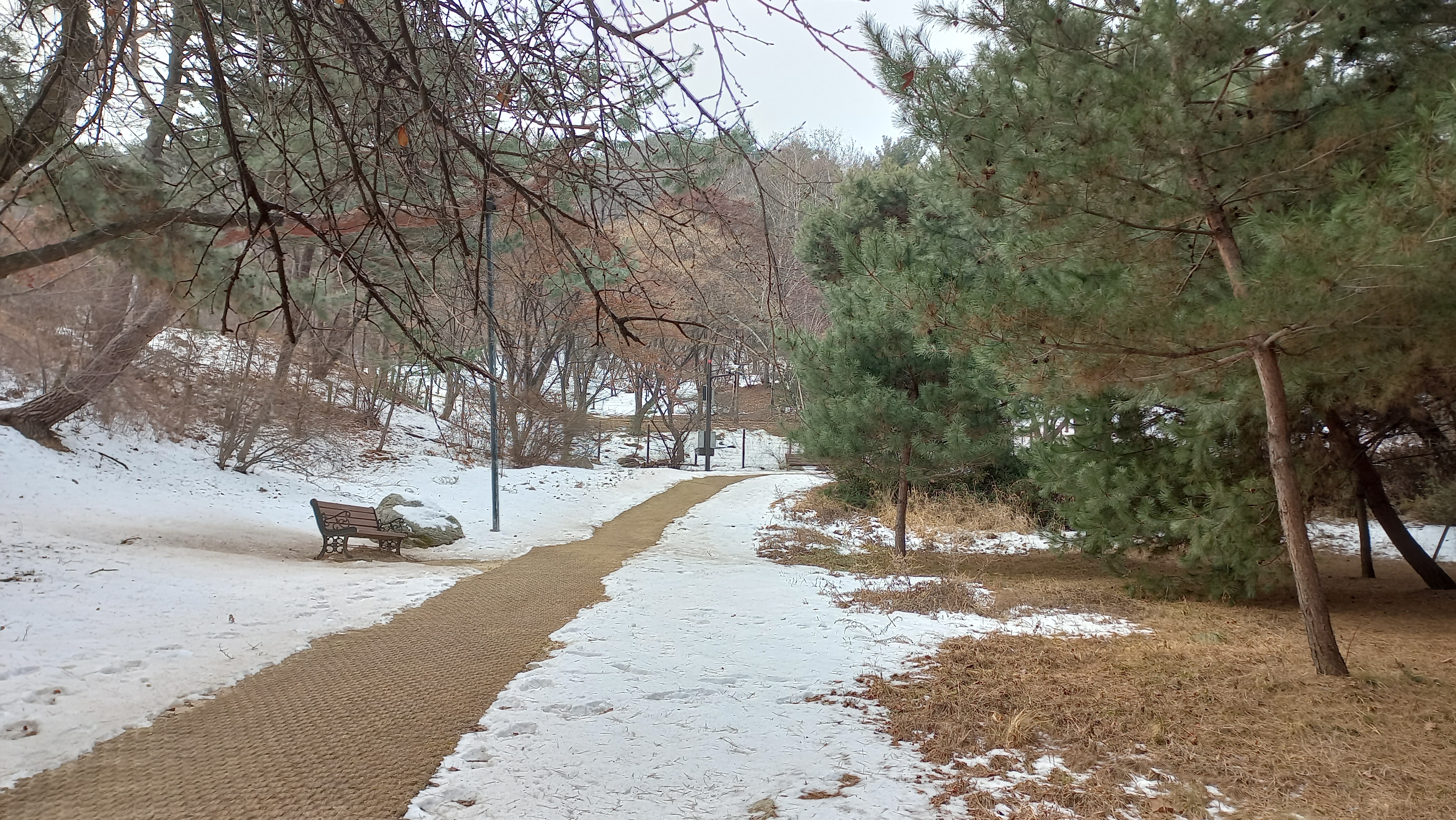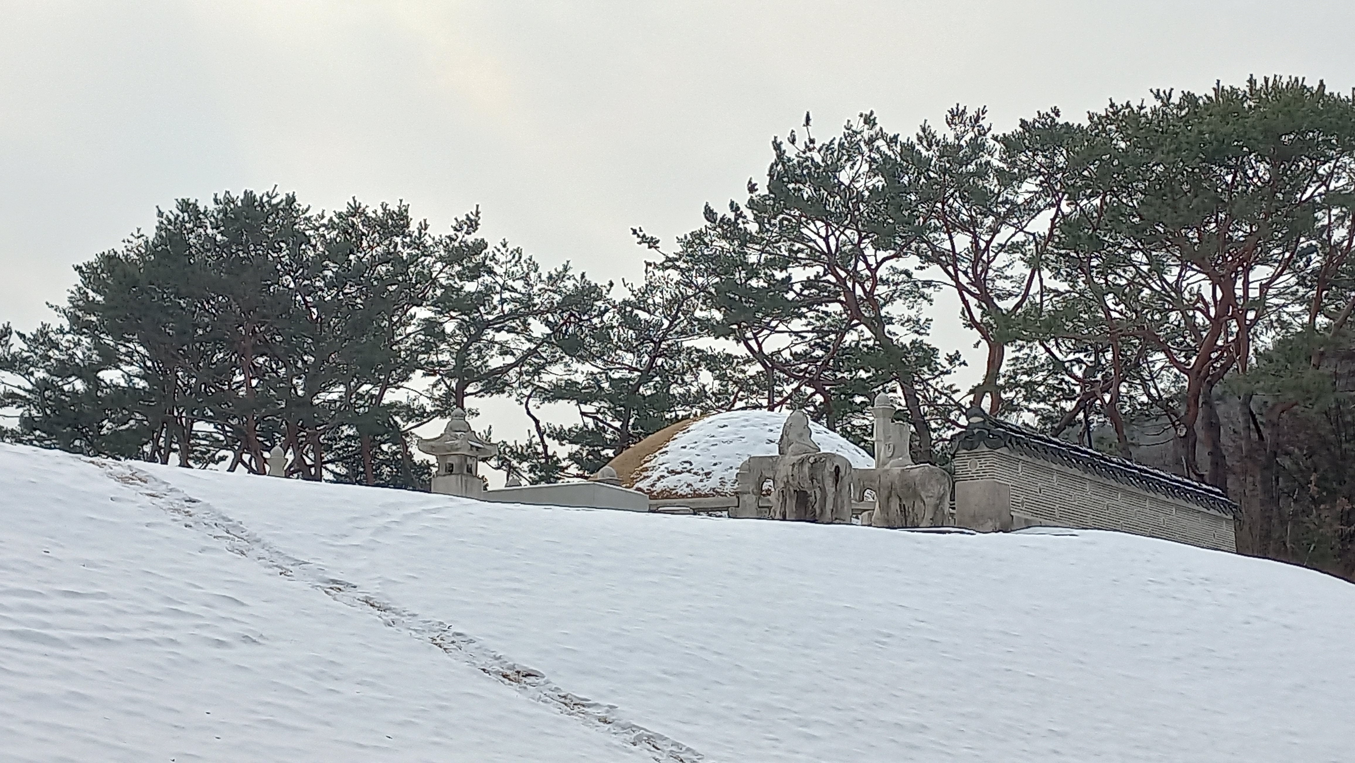 서울 의릉 숲길의 소나무 사이사이엔 눈이 내려 이색적인 풍경을 만들어 내고 있습니다.