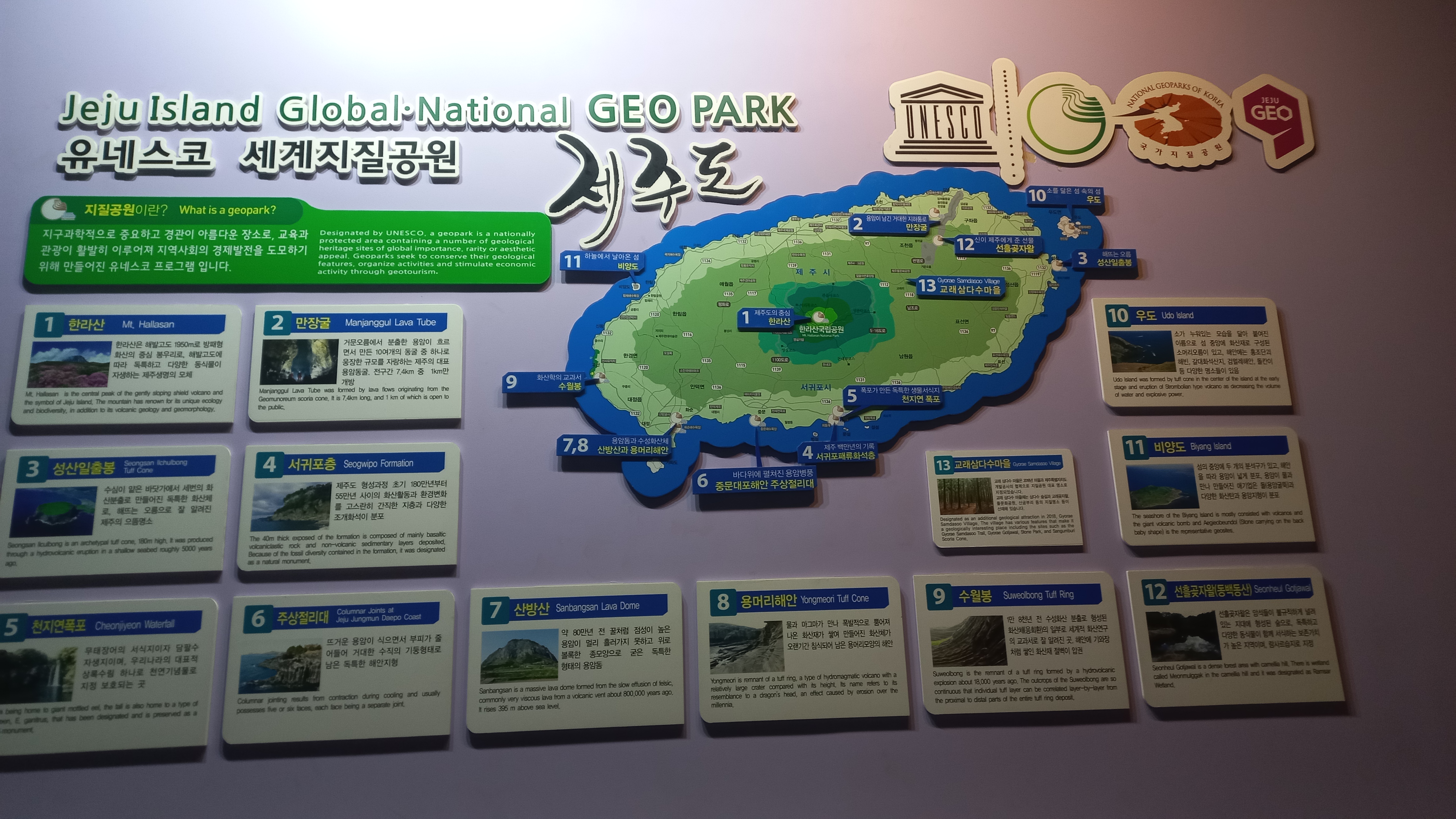 한라산, 만장굴, 성산일출봉, 서귀포층, 천지연폭포, 주상절리대, 산방산, 용머리해안, 수월봉, 선흘곶자왈, 비양도, 우도, 교래삼다수마을