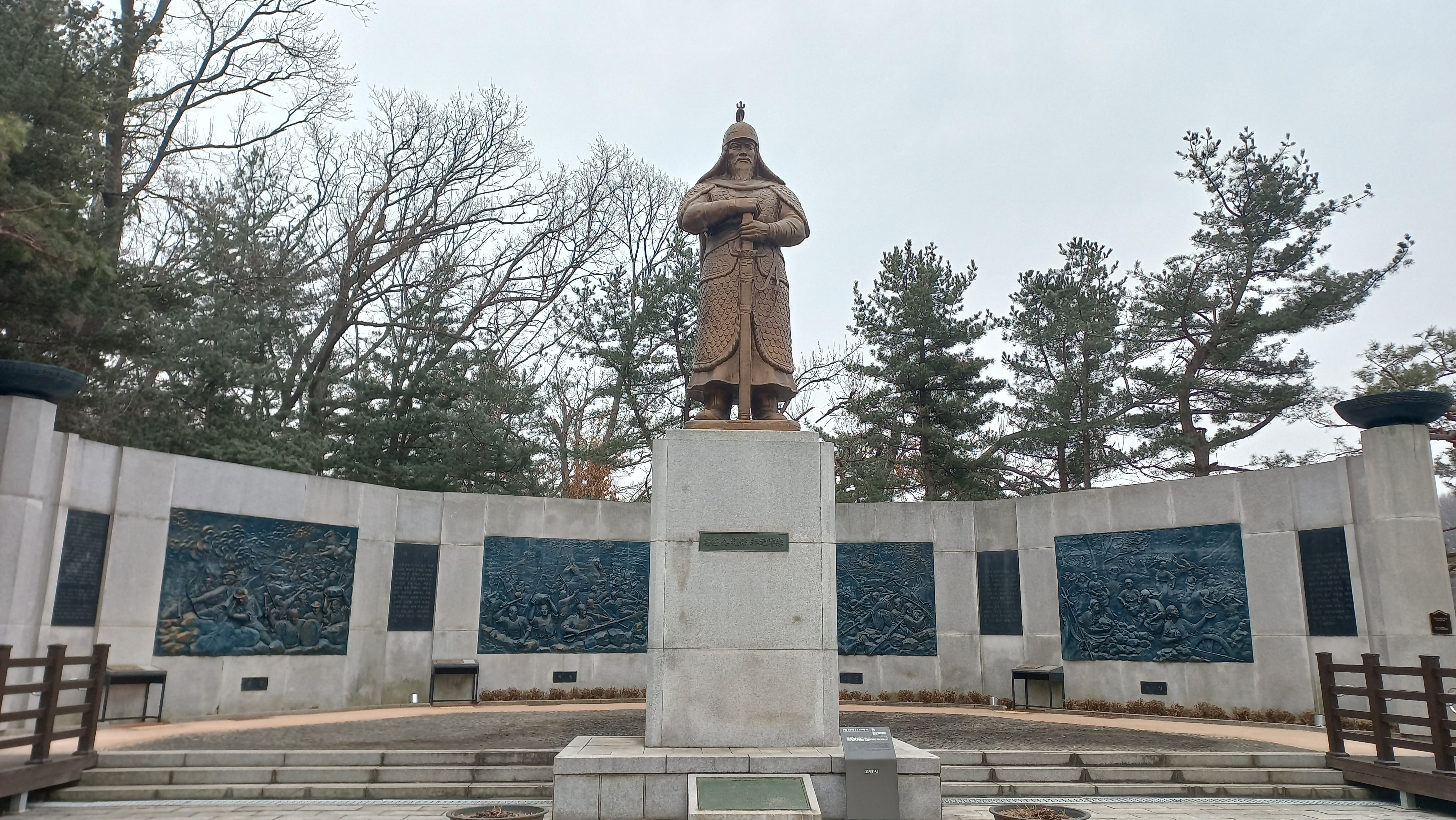 행주산성 입구, 대첩문 앞에 세워진 충장공 권율장군 상 및 행주대첩 부조