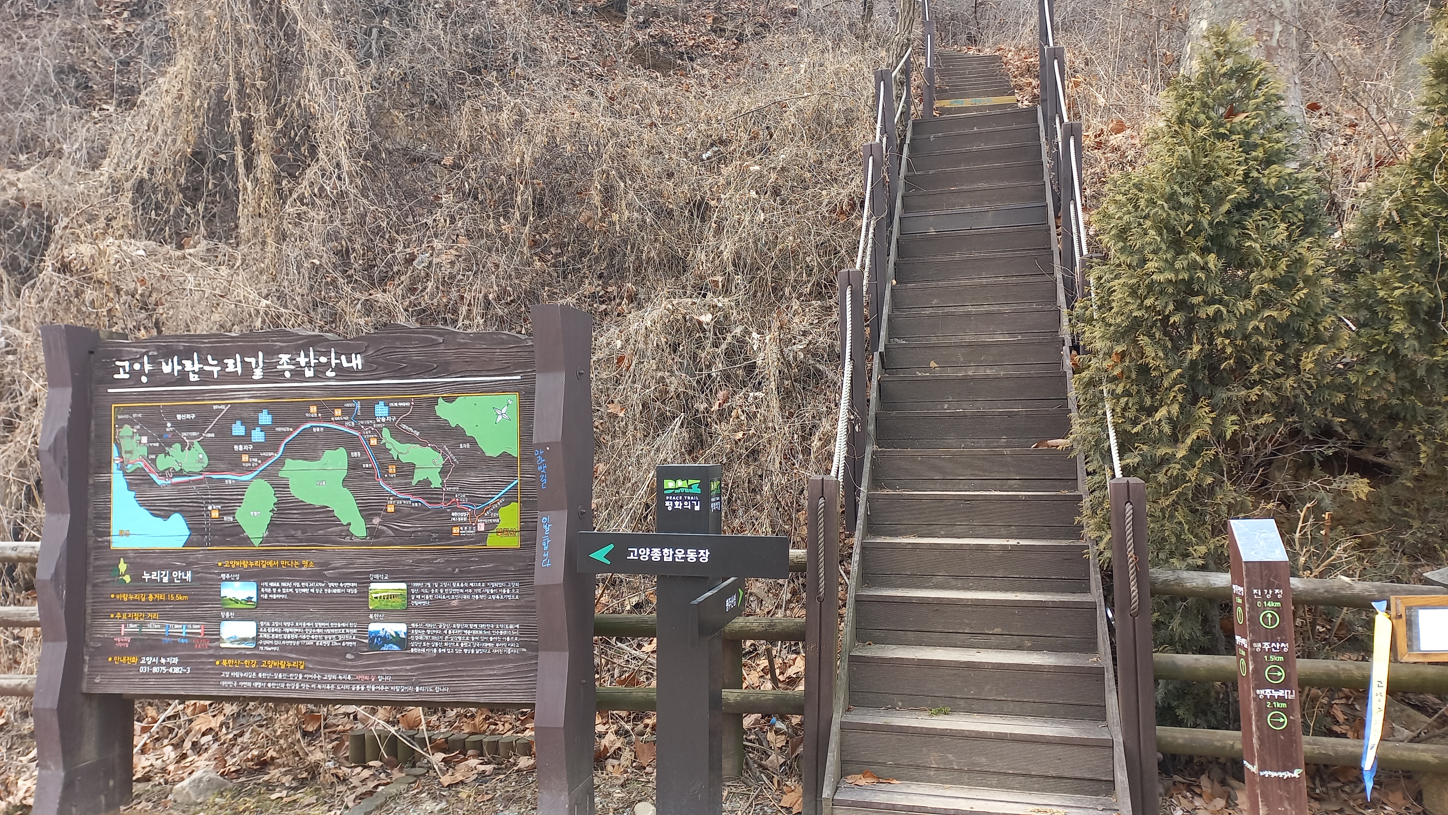 중간 정도 가면 행주산성으로 곧바로 올라가는 길이 나오는데, 이곳에서 오르지 않고 고양대덕생태공원 방향으로 계속 직진합니다.