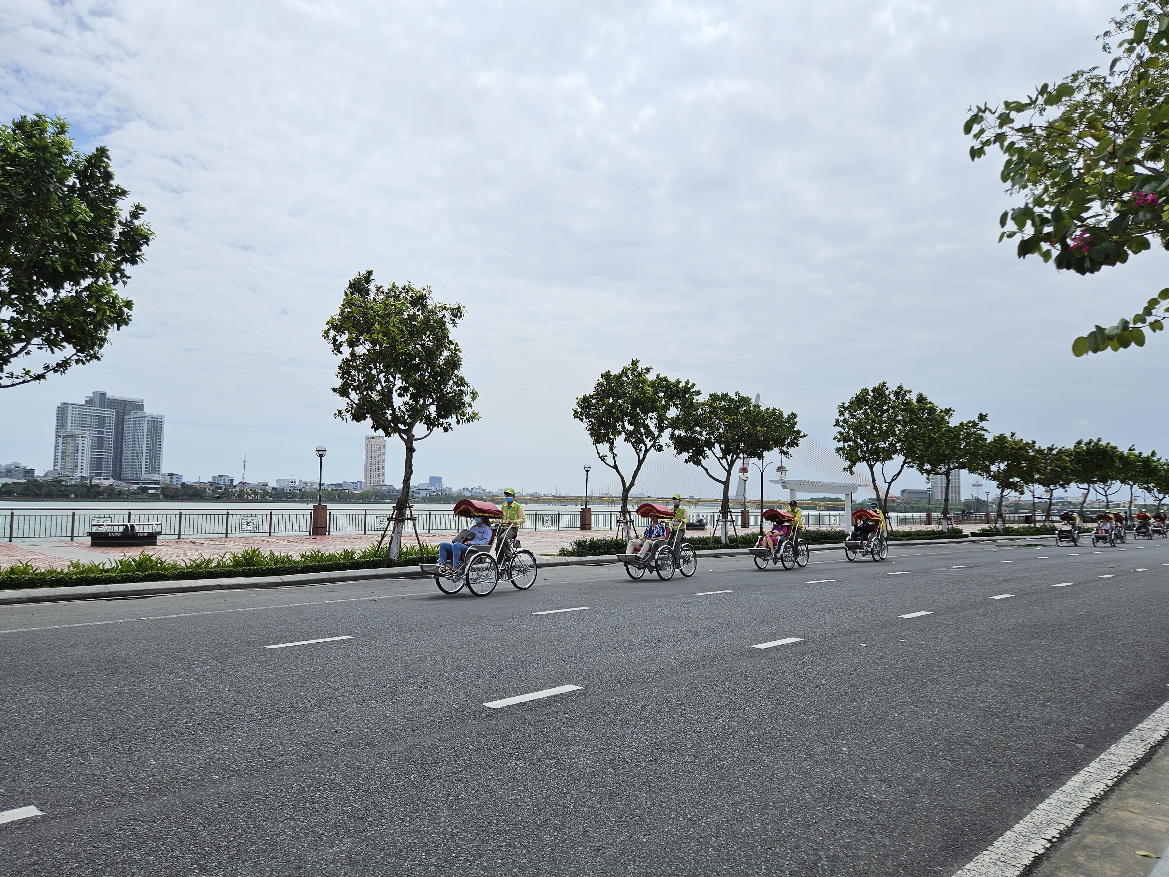 다낭 APEC공원 앞에는 씨클로가 줄지어 달리는 도로가 있고, 그 앞에 한강이 흐르고 있습니다.