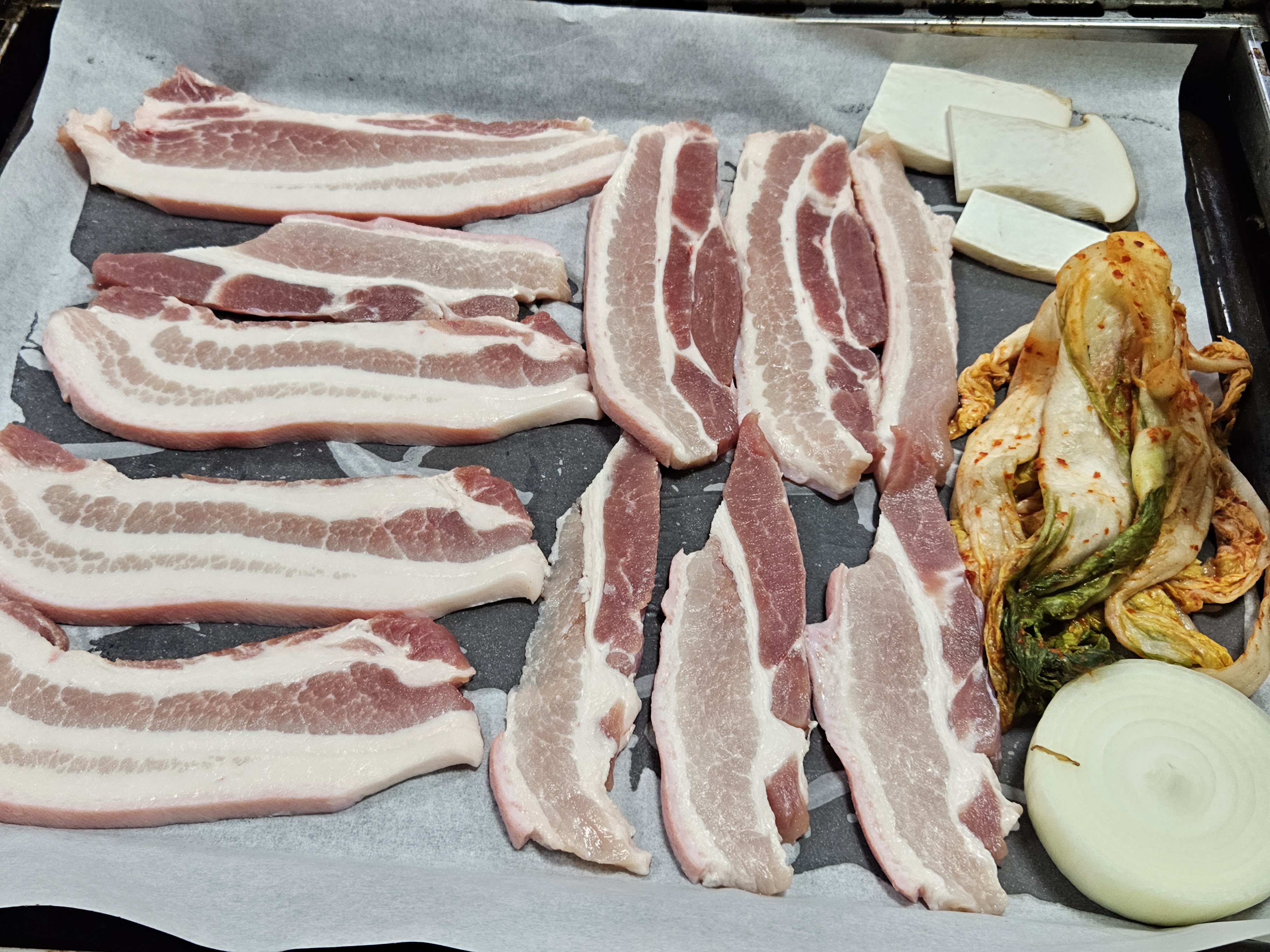 삼겹살 역시 불도 키지 않고 철판에 미리 깔려 세팅되어 있는 모습