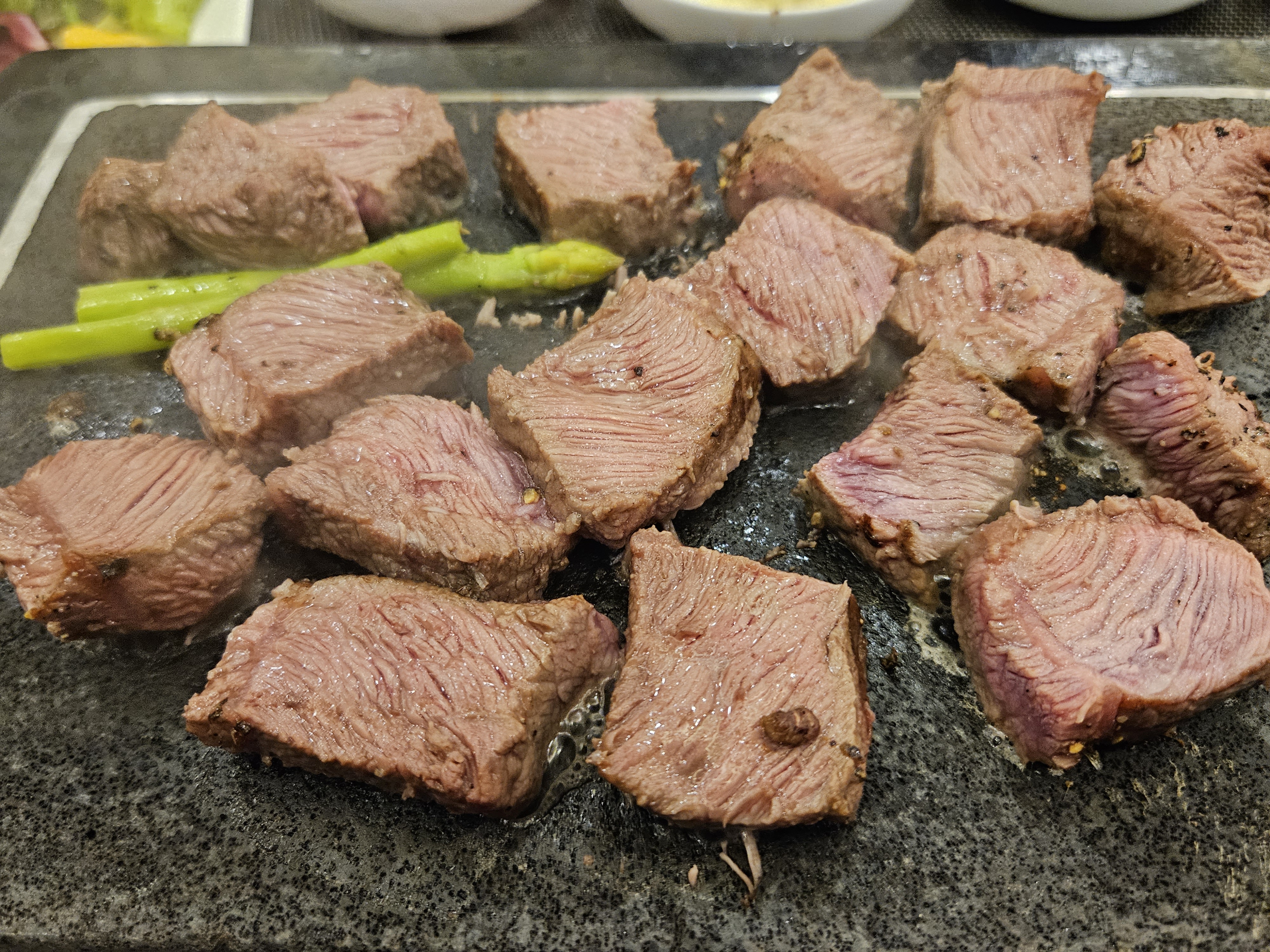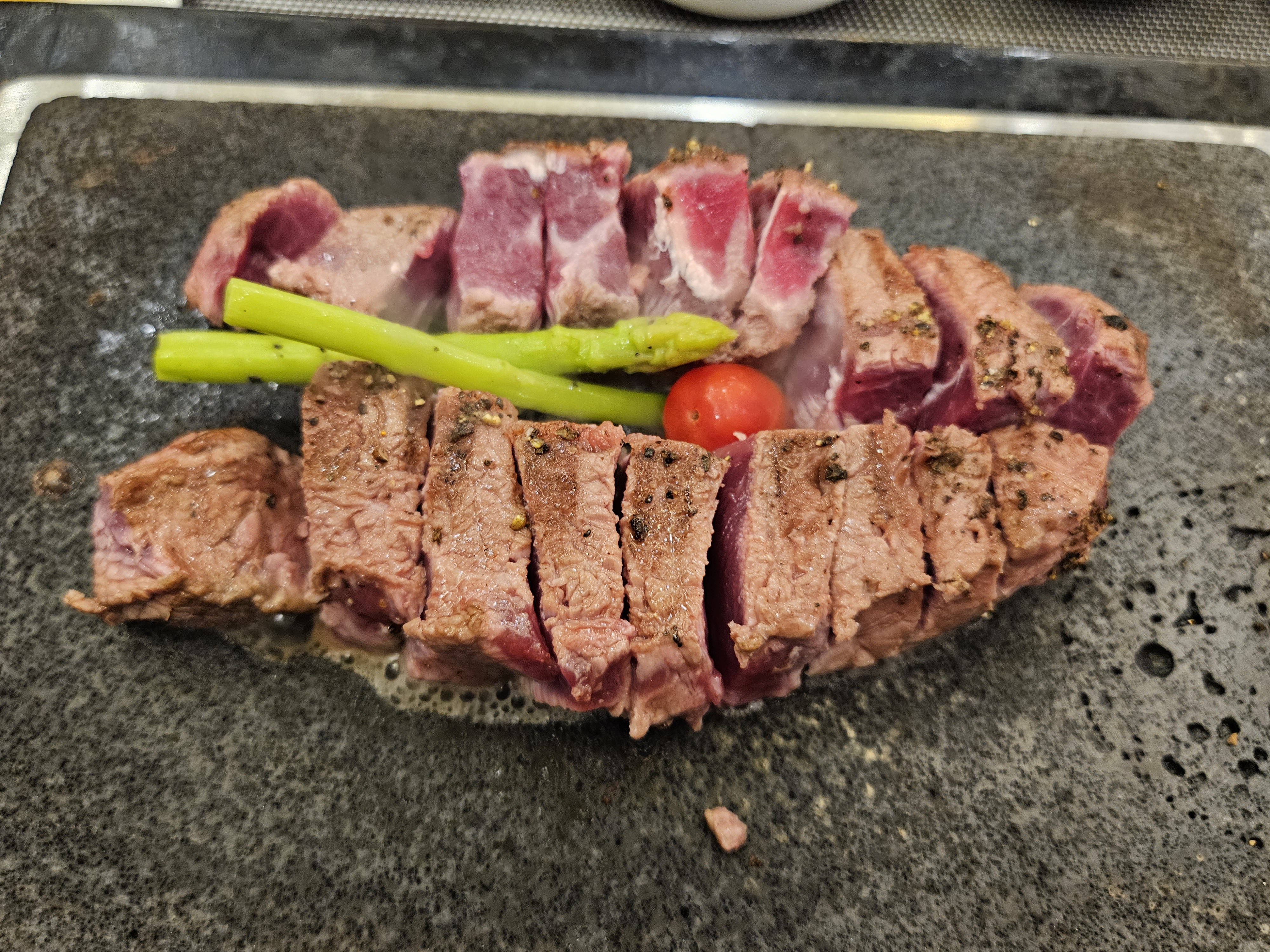 돌판 위에 있으니 자르면서 익어가고, 테이블에 놓여서 먹는 동안에도 익어갑니다.