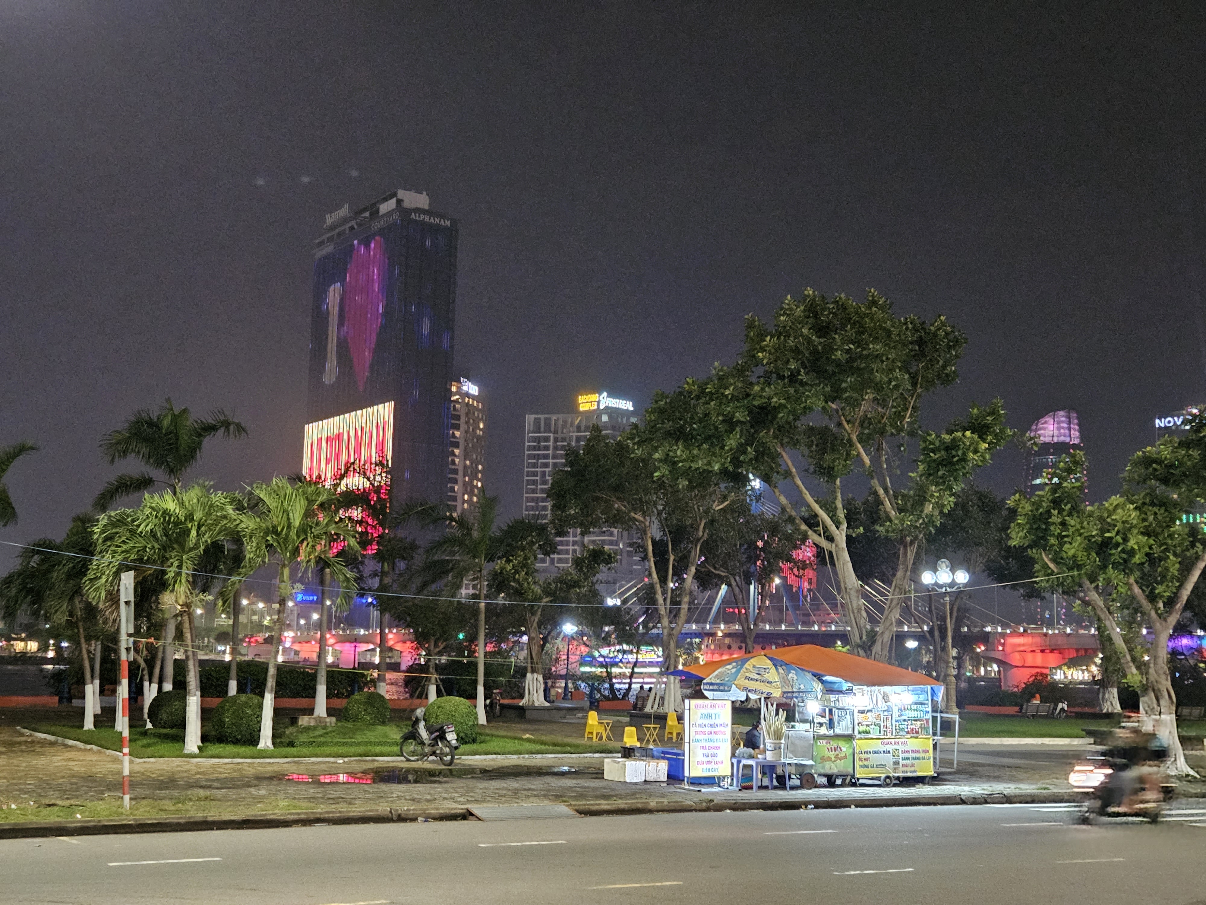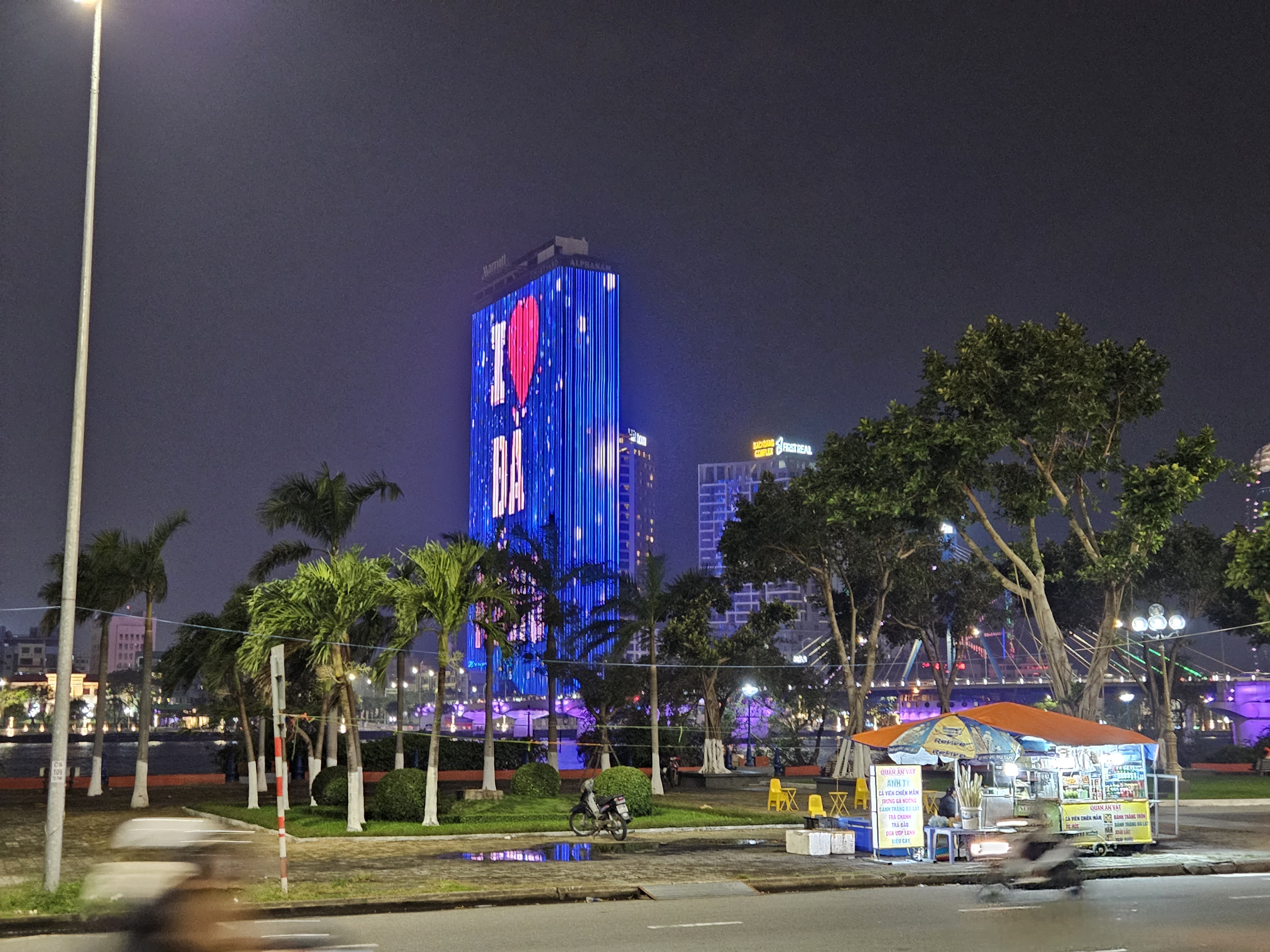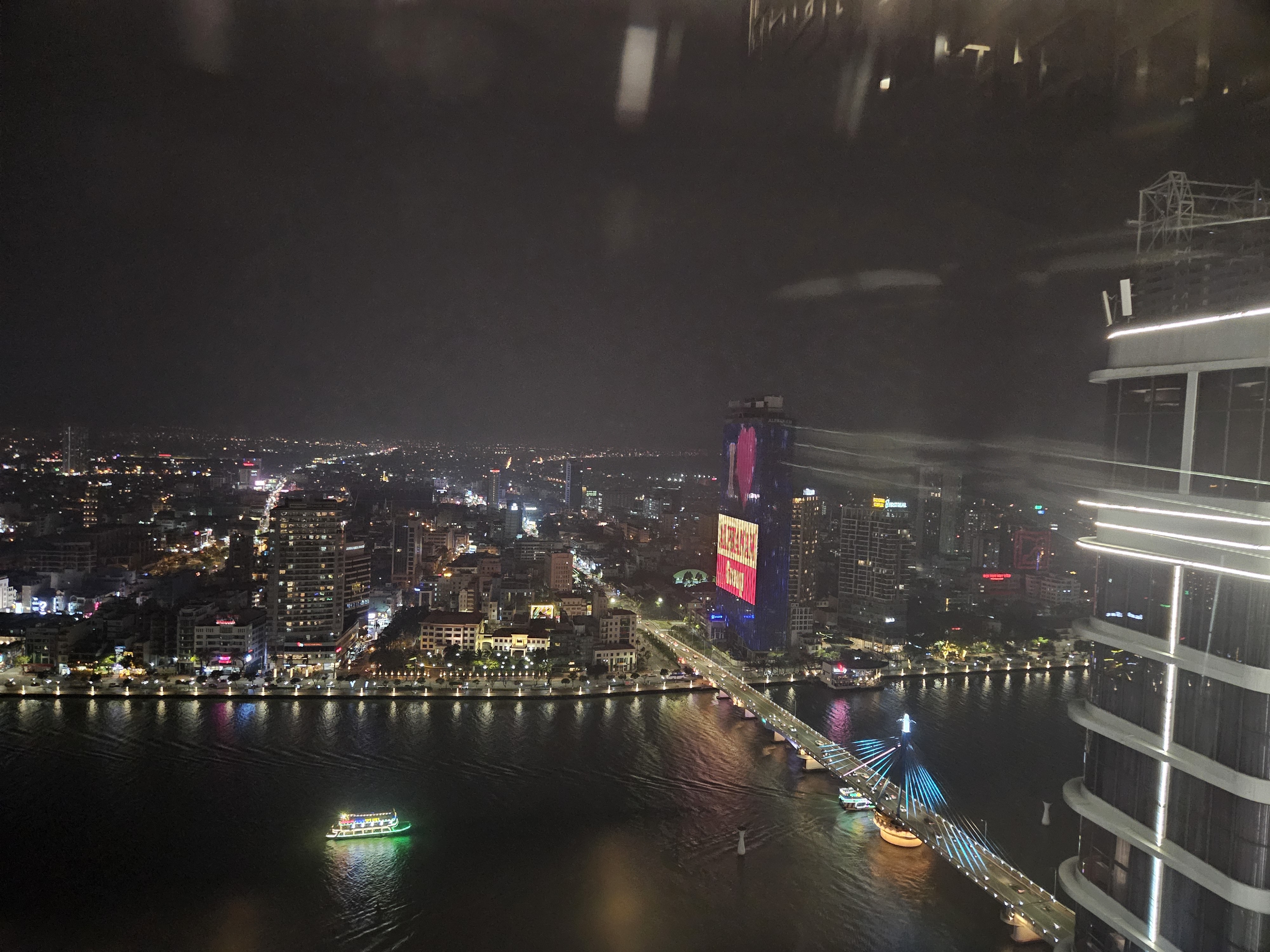 한강 맞은편, 높은 건물 벽면 전체를 홍보하고 있는 다낭 관공서가 압도적인 불빛으로 시선을 강탈합니다.