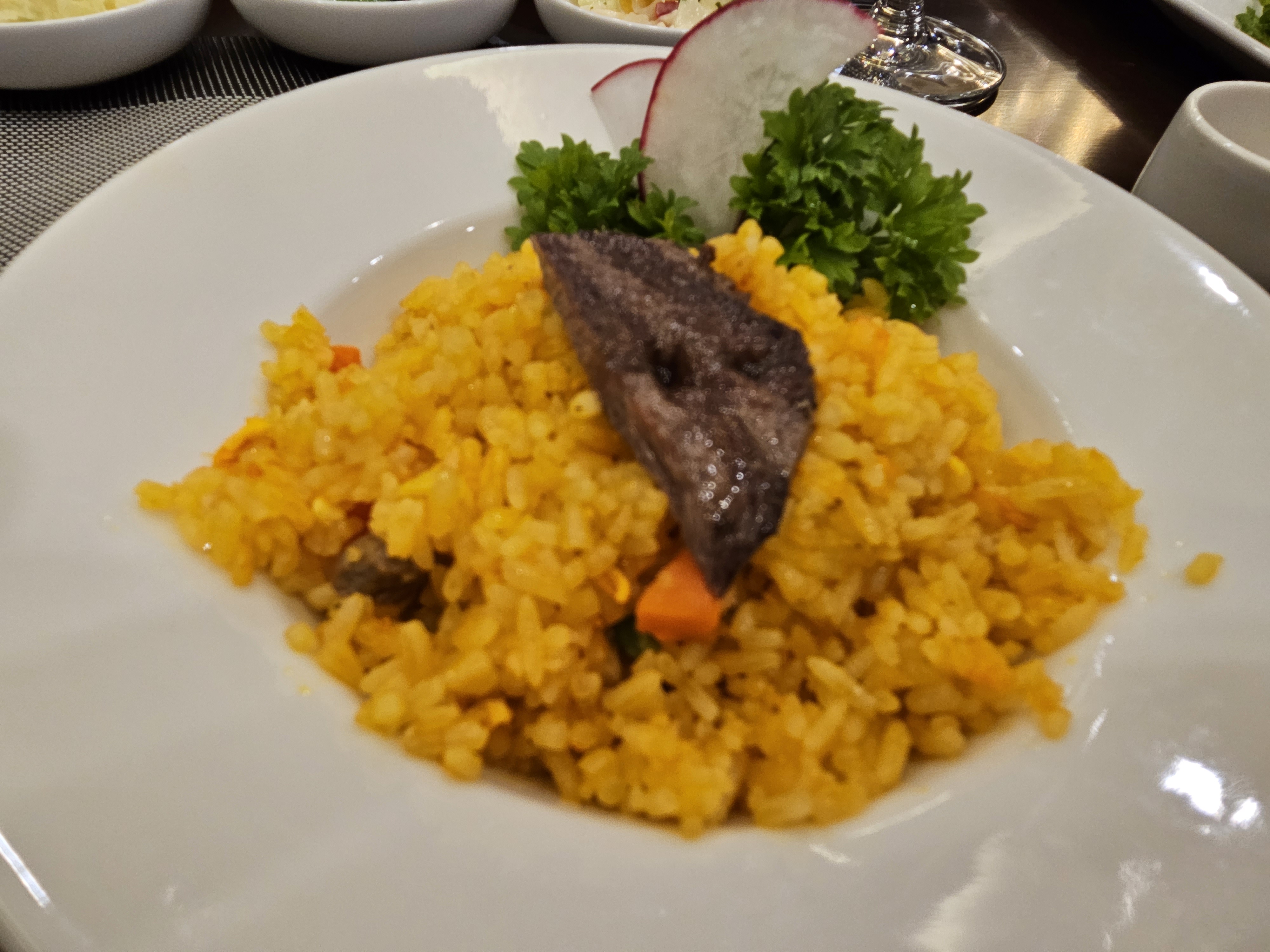 노란 볶음밥과 스테이크 찍어 먹을 소스 3가지, 야채샐러드와 반찬이 놓여 있습니다.