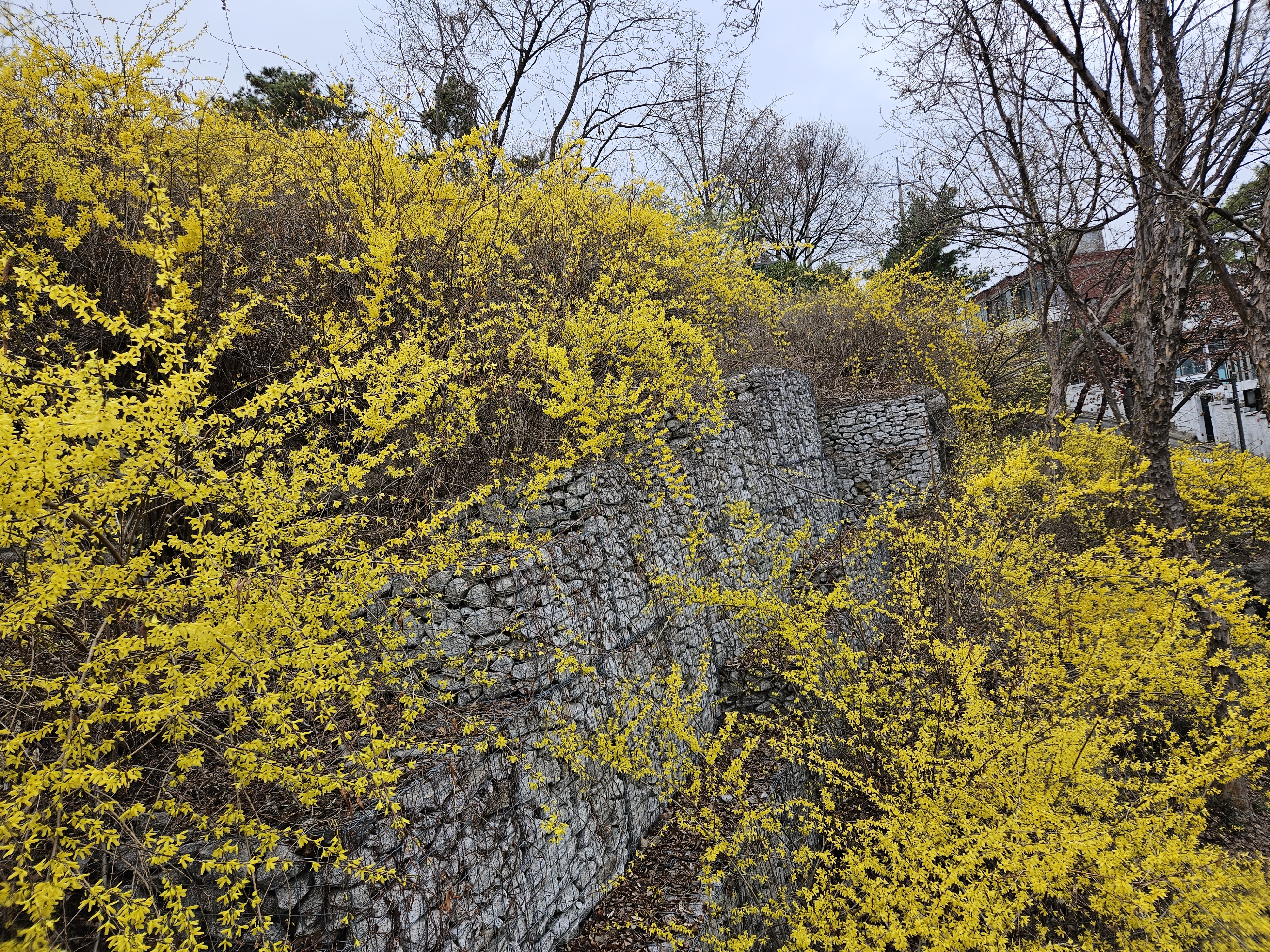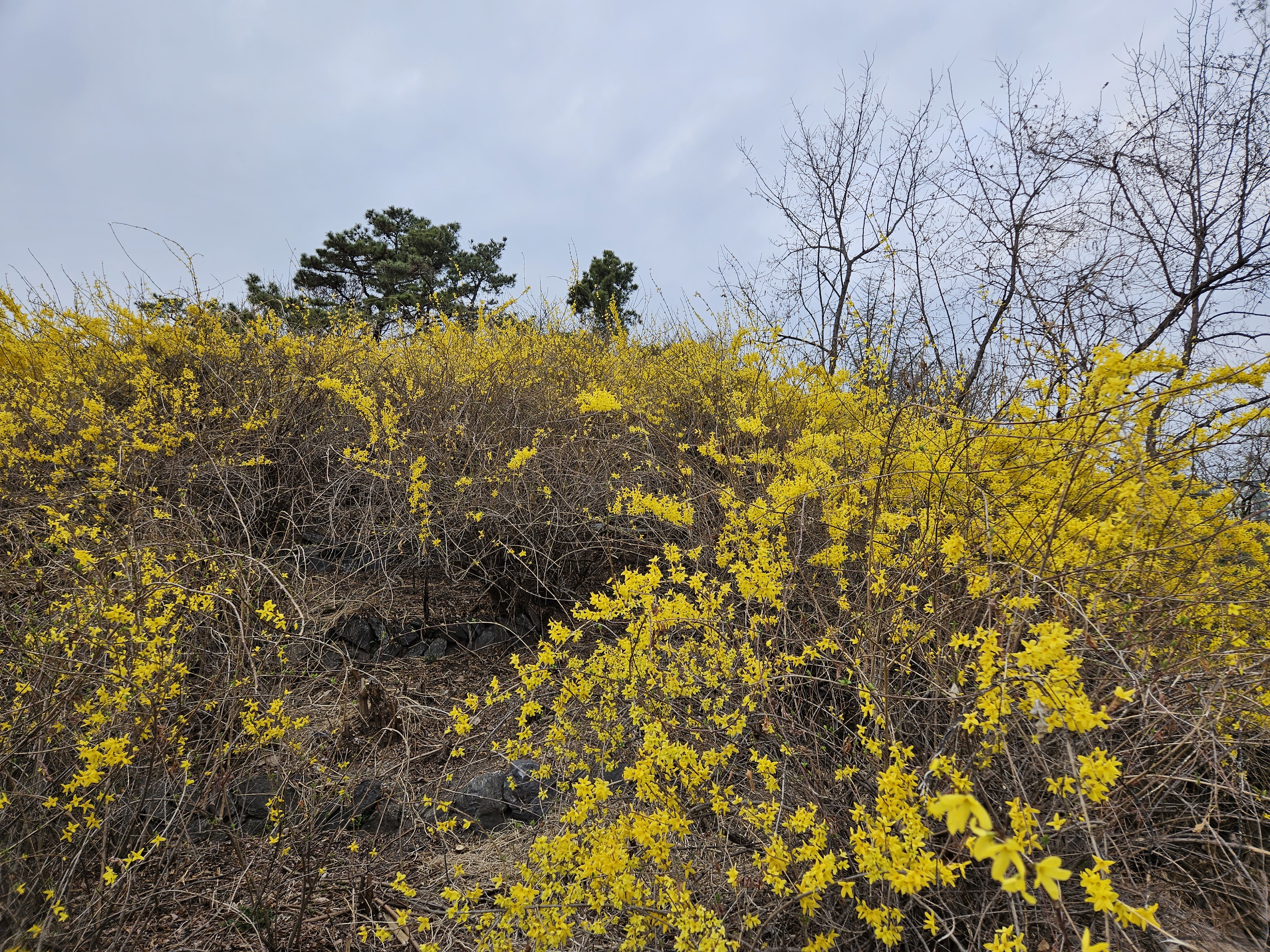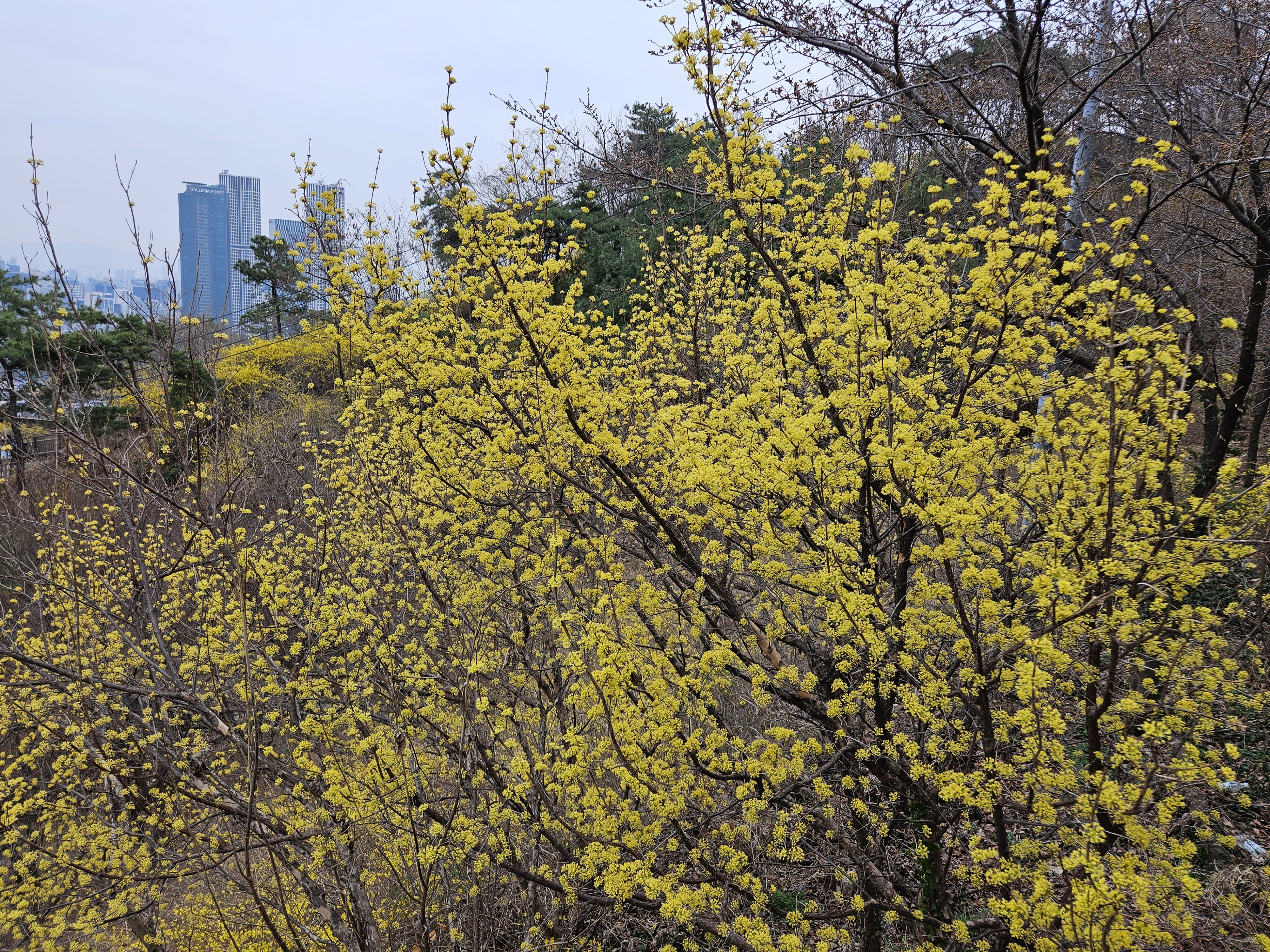 개발 이후 산자락 모래흙이 흘러내리는 걸 막기 위해 20만 그루의 개나리를 심은 것이 지금은 응봉산의 명물이 되었다고 하네요.