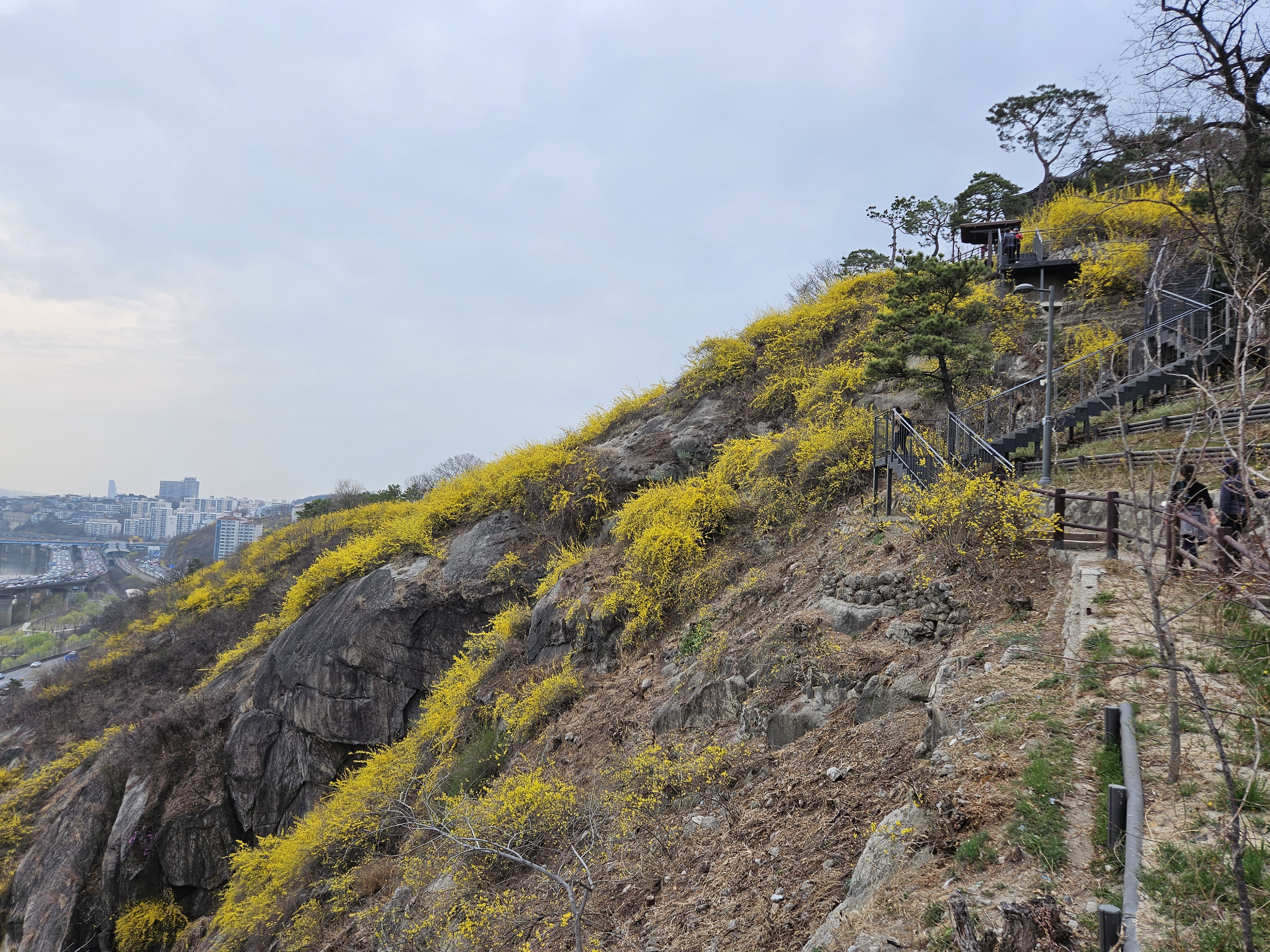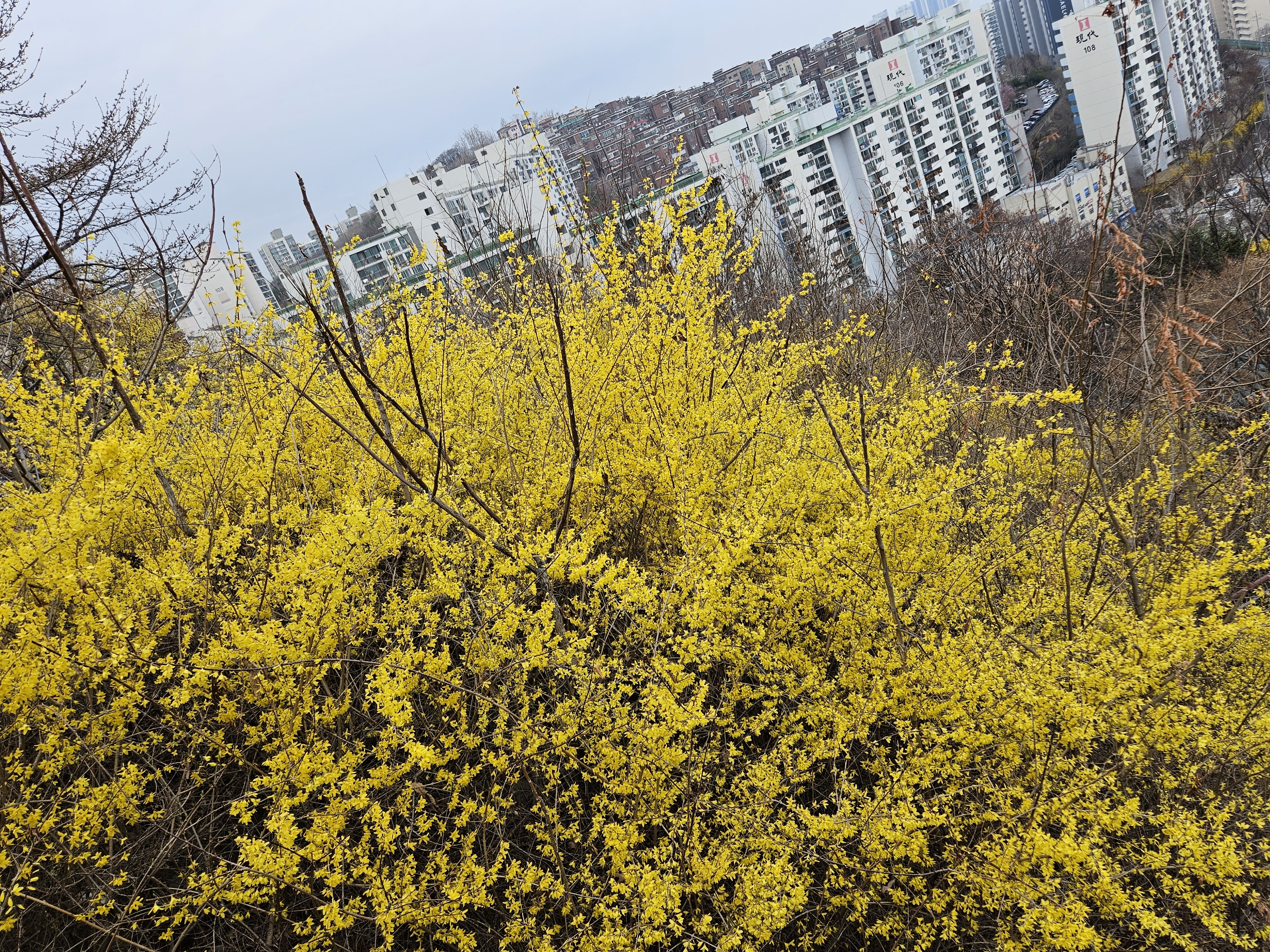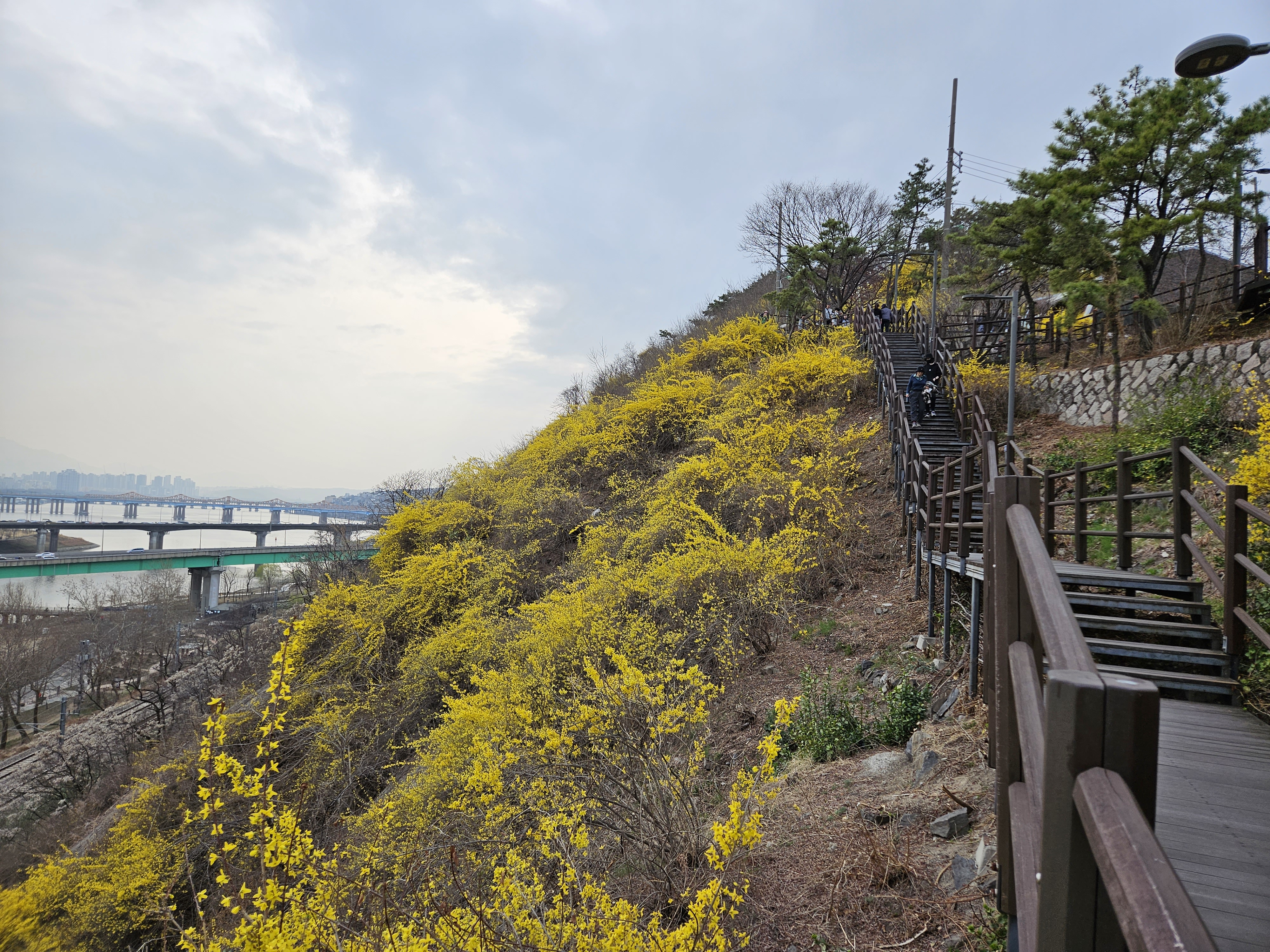 날씨가 좋아 오후에 한강으로 자전거를 타러 갔다가, 개나리꽃이 활짝 피어 노랗게 변한 응봉산에 다녀왔습니다.