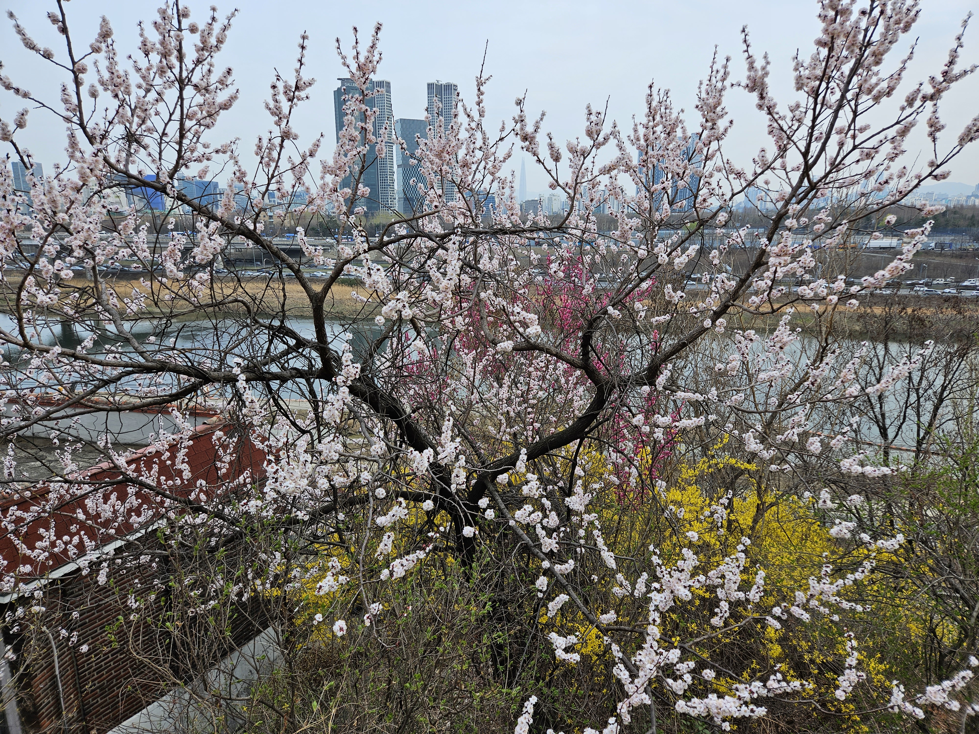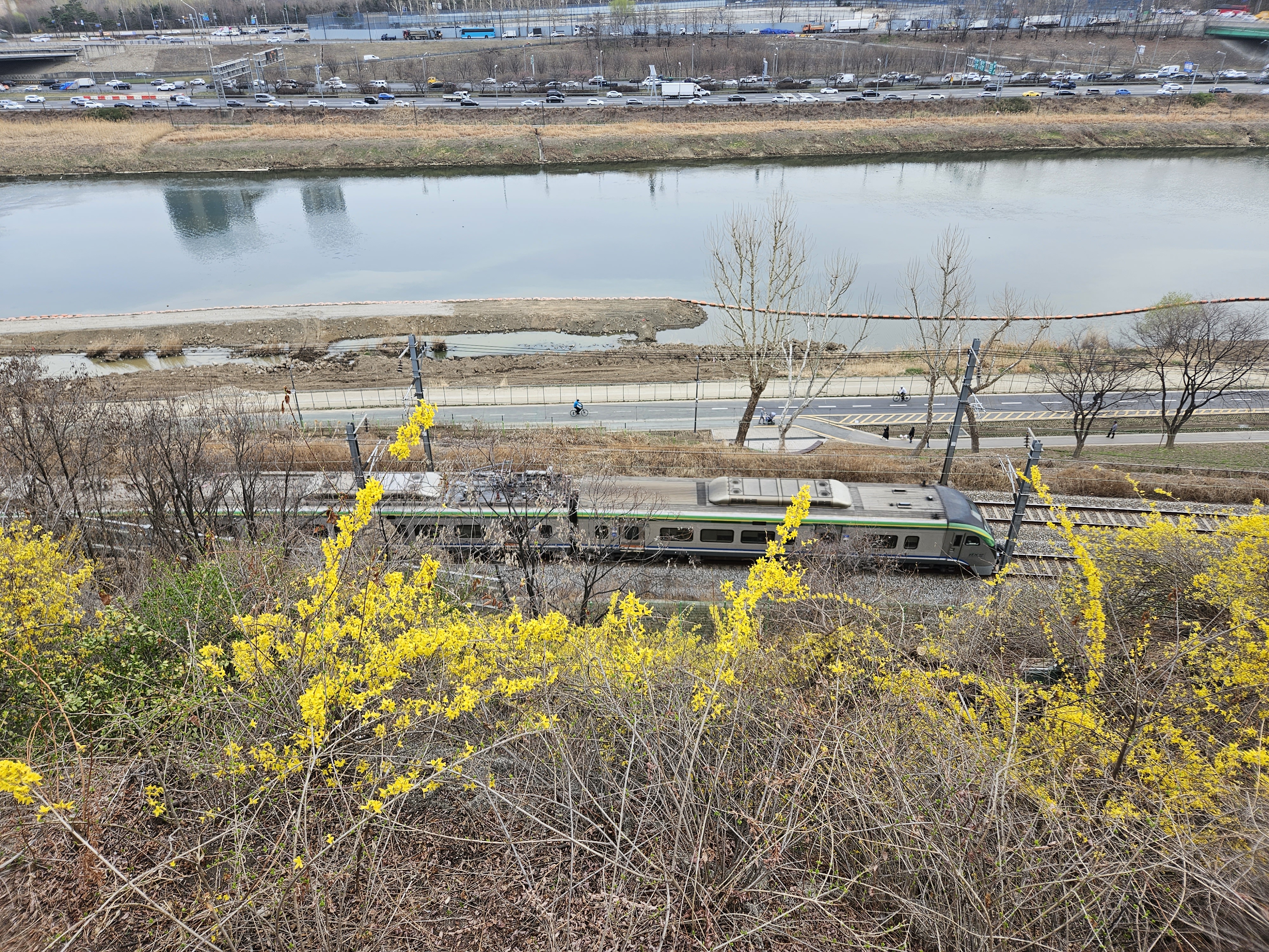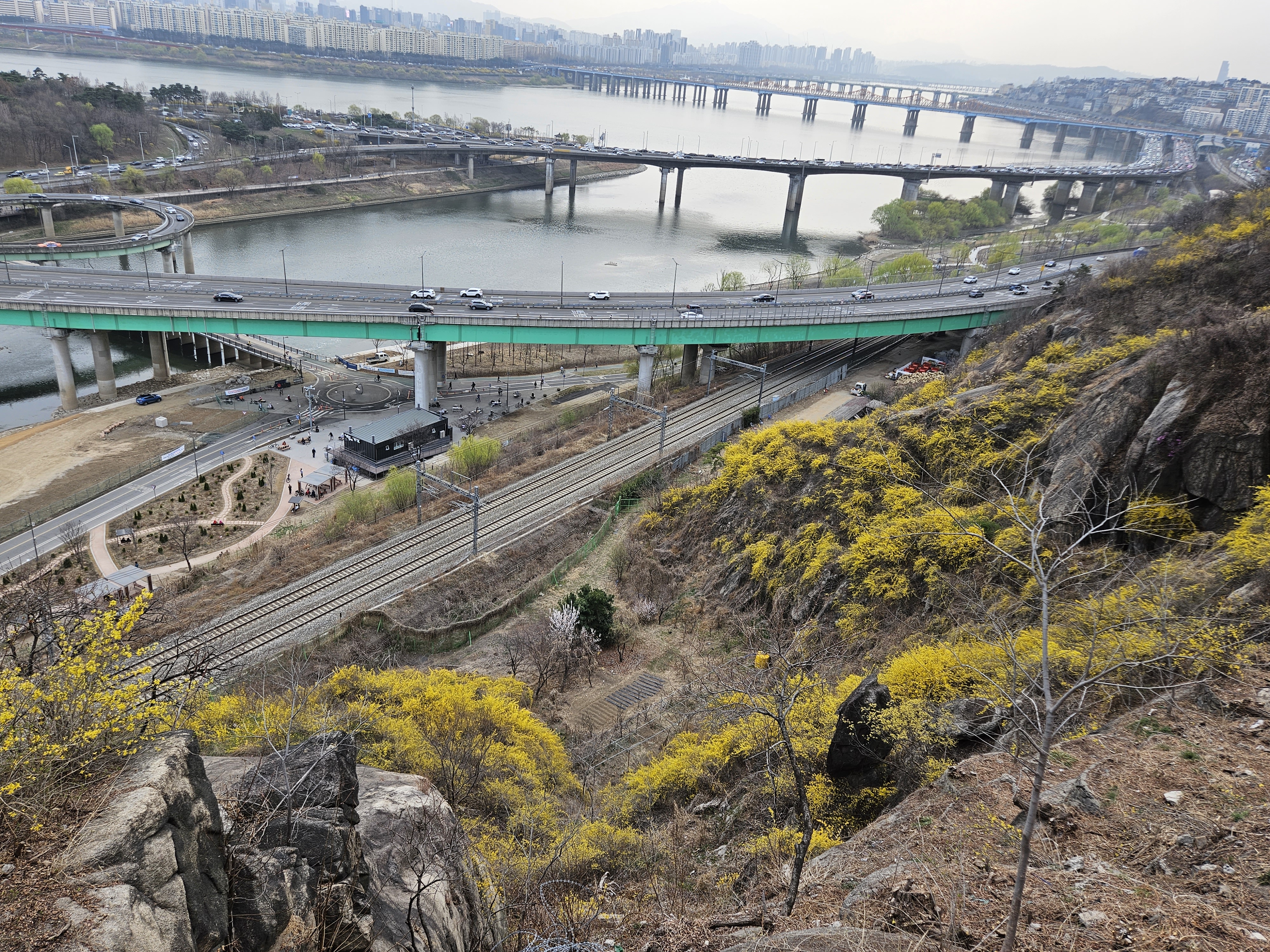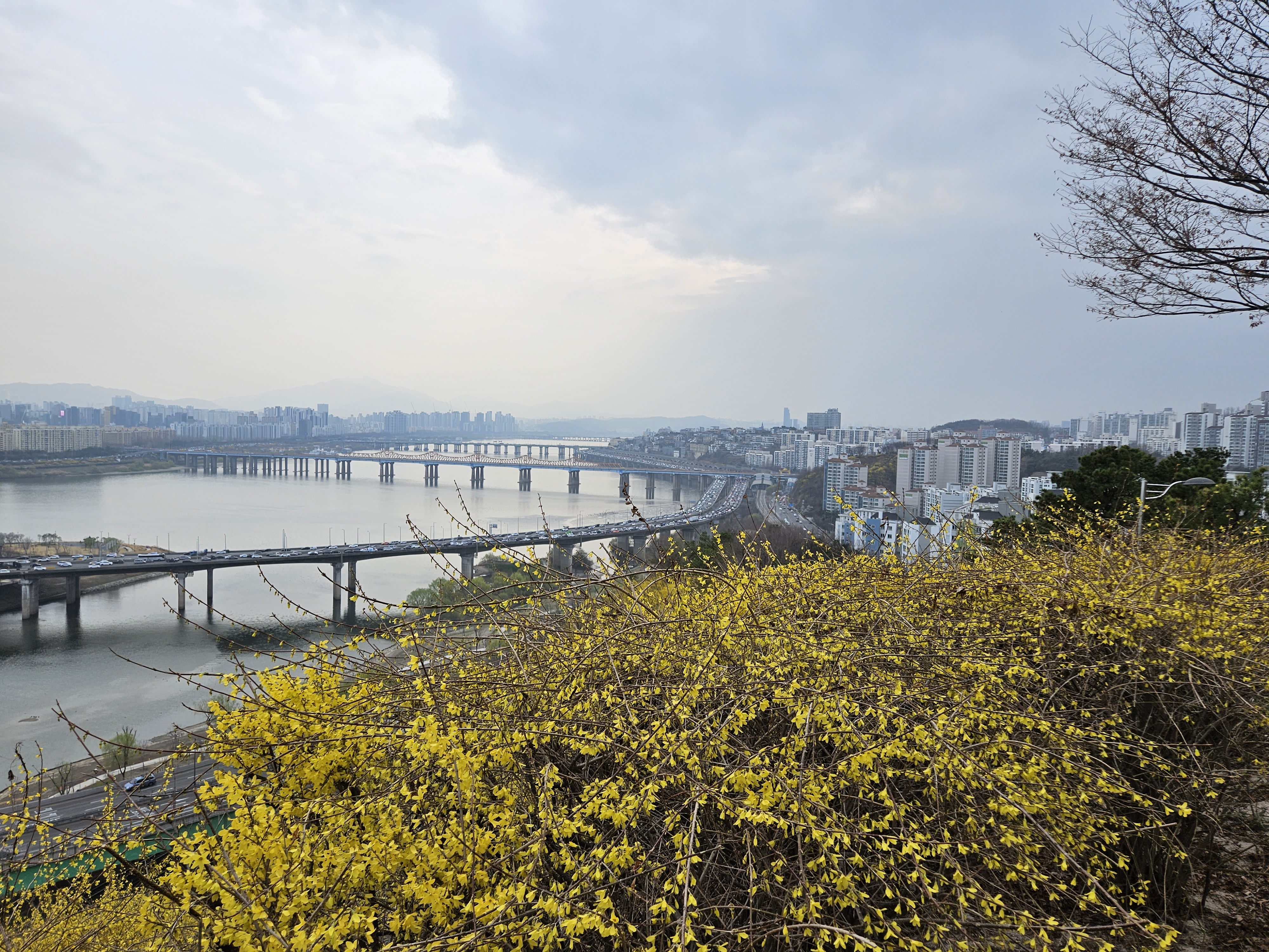 날씨가 좋아 오후에 한강으로 자전거를 타러 갔다가, 개나리꽃이 활짝 피어 노랗게 변한 응봉산에 다녀왔습니다.