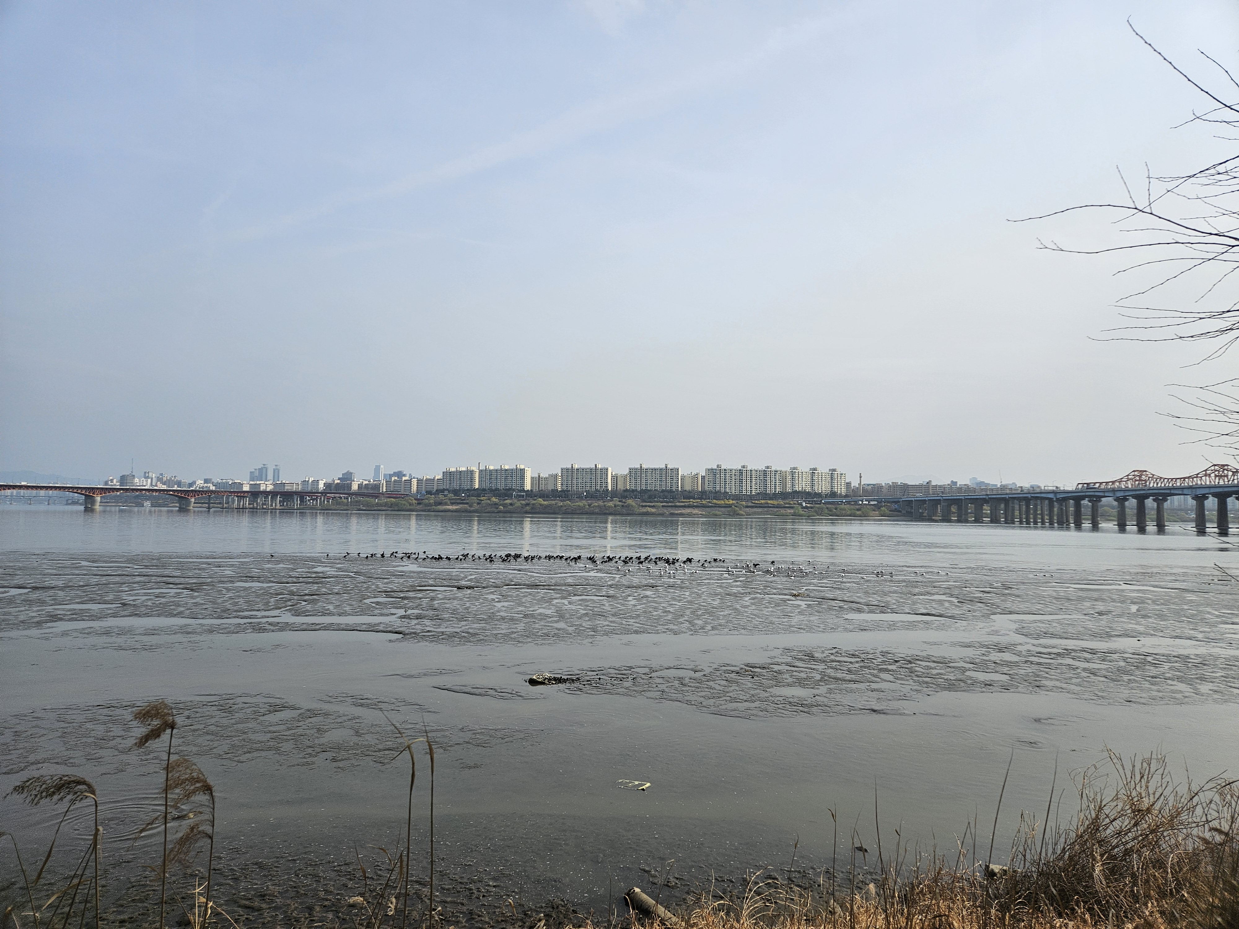 자전거를 타고 동호대교를 지나가니 한강에 새떼들이 올망졸망 앉아 있어서 찍어 봤습니다.