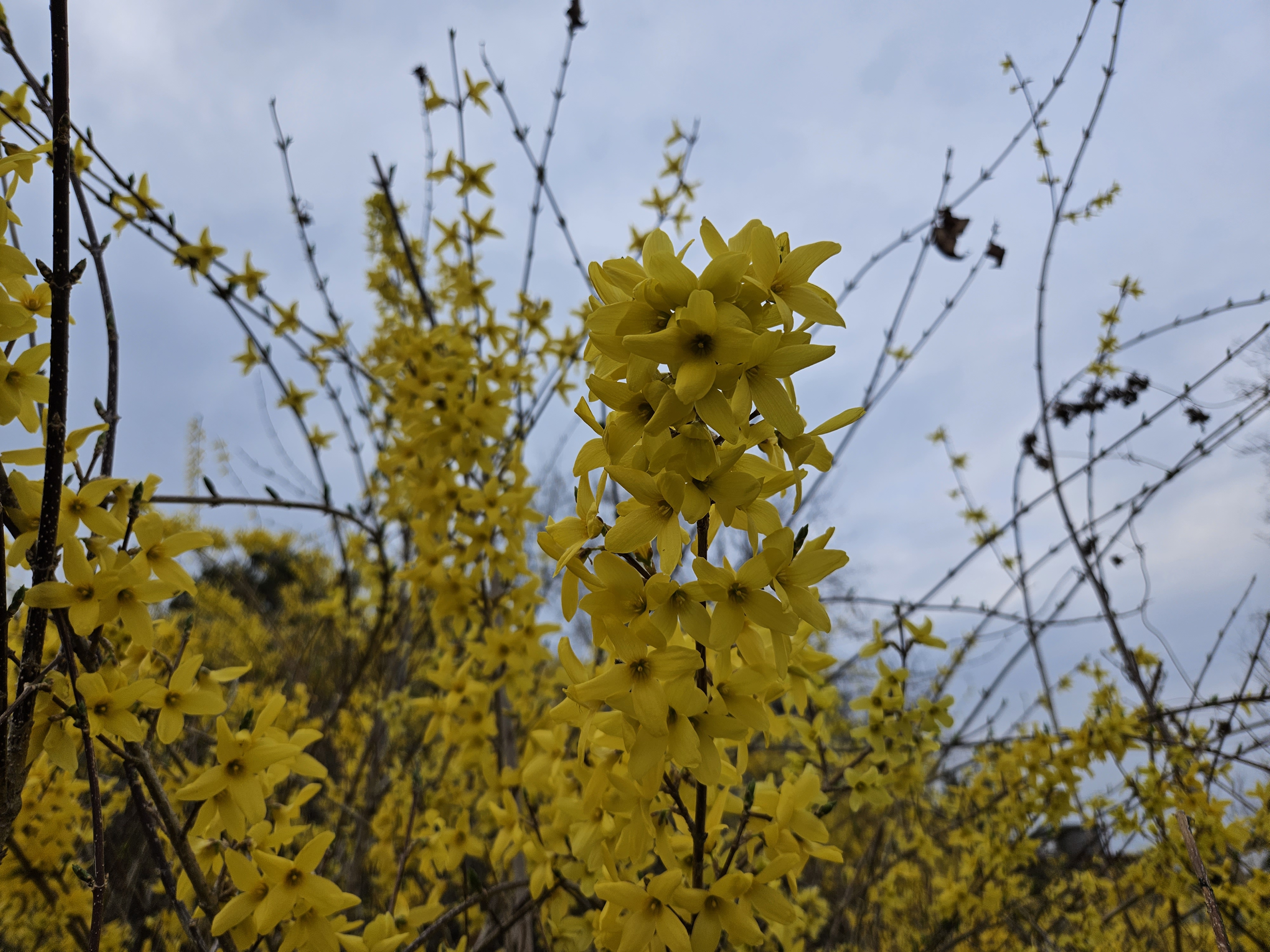 개나리와 산수요가 함께 피어 있는 모습입니다.