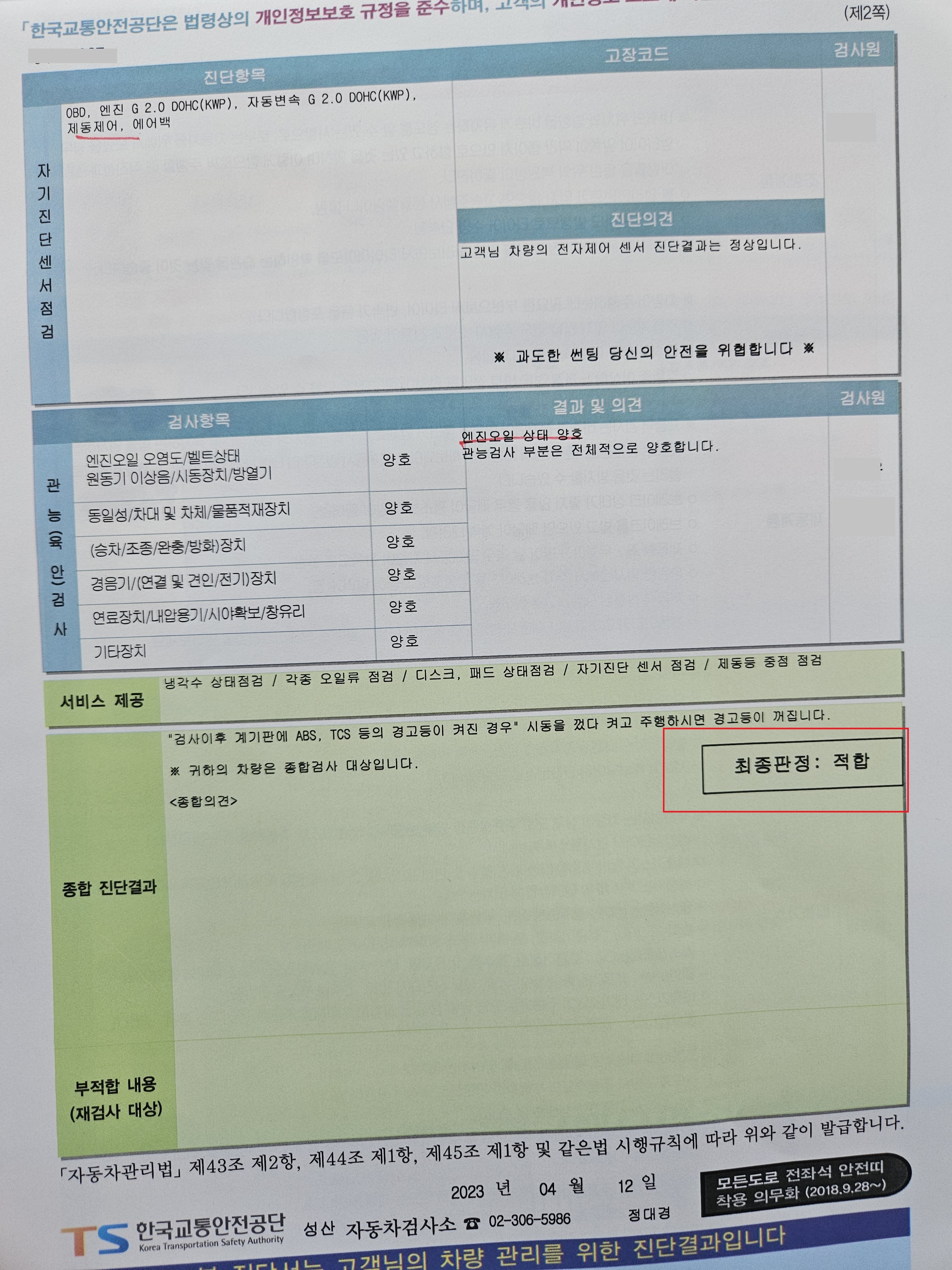 검사 결과 조향계통, 제동계통, 등화장치, 배출가스, 계기계통, 자기진단 센서점검, 관능검사 등은 모두 양호 판정.