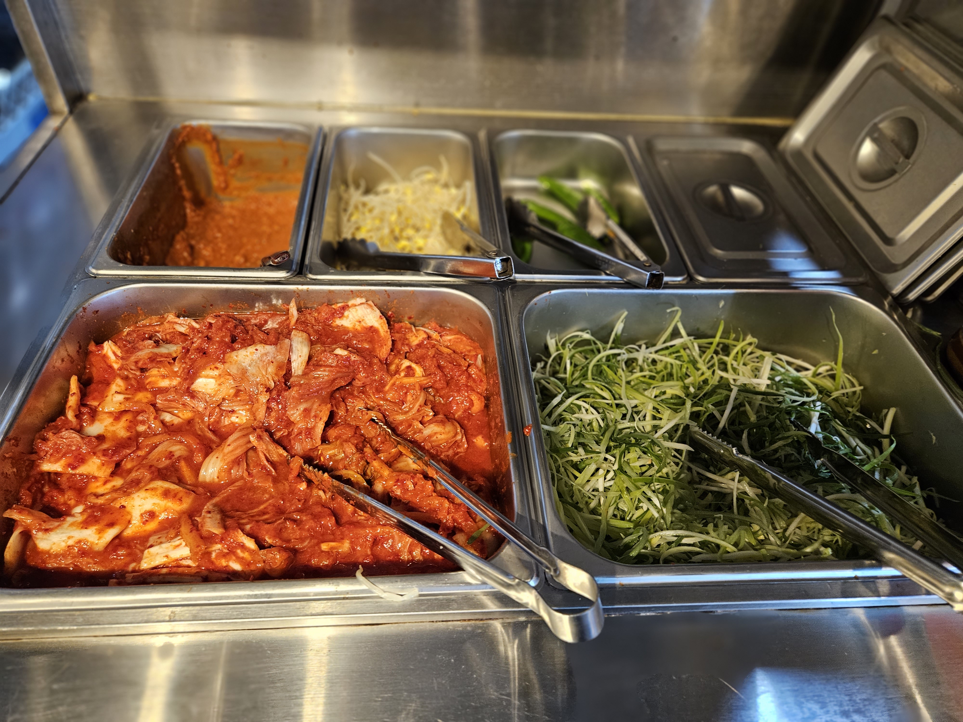 직접 셀프코노에서 담아 온 상추, 파절임, 고추, 김치, 콩나물 등