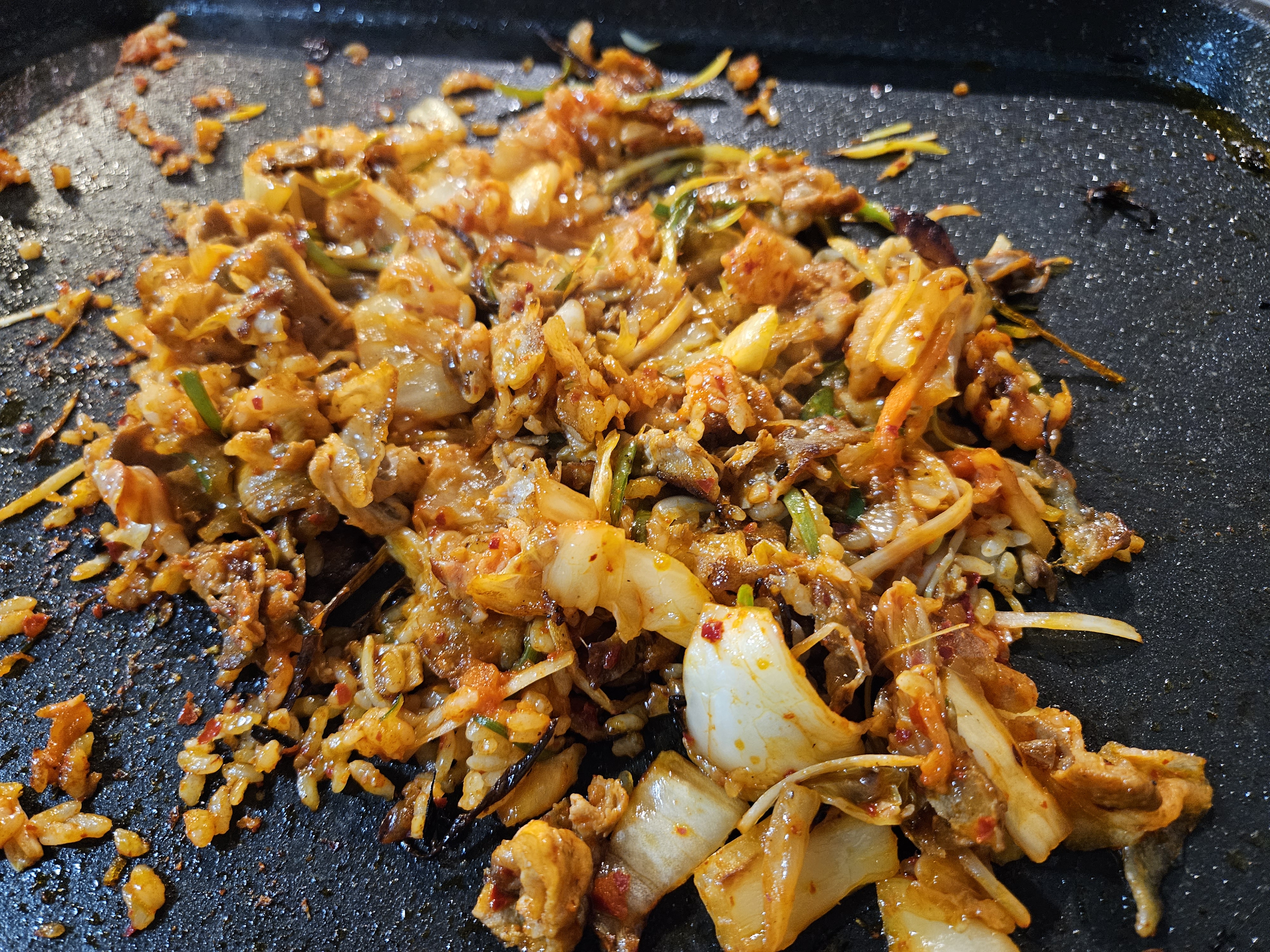 대패삼겹살을 먹은 후 불판에 남은 반찬들을 이용해 참기름을 넣고 볶아 먹으면 됩니다.