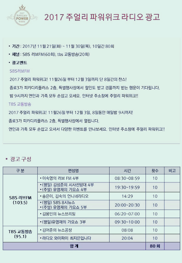 주얼리 페스타, 주얼리 파워위크를 알리기 위해 SBS러브 FM(103.5MHz)과 TBS 교통방송(951MHz) 라디오에 80회의 광고방송이 나갑니다.