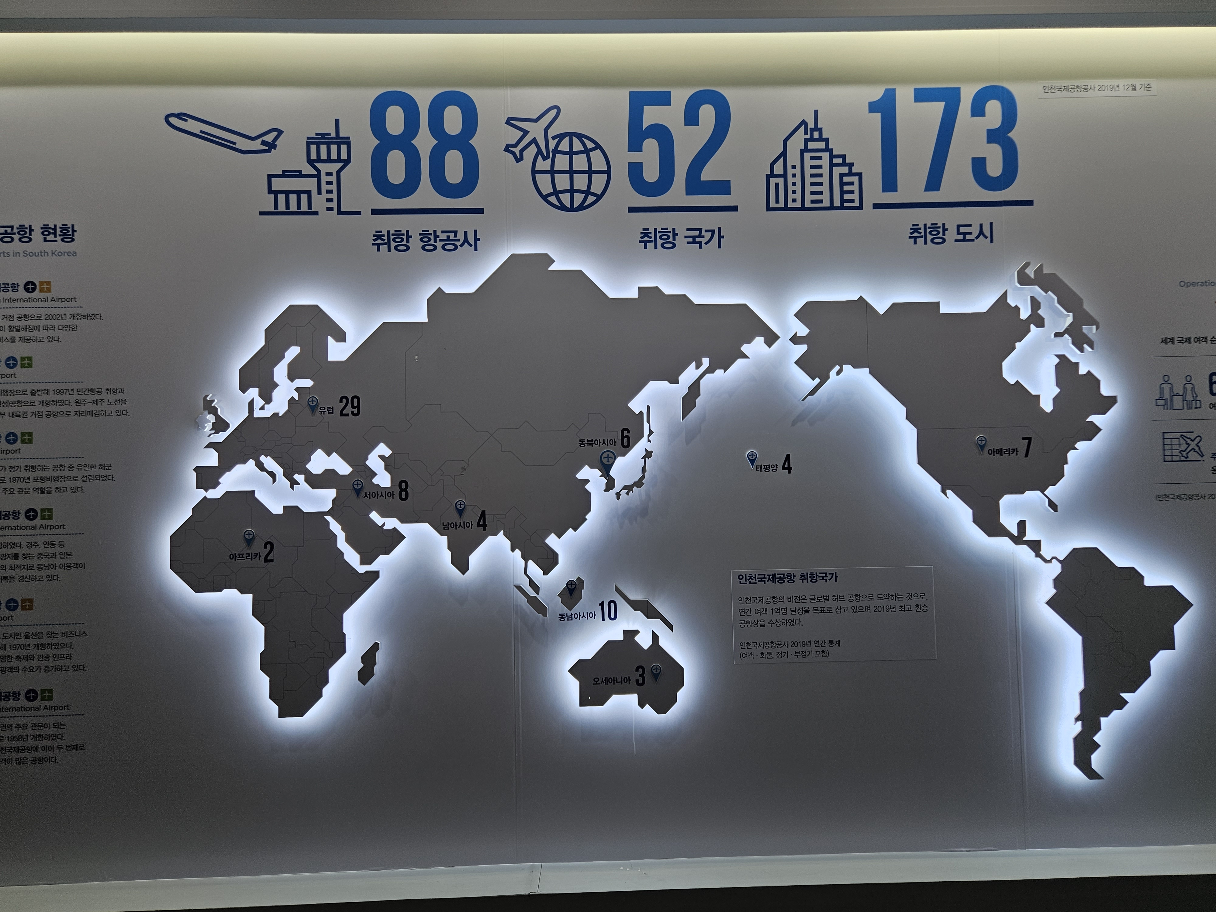 인천국제공항의 취항 현황은 88개의 취항 항공사, 52개 국가 취항, 173개 도시 취항