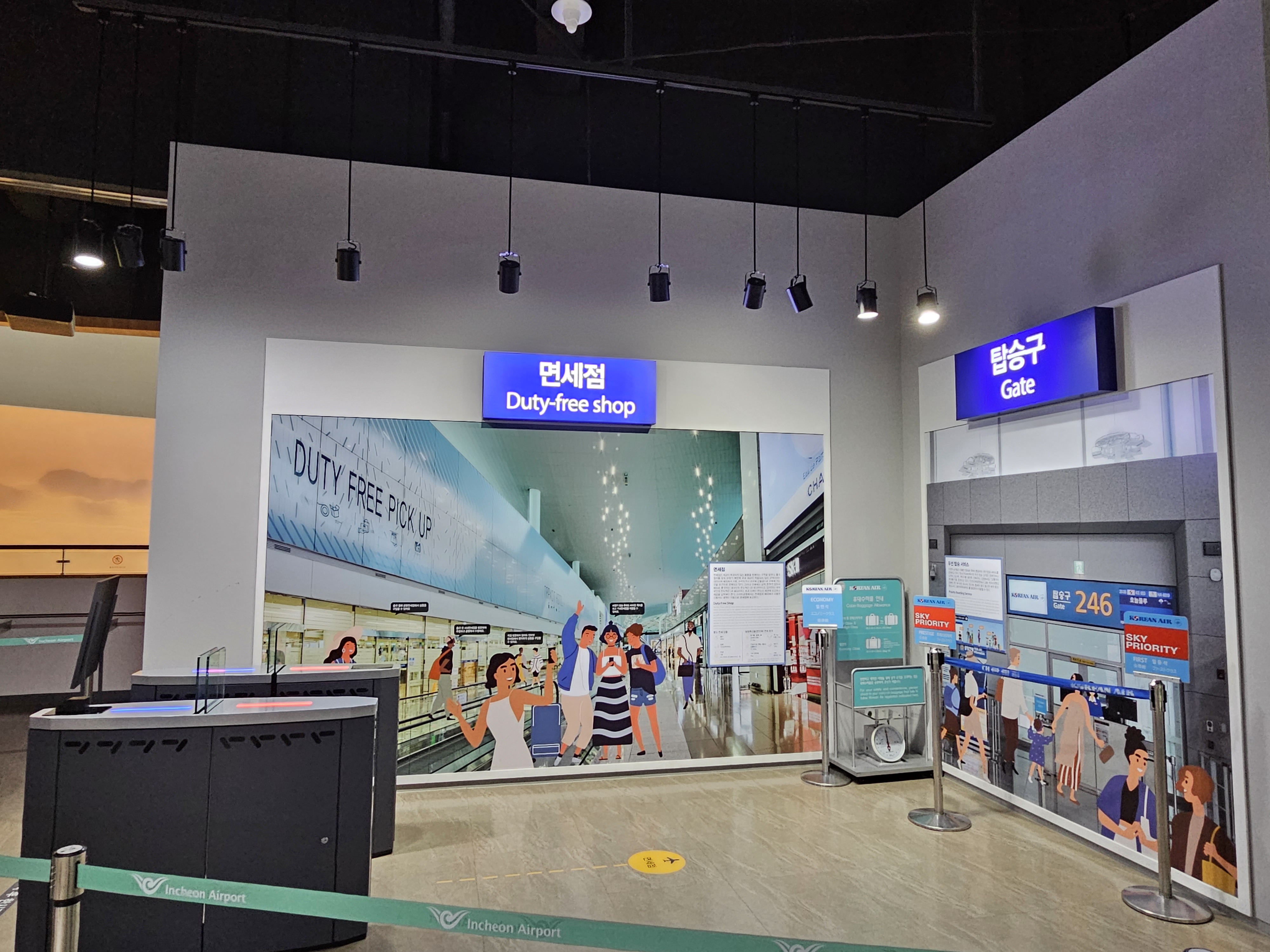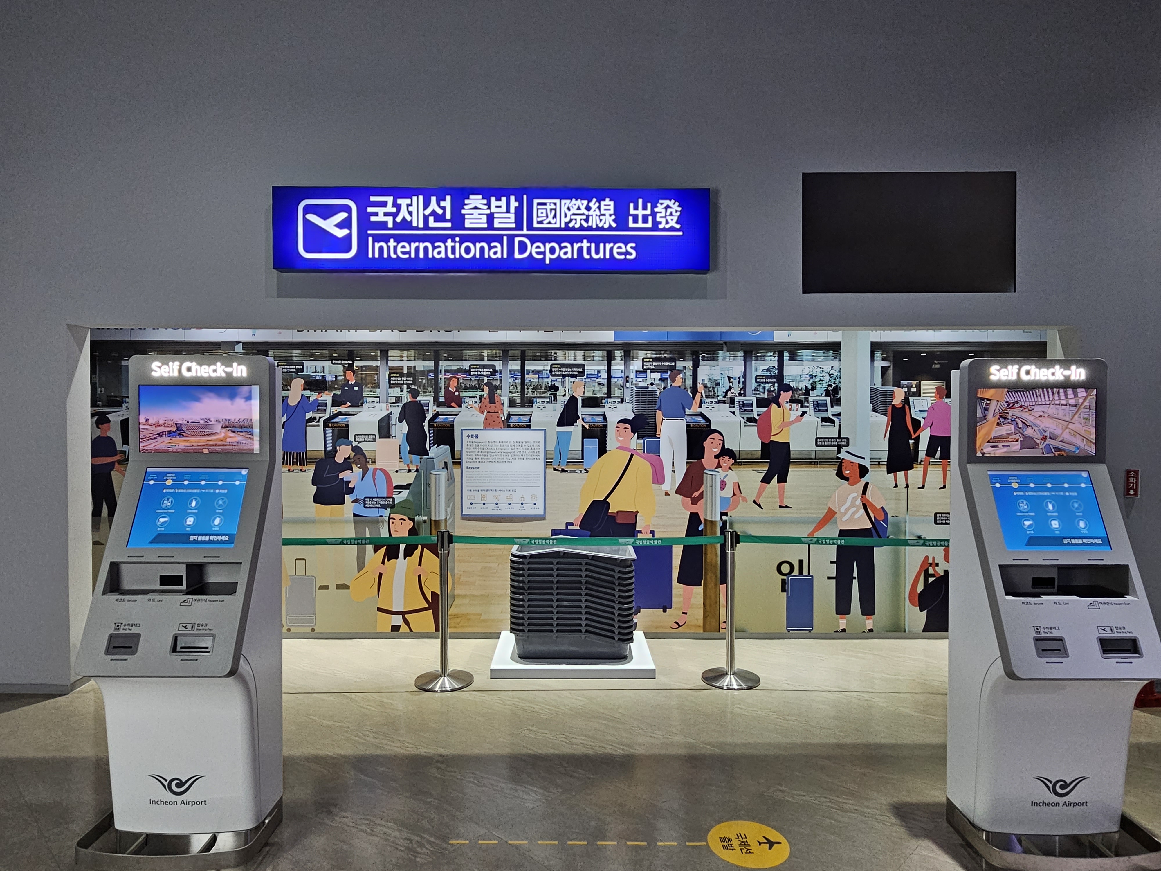 국제선 출발 셀프 체크-인과 면세점 및 탑승구, 수하물처리시스템 모습