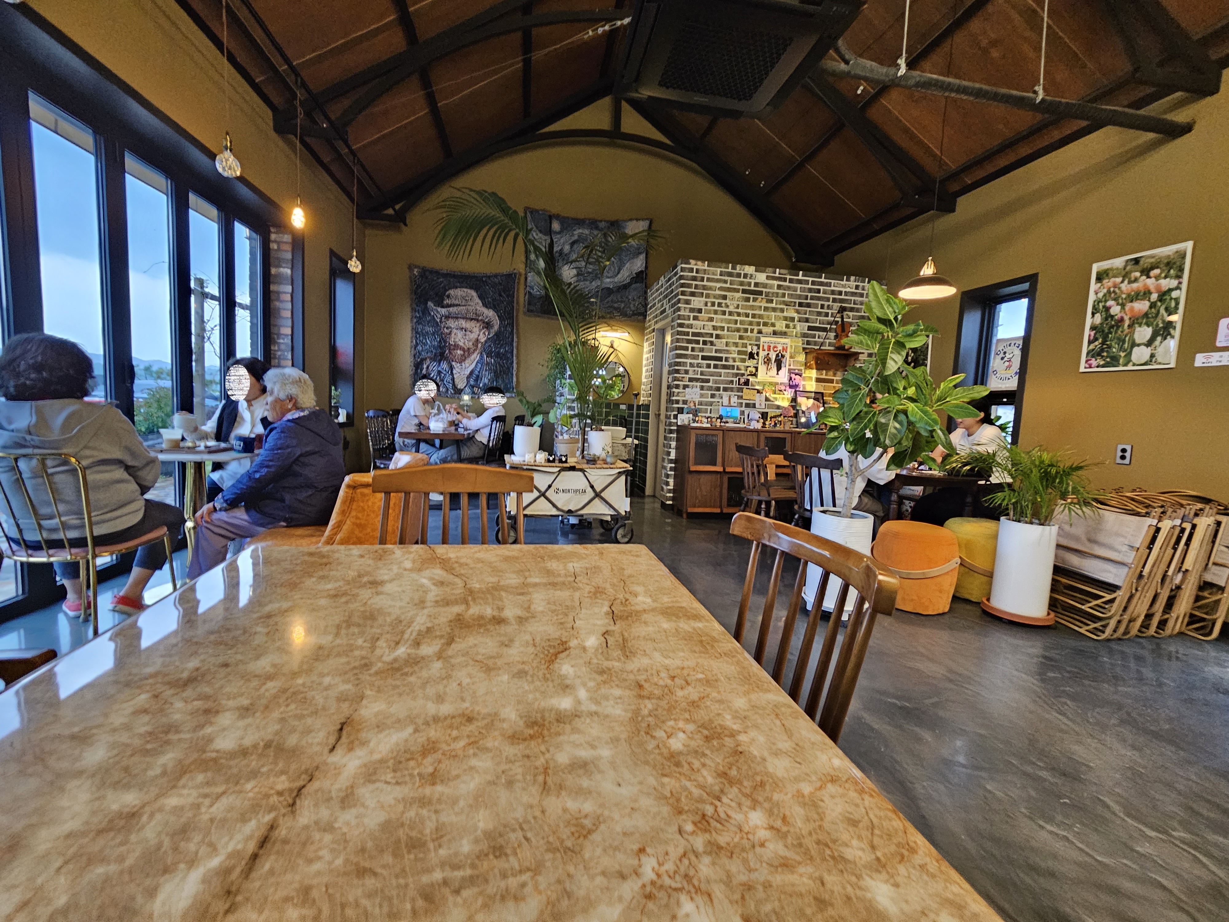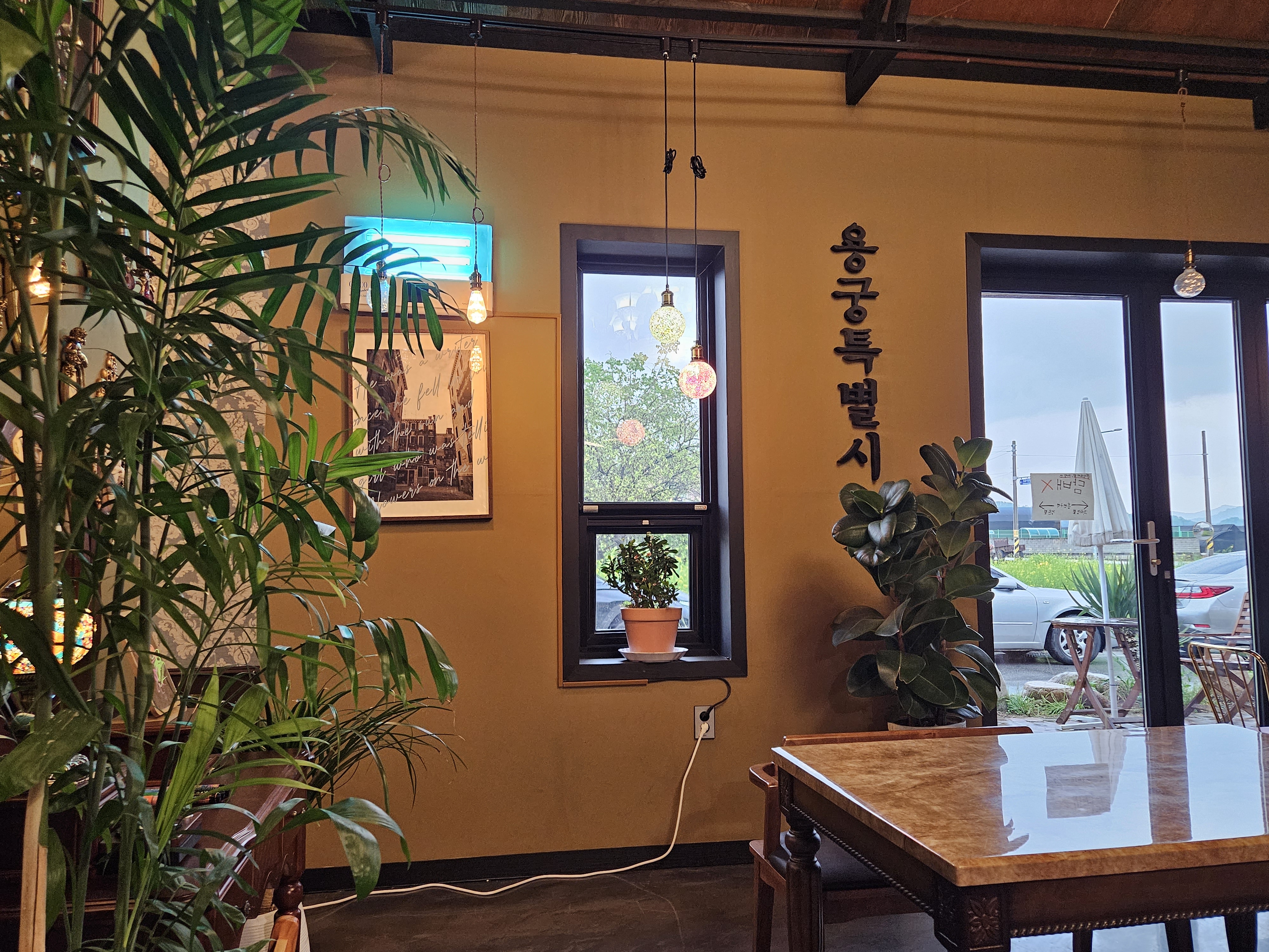 곳곳에 명화 액자와 화분이 있고, 분위기 있게 꾸며져 있어 감성이 가득한 모습이며, 시골답지 않은 현대적인 감각의 인테리어가 돋보이는 모습입니다.