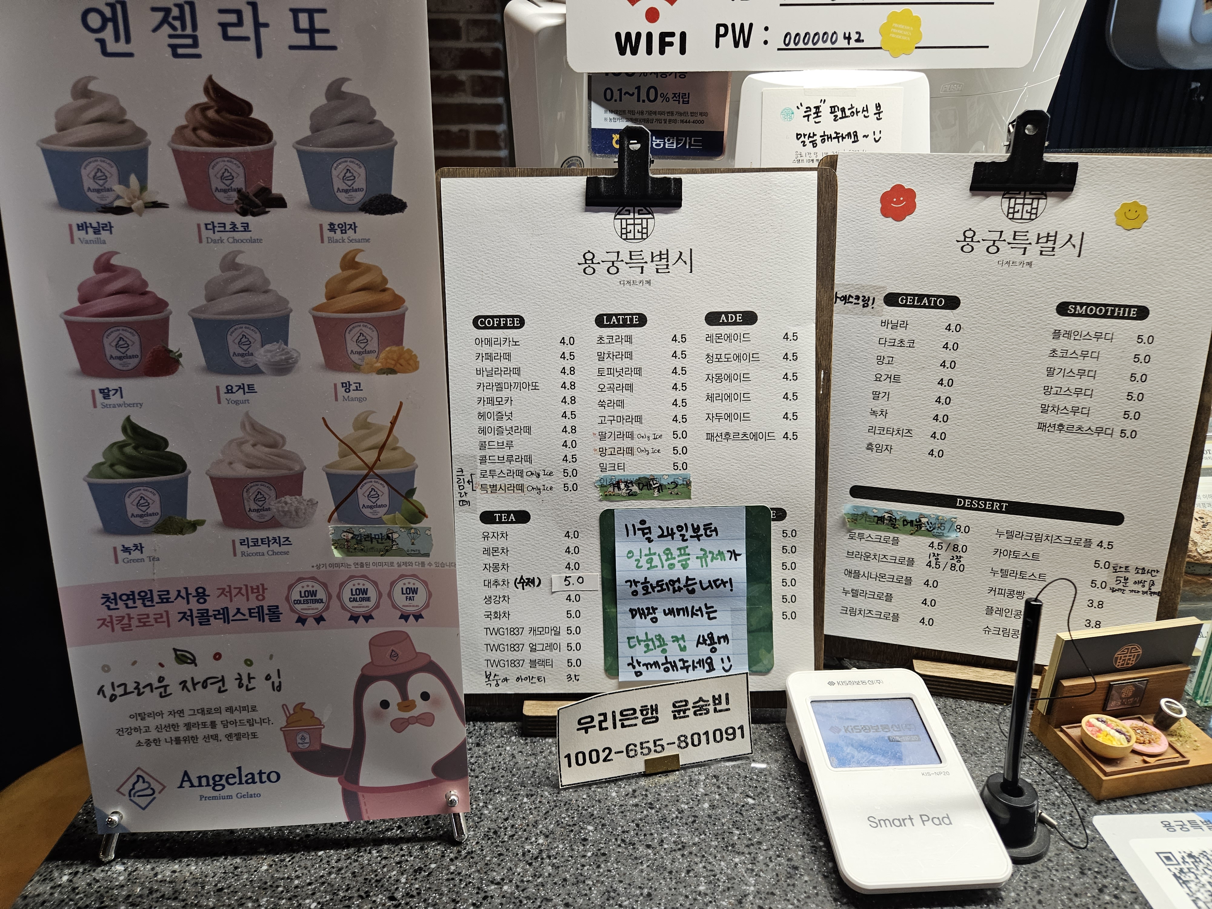 라떼종류와 에이드 등이 있고, 엔젤라토 아이스크림 종류가 다양하고요.