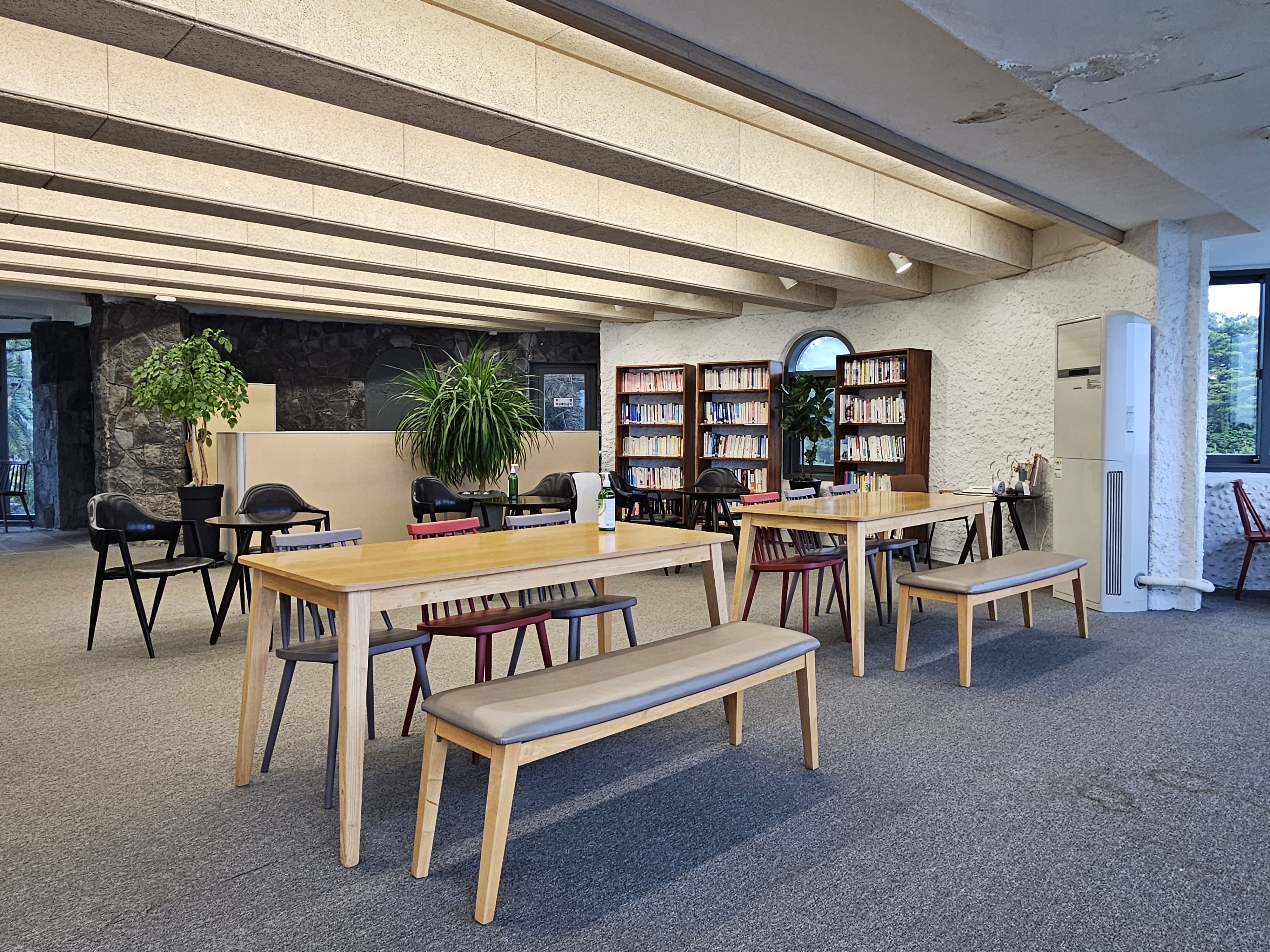 900여권의 서적과 넓은 홀에 책을 읽으며 휴식할 수 있는 테이블이 마련되어 있습니다.