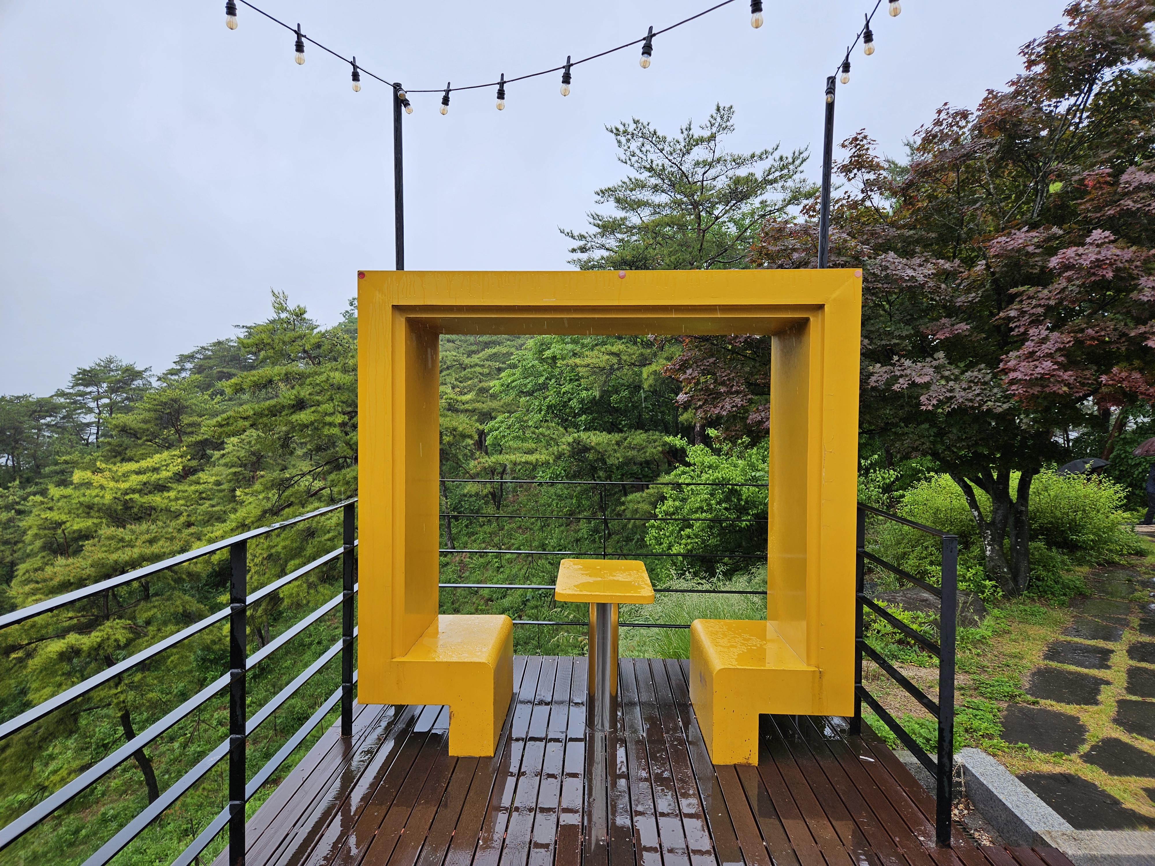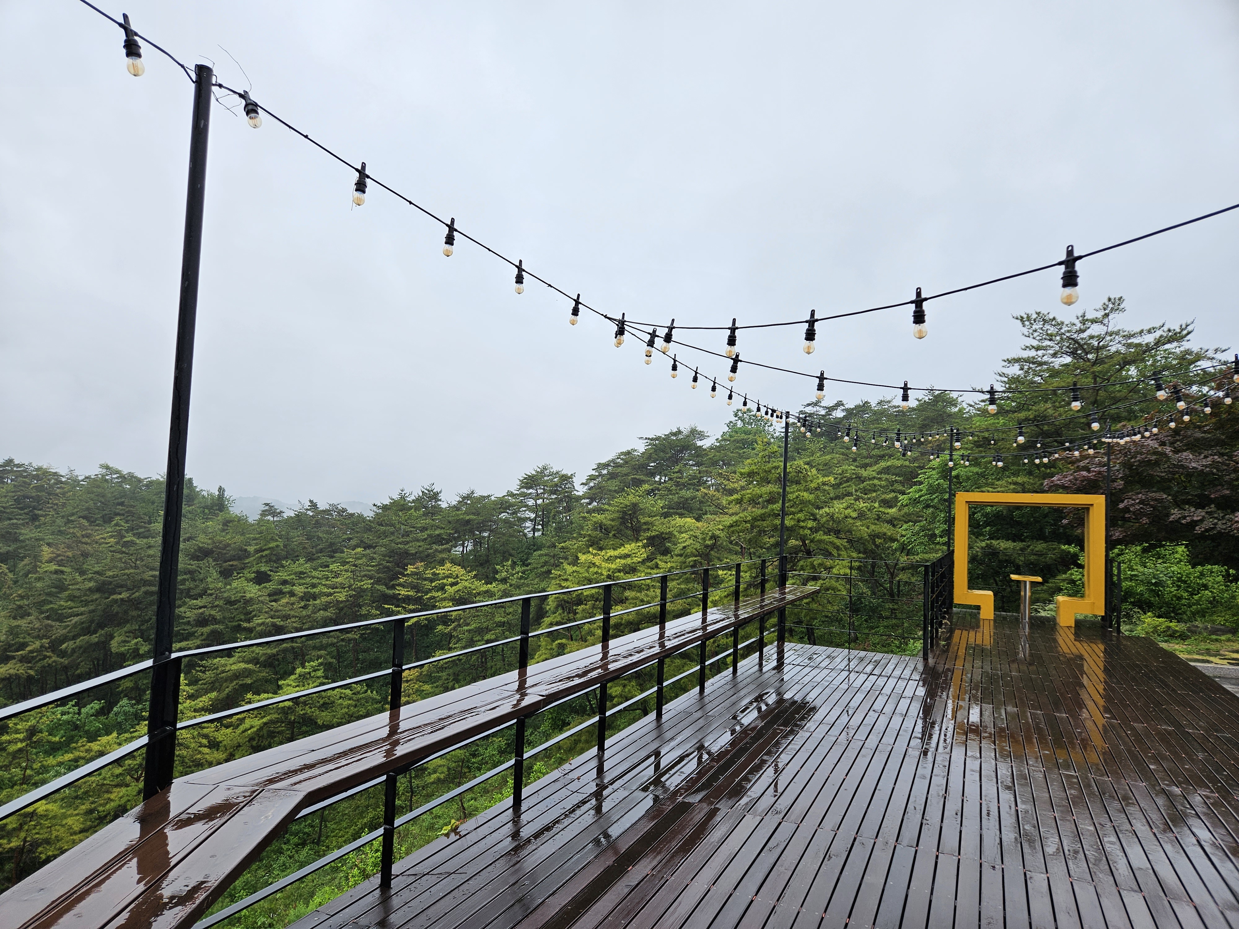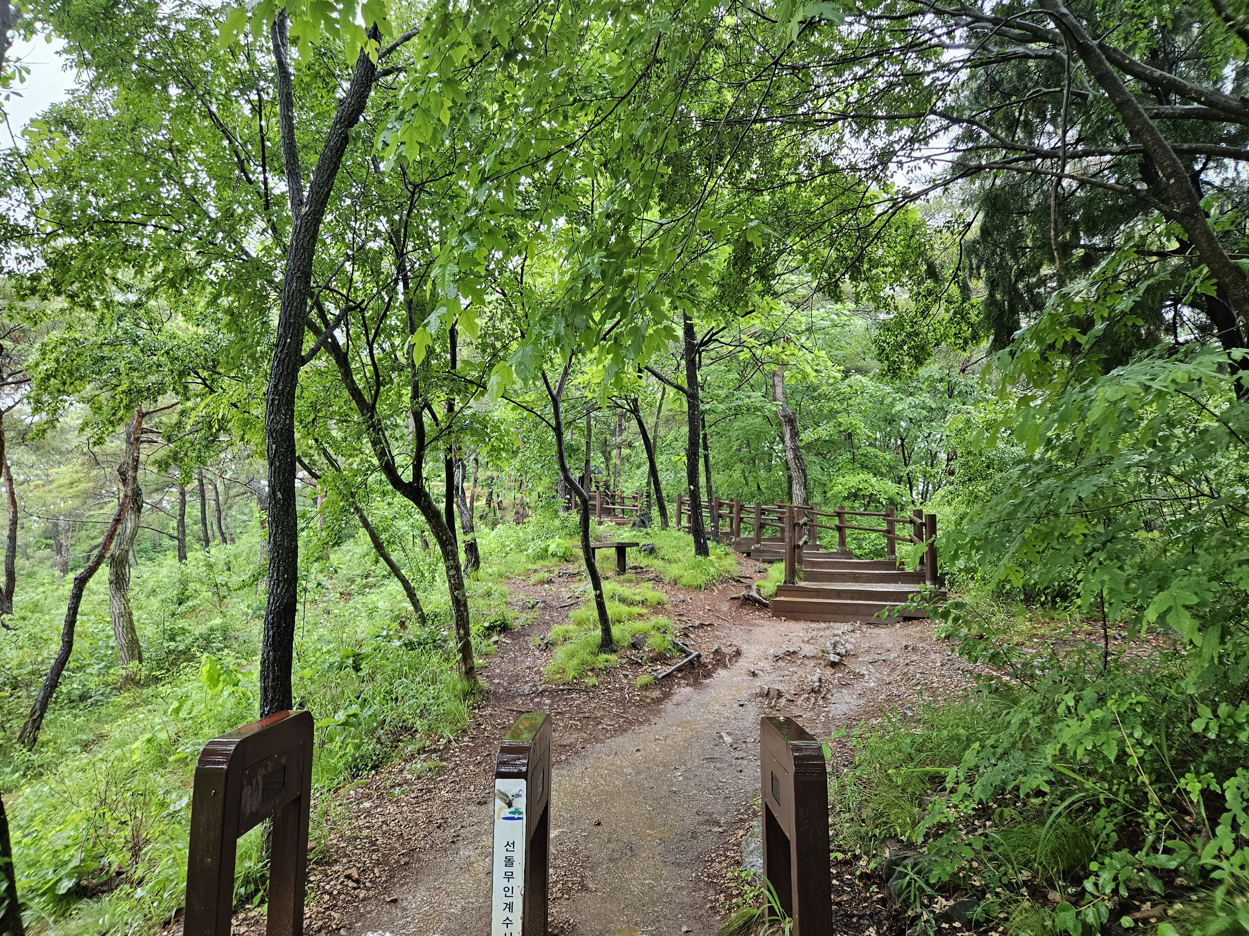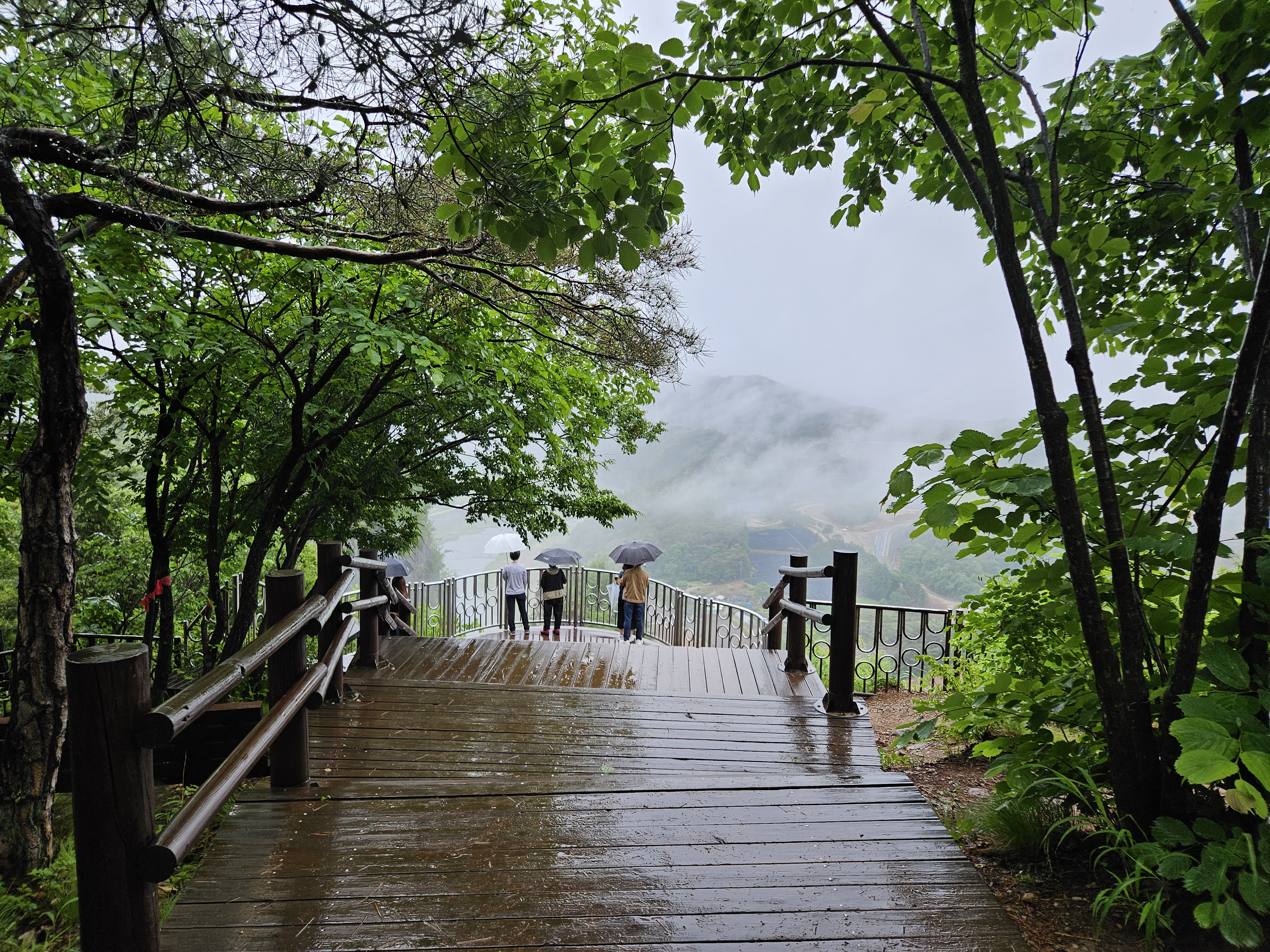 비가 와서 나무데크가 젖어 있고, 주변이 무척 싱그러운 풍경입니다.