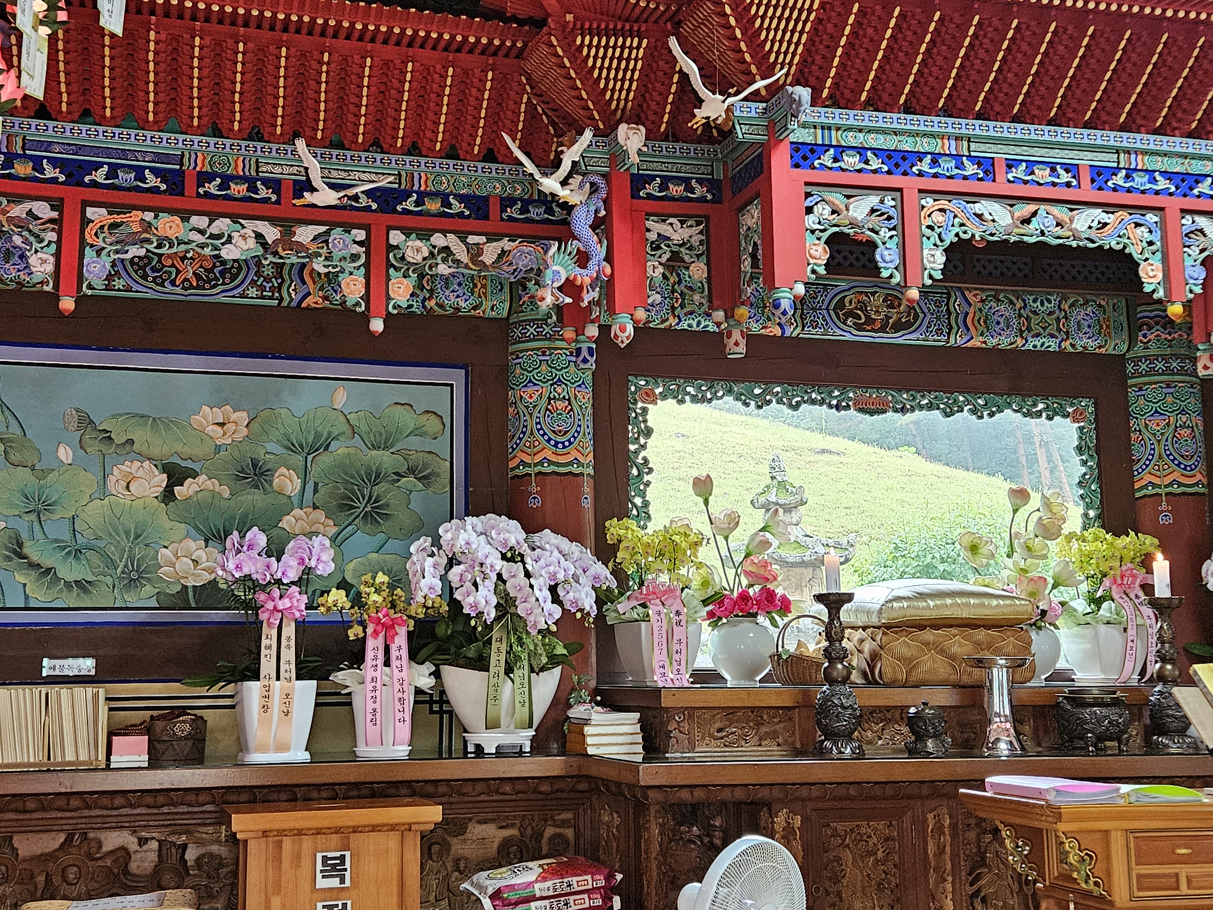 때문에 적멸보궁 안에는 부처의 삼존불이 없고 뒤쪽으로 뻥 뚫린 창만 하나 있는 특징을 가지고 있습니다.
