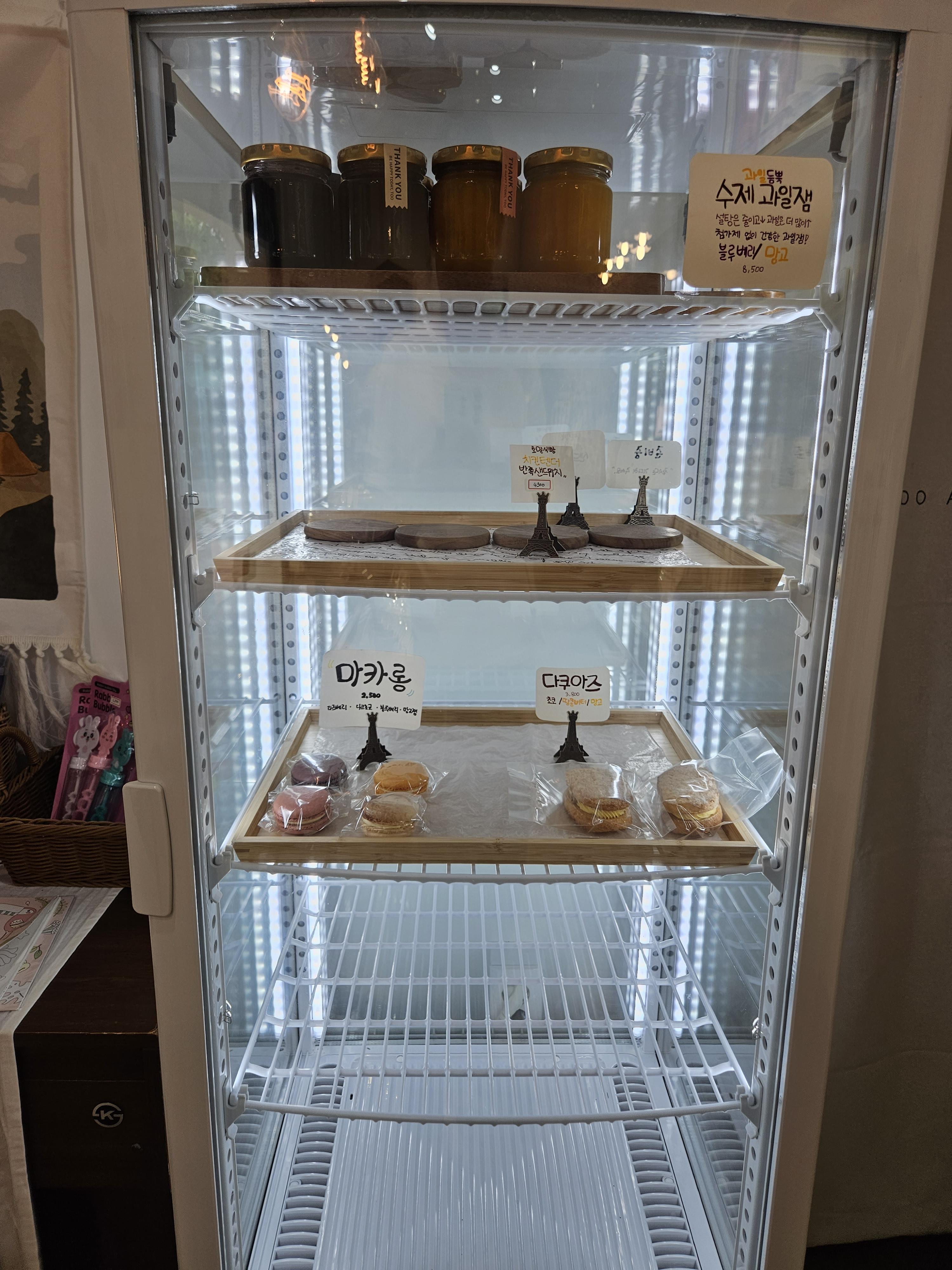 냉장고 안에는 수제과일잼(블루베리/망고, 8,500원), 호밀식빵(4,500원), 마카롱(라즈베리/가크초코/블루베리/망고잼, 2,500원), 다쿠아즈(초코/땅콩버터/망고.. 3,800원)