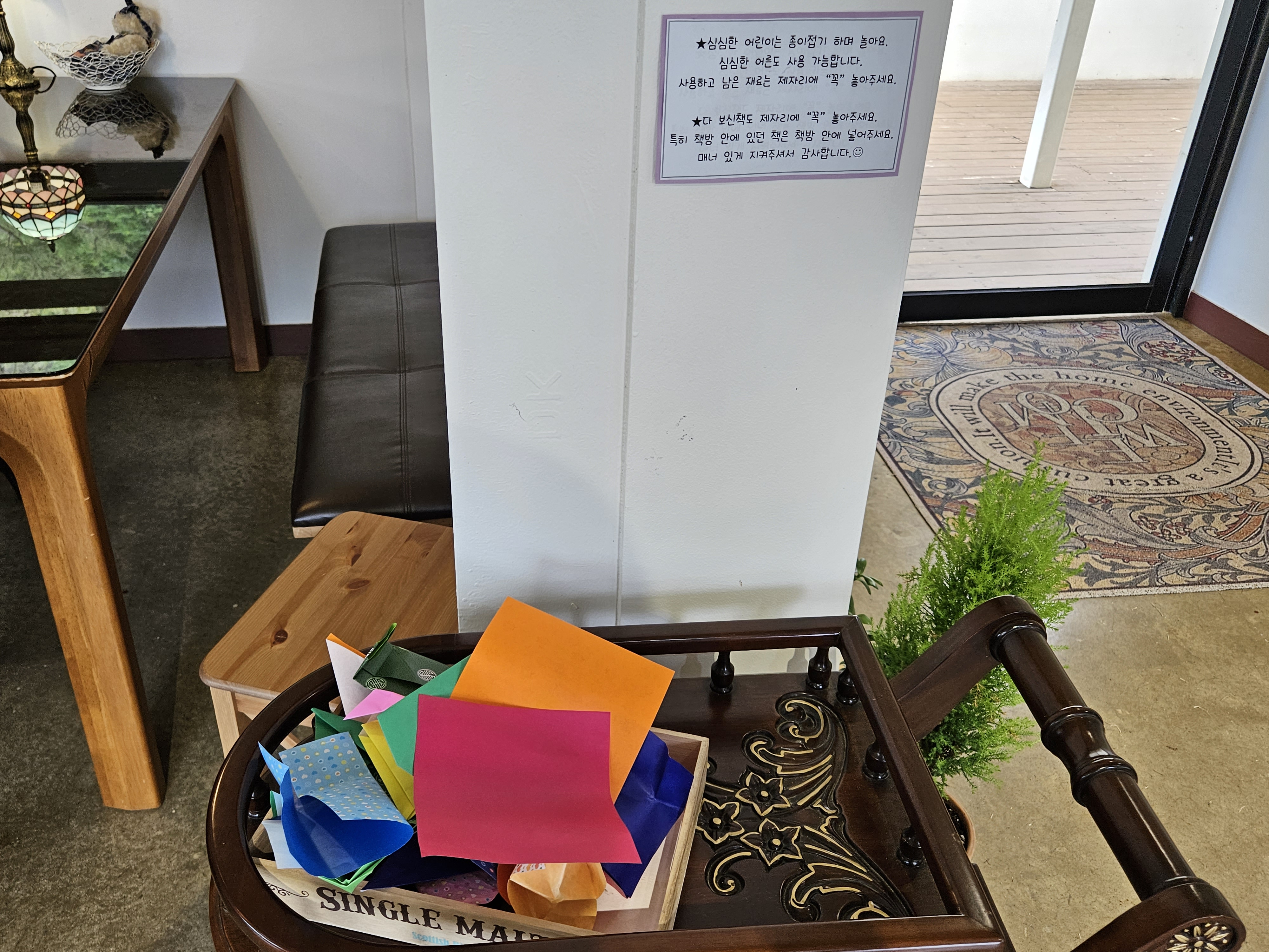주문하는 곳 건물 앞에 있는 2층 건물의 1층으로 들어오니 심심한 아이들을 위해 종이접기를 할 수 있게 준비되어 있네요.