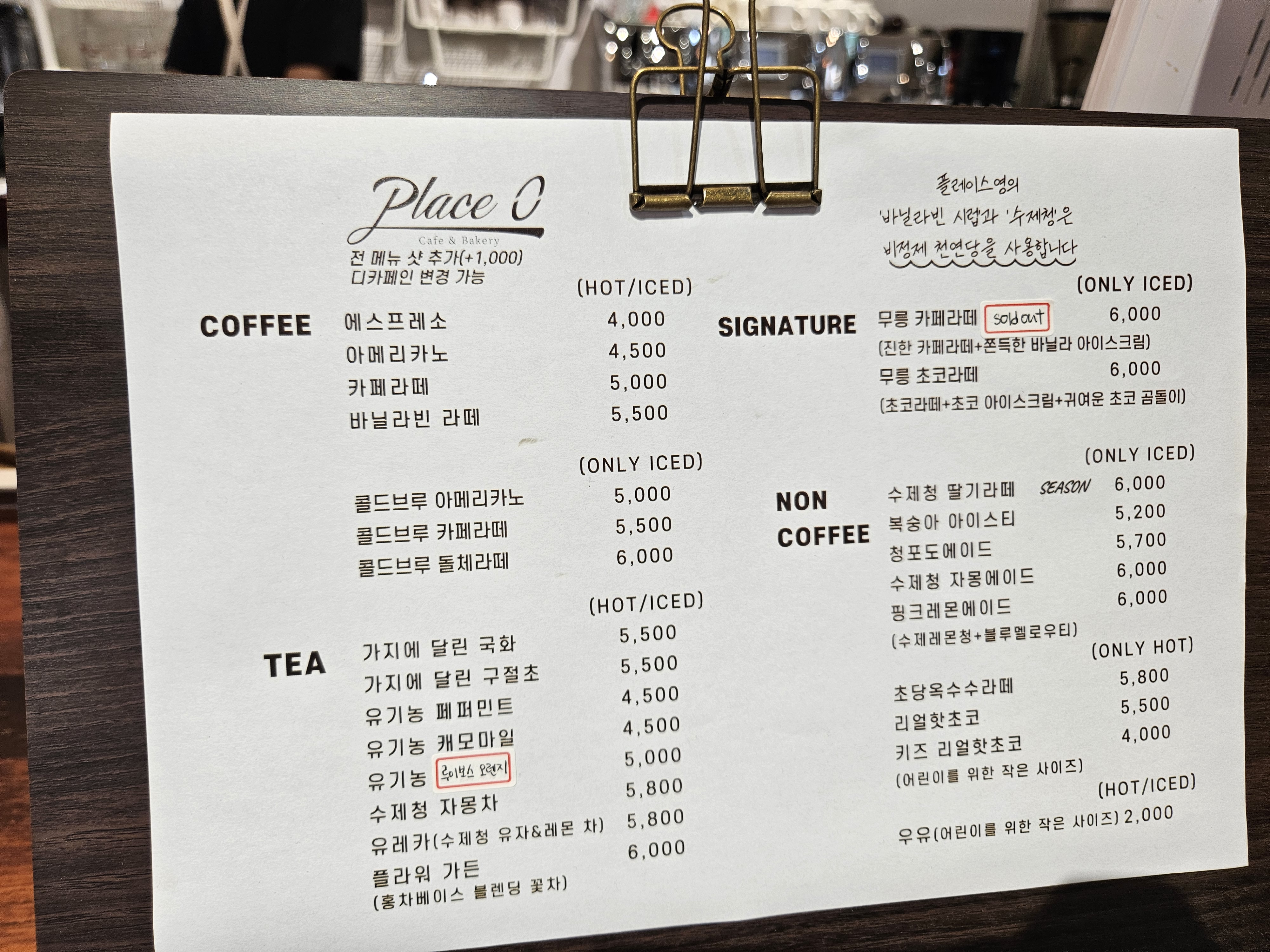 카페 플레이스영의 시그니처 메뉴로 무릉 카페라떼(6,000)와 무릉 초코라떼(6,000) 등이 있네요.