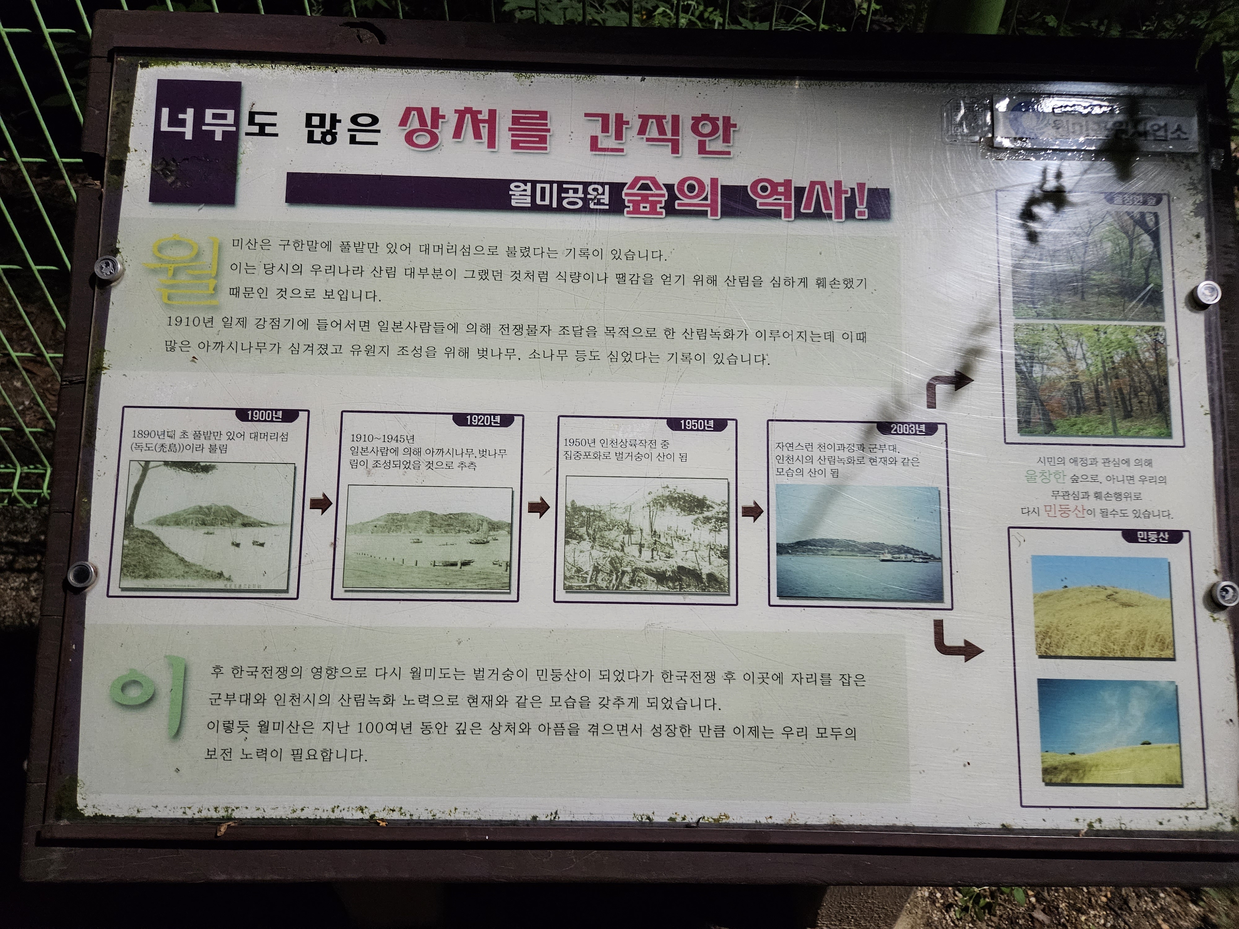 하지만 1950년 인천상륙작전 중 집중포화를 받으며 다시 벌거숭이 산이 되었고, 지금은 자연스러운 천이과정과 군부대와 인천시의 녹화사업으로 숲을 이루었습니다.