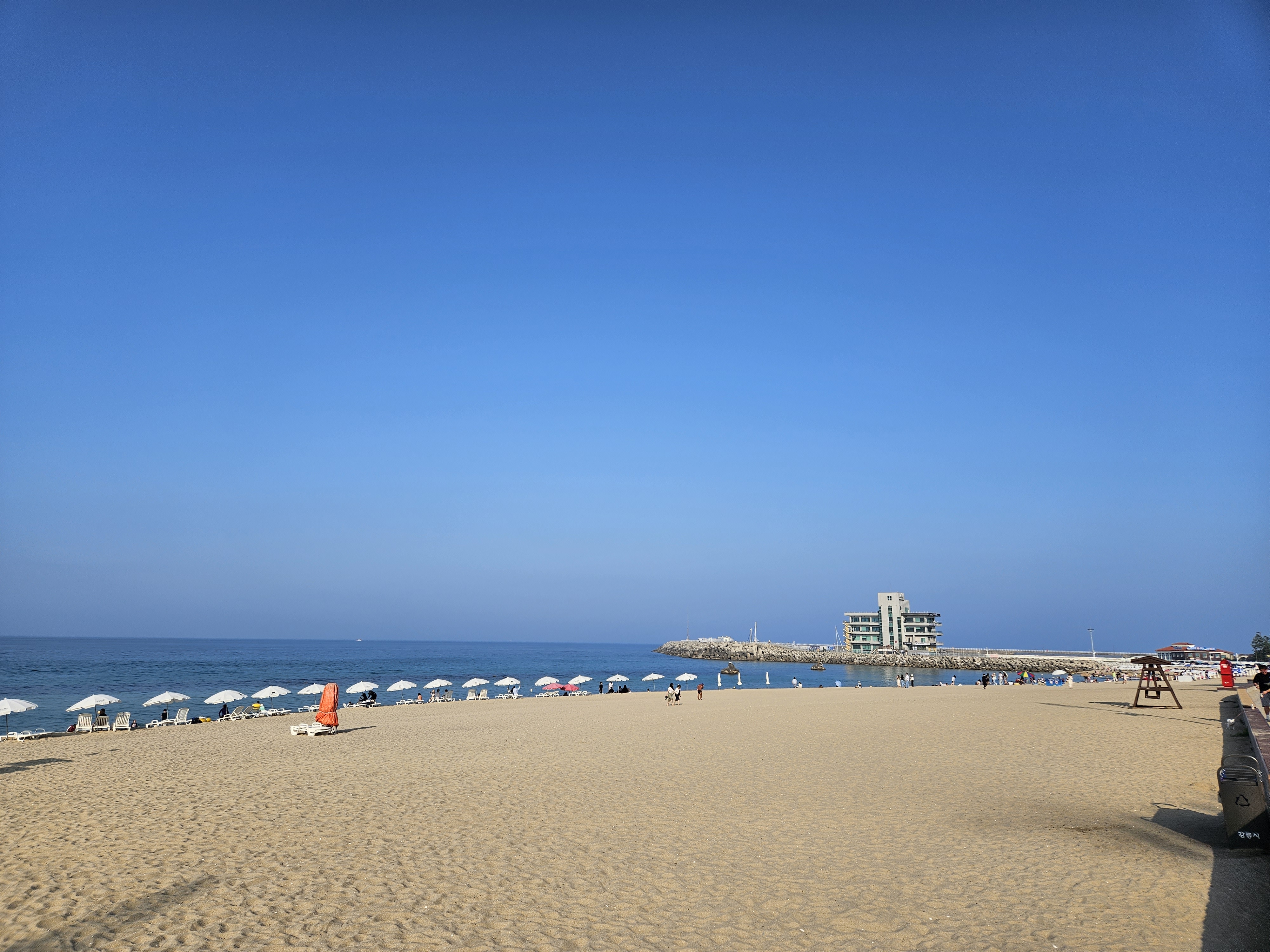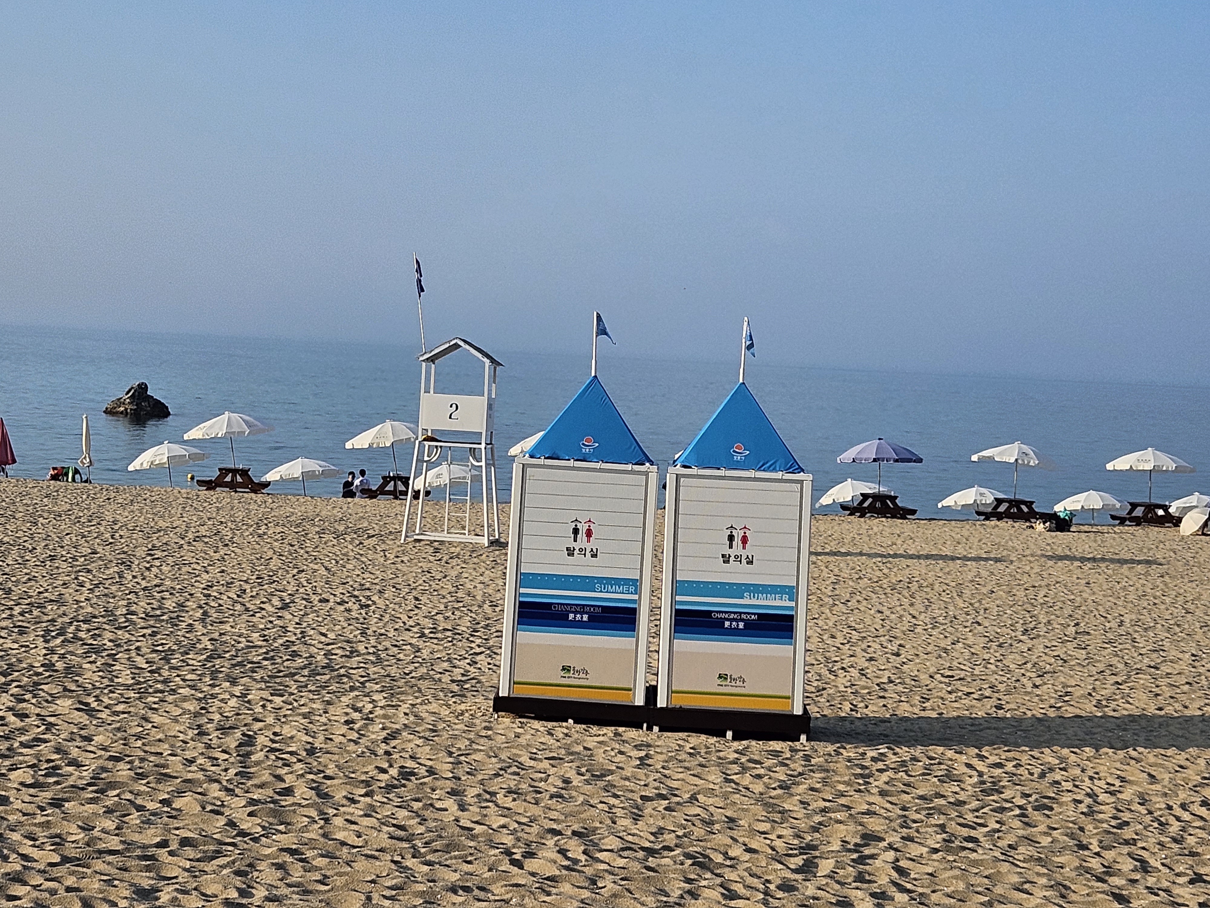 안목해수욕장 개인 파라솔은 양쪽 끝 지점에만 설치할 수 있도록 되어 있는 것 같습니다.