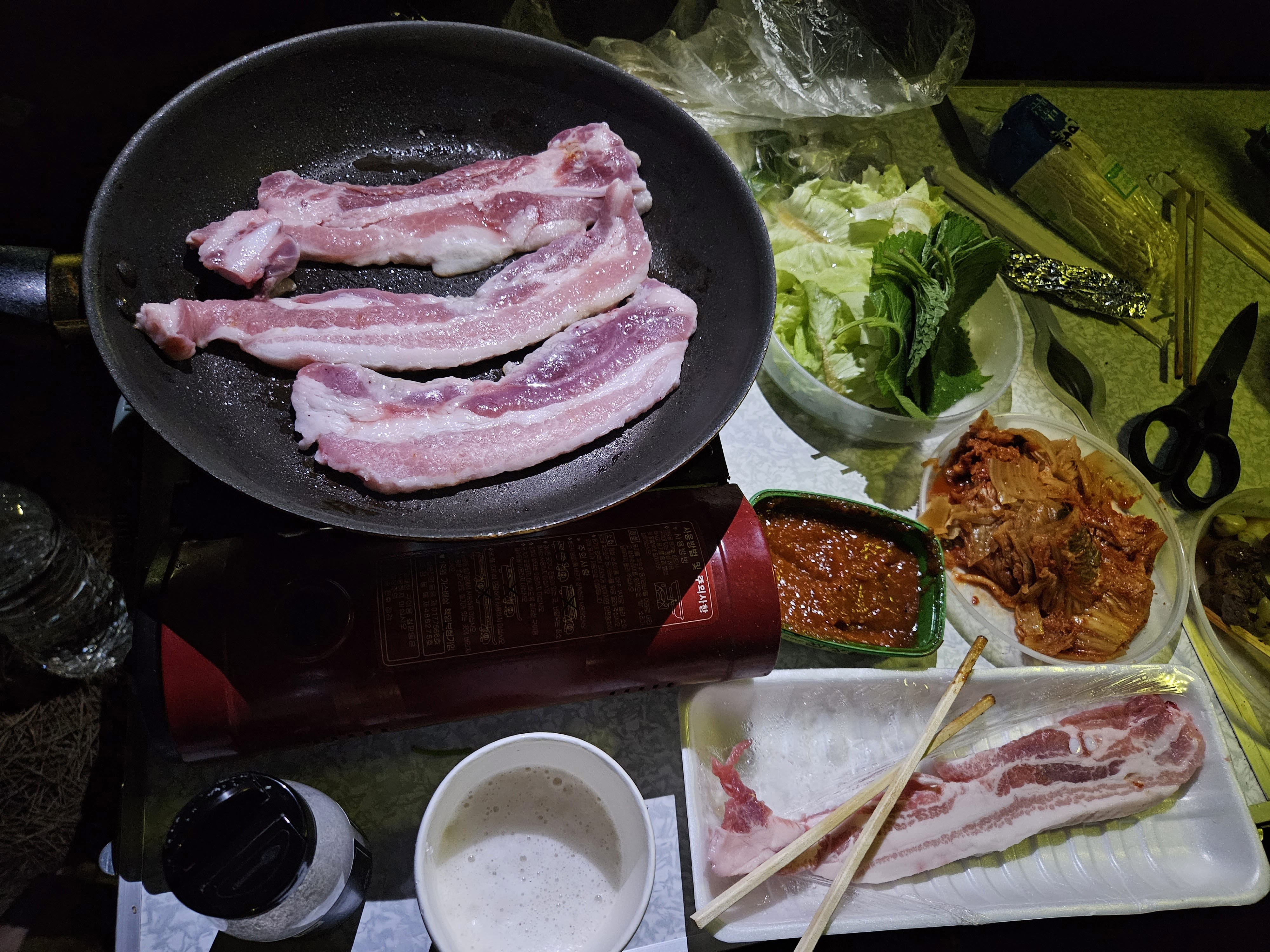 첫날 저녁엔 삼겹살과 소 부채살로 해결했고요.