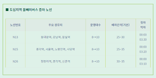 그런 측면에서 올배미버스를 한시적으로 운행한다고 하니 반가운 소식이 아닐 수 없네요.
