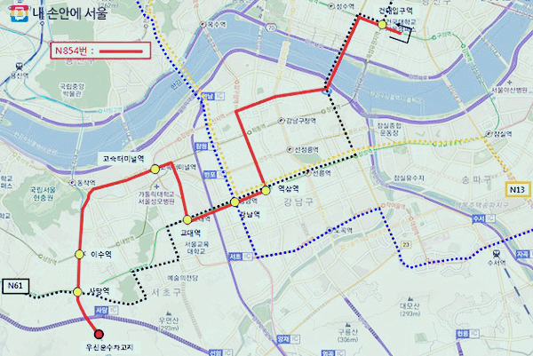 신설되는 노선 첫번째는 N854번 버스(사당역~건대입구역) 노선도입니다.