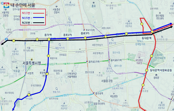 도심지역을 운행하는 N13, N15, N26번 버스가 이에 해당하는데요.