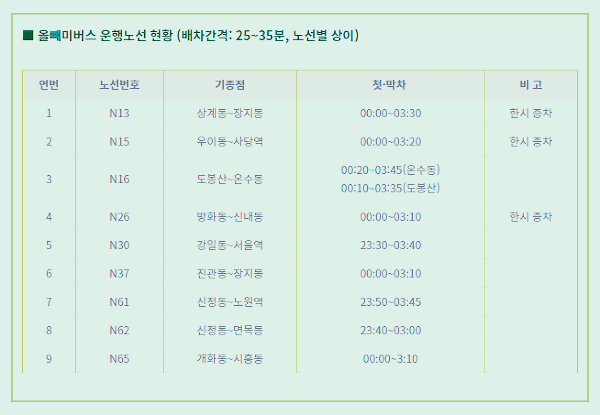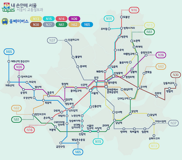 기존 올빼미버스인 N16, N26, N62, N65번 버스와 환승이 가능합니다.