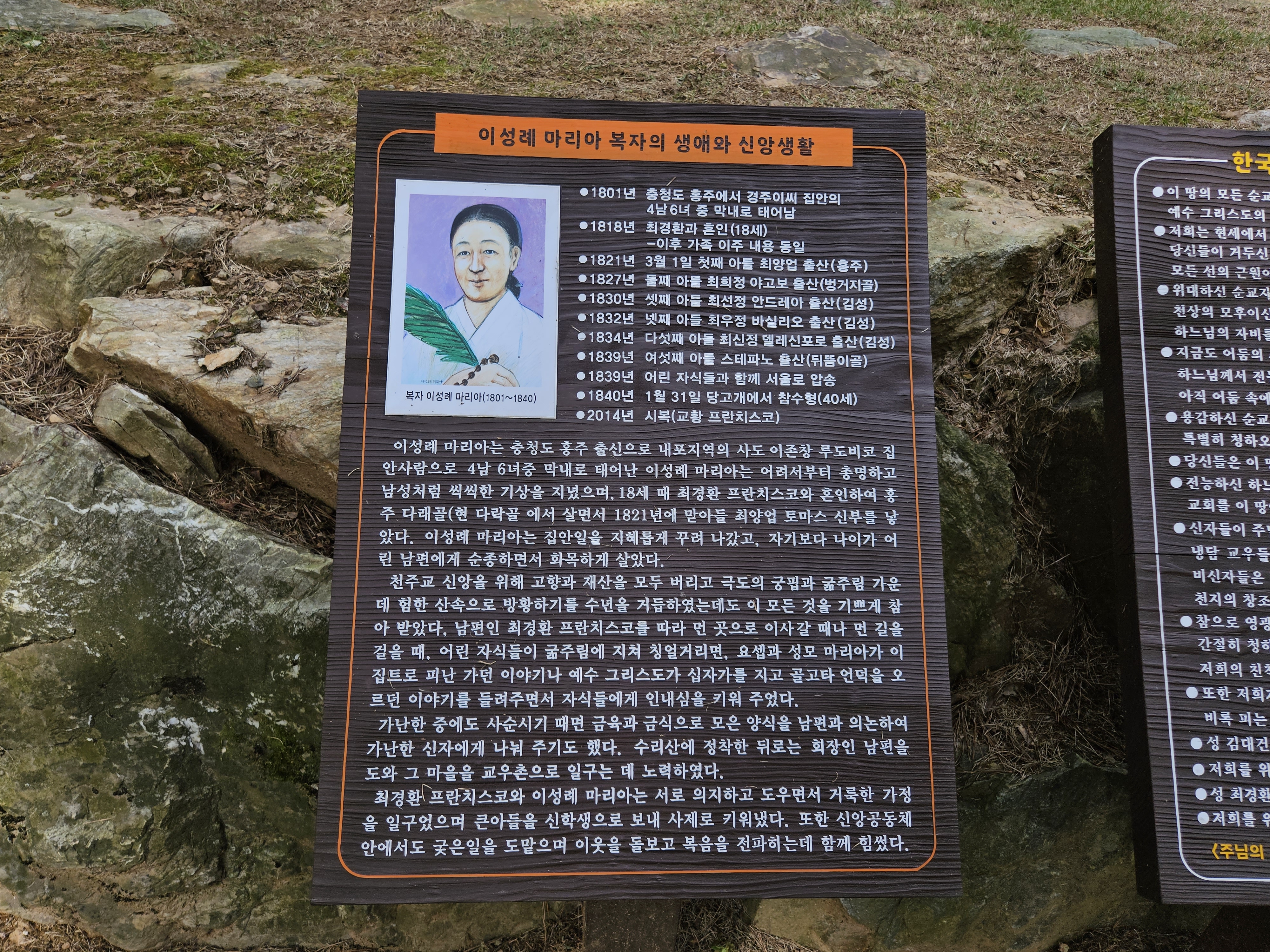 수리산에 정착한 뒤로는, 남편을 도와 이 마을을 교우촌으로 일구는 데 노력하였습니다.