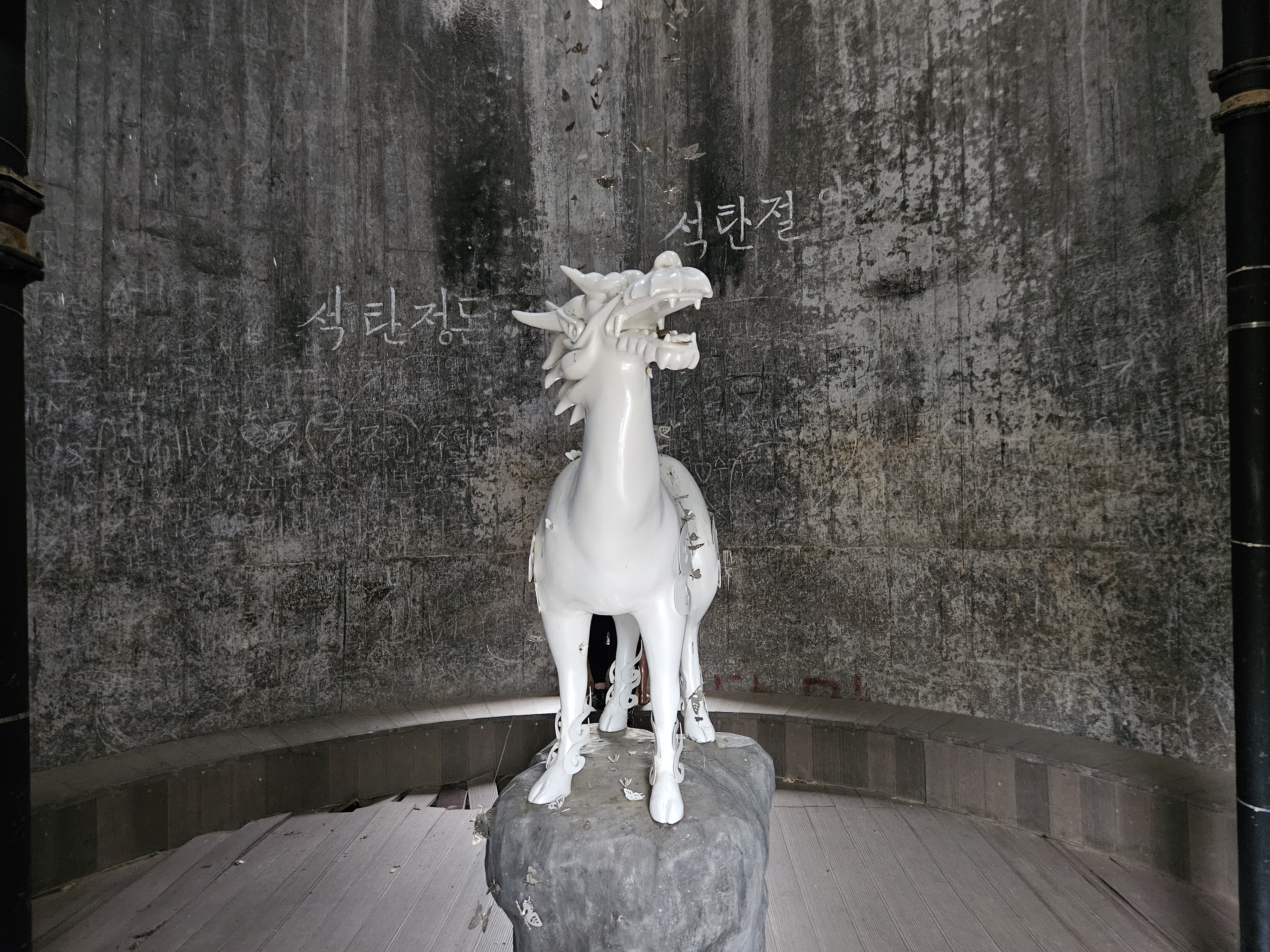 말 조형물이 하나 있고, 내부 벽면에는 당시 인부들이 적어놓은 '석탄정돈, 석탄절약' 글자가 적혀 있습니다.