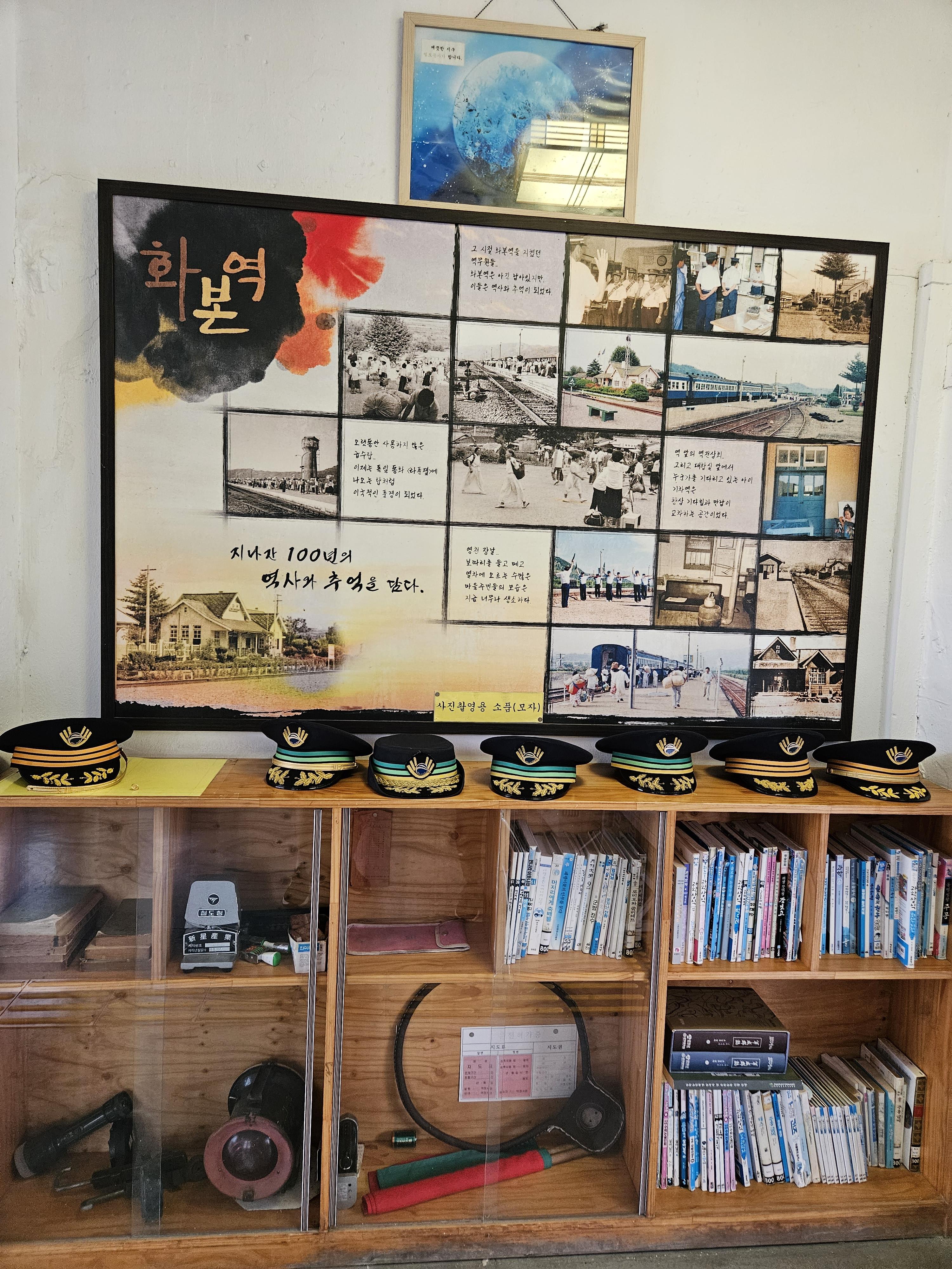 지나간 화본역의 100년 역사를 스케치한 모습이며, 기관사 모자를 착용해 사진을 찍을 수 있고, 옛날 사용하던 도구들이 전시되어 있네요.