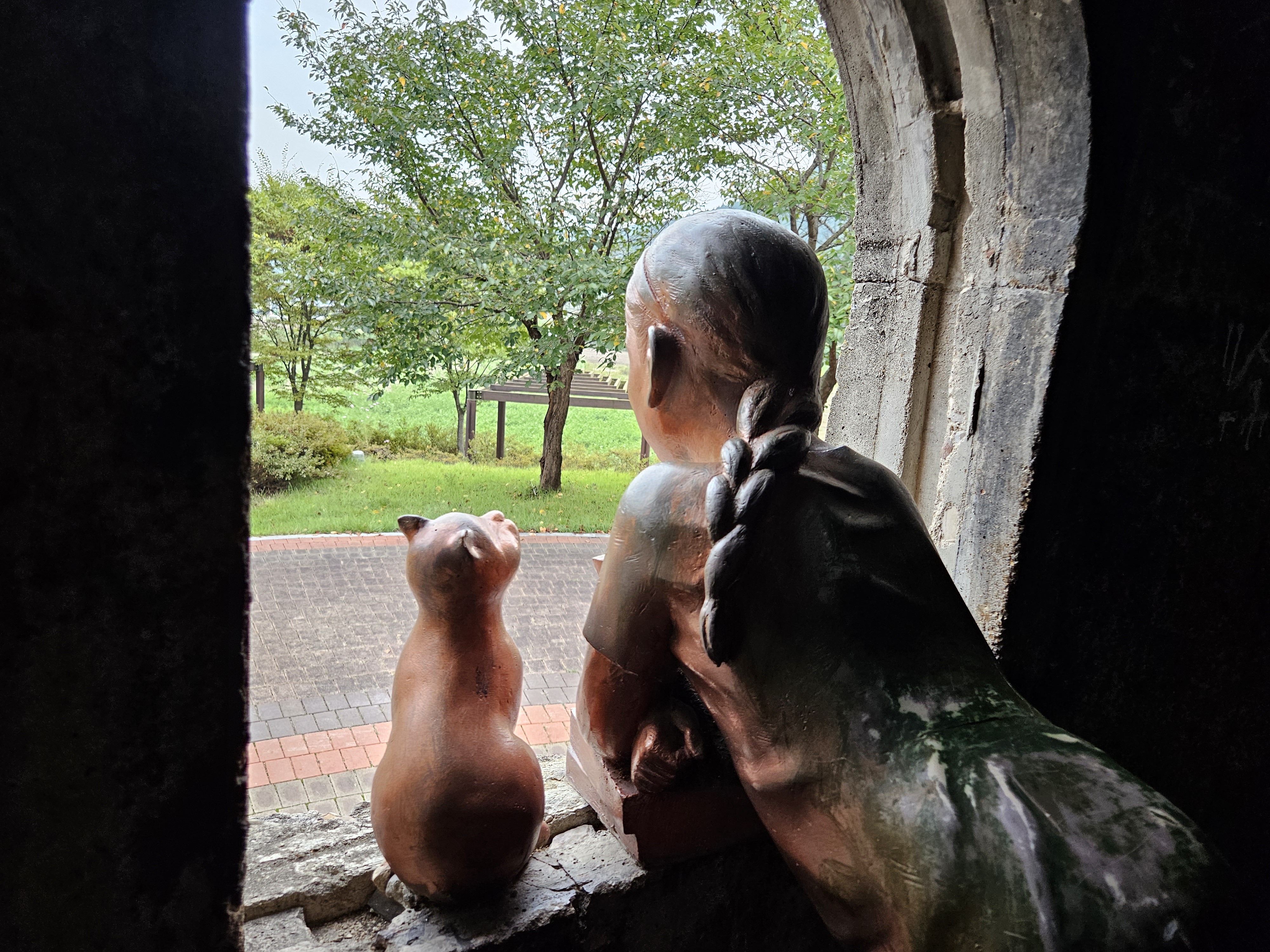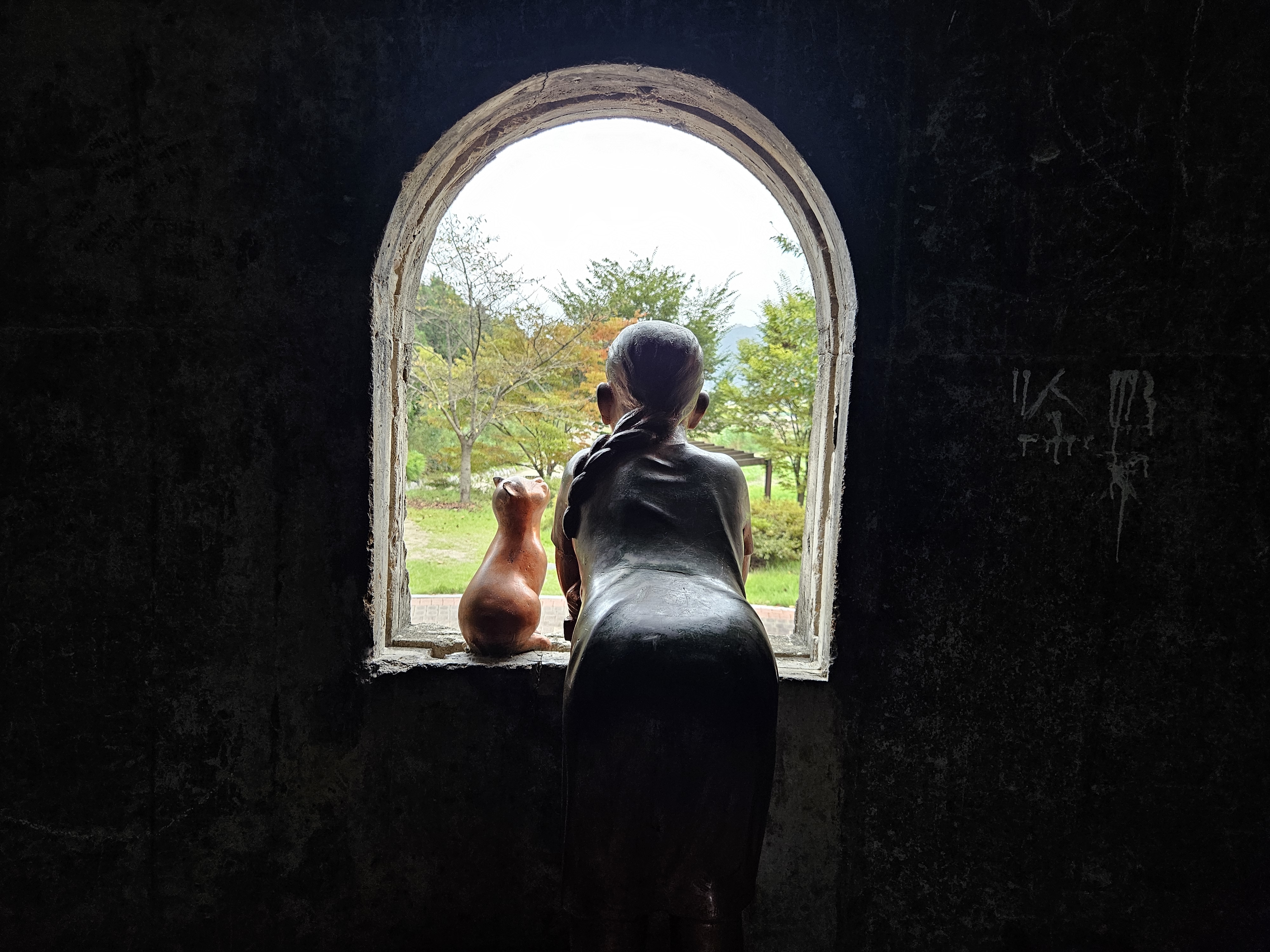 급수탑 내부에서 바깥을 바라보고 있는 소녀