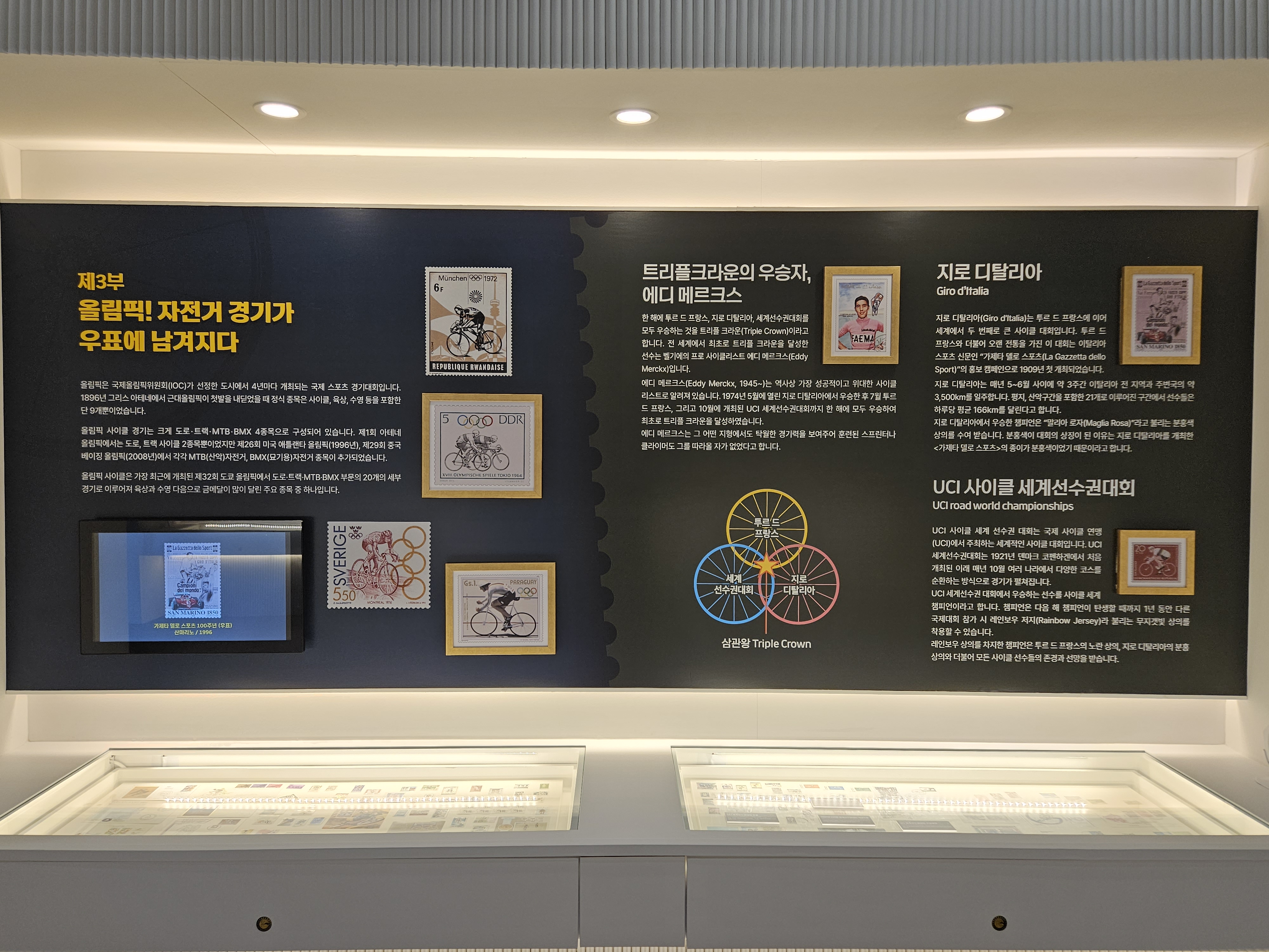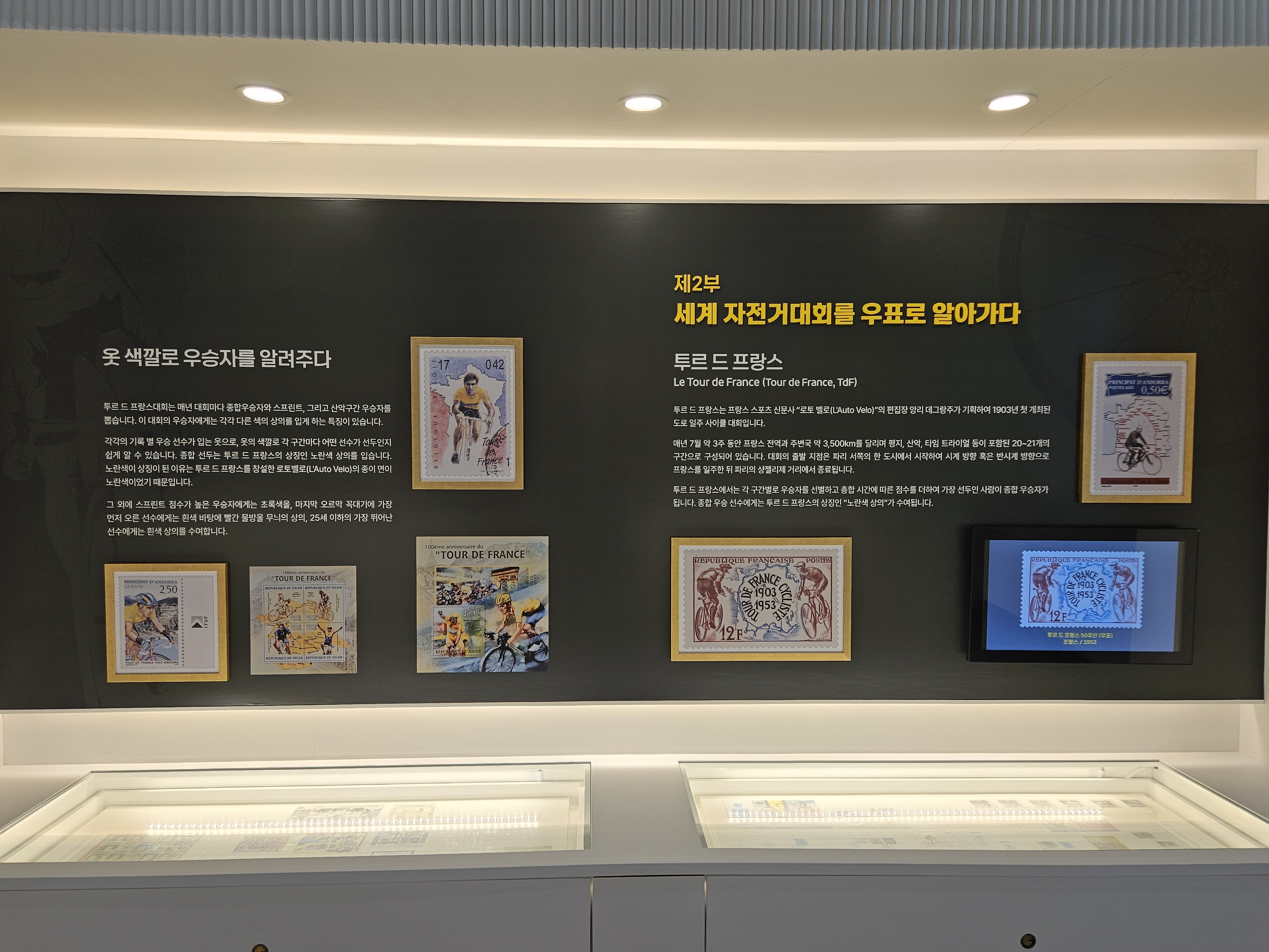 클래식, 경기용, 우편배달부, 이색 자전거 등 각국의 다양한 자전거와 투르 더 프랑스를 비롯한 유명한 세계 자전거대회 등 우표를 통해 세계 각국의 자전거와 자전거대회를 감상할 수 있는 이색적인 전시입니다.