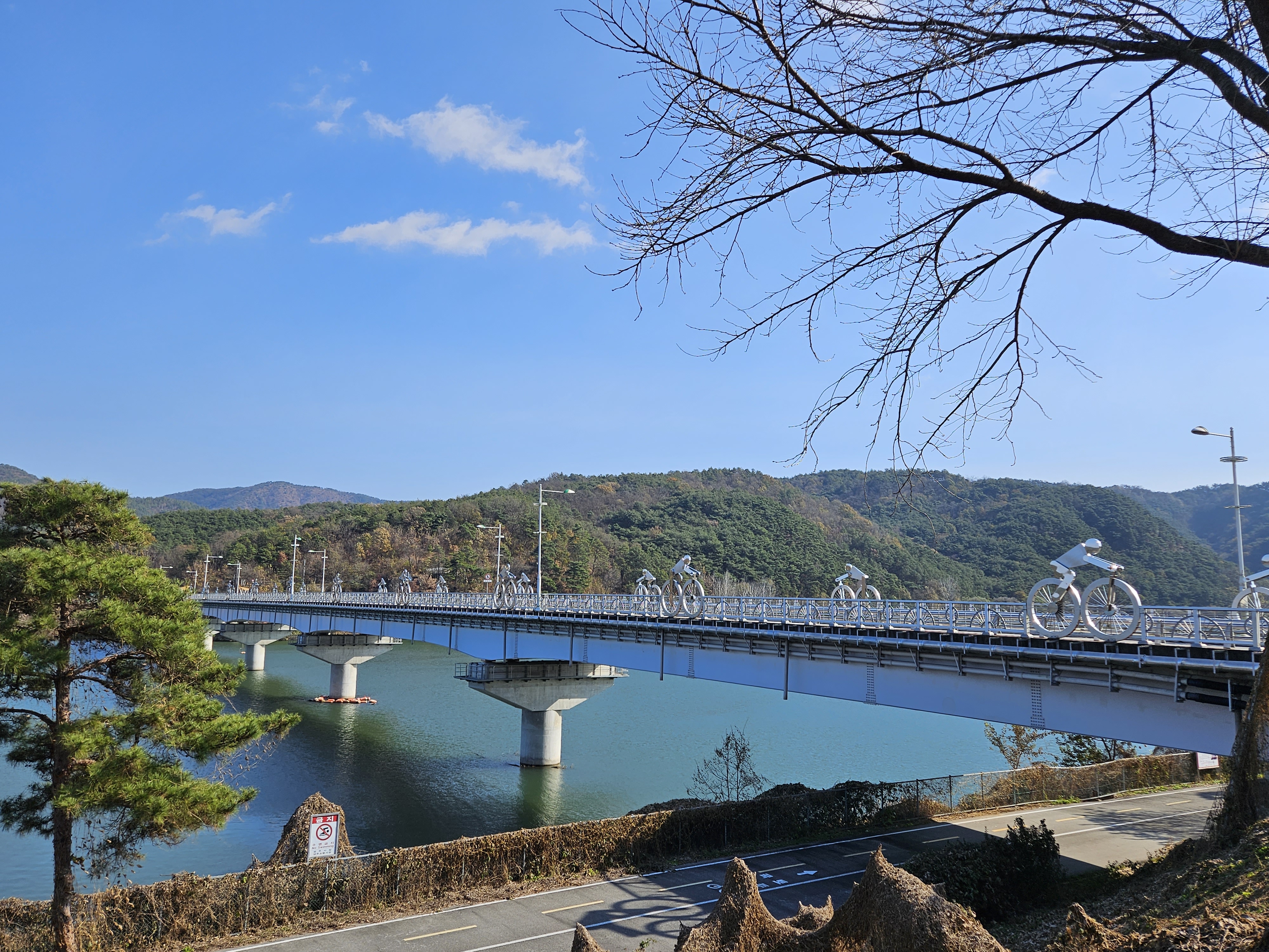 다리 양쪽으로 자전거를 타고 가는 모습을 조형물로 만들어 이곳이 자전거 박물관이구나를 보여주고 있습니다.