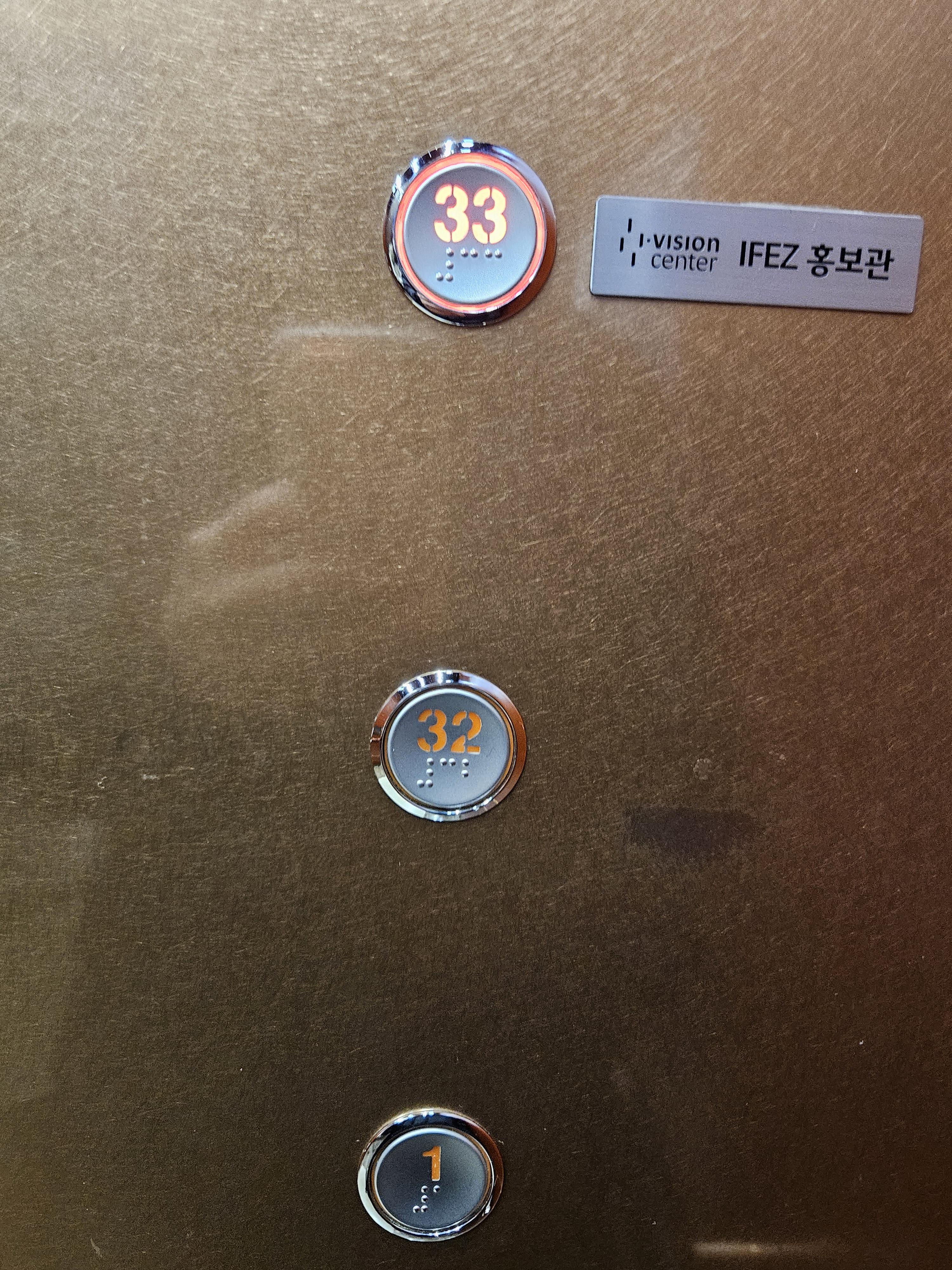 엘리베이터 두 대가 있으며, 1층에서 33층을 누르고 올라가면 됩니다.