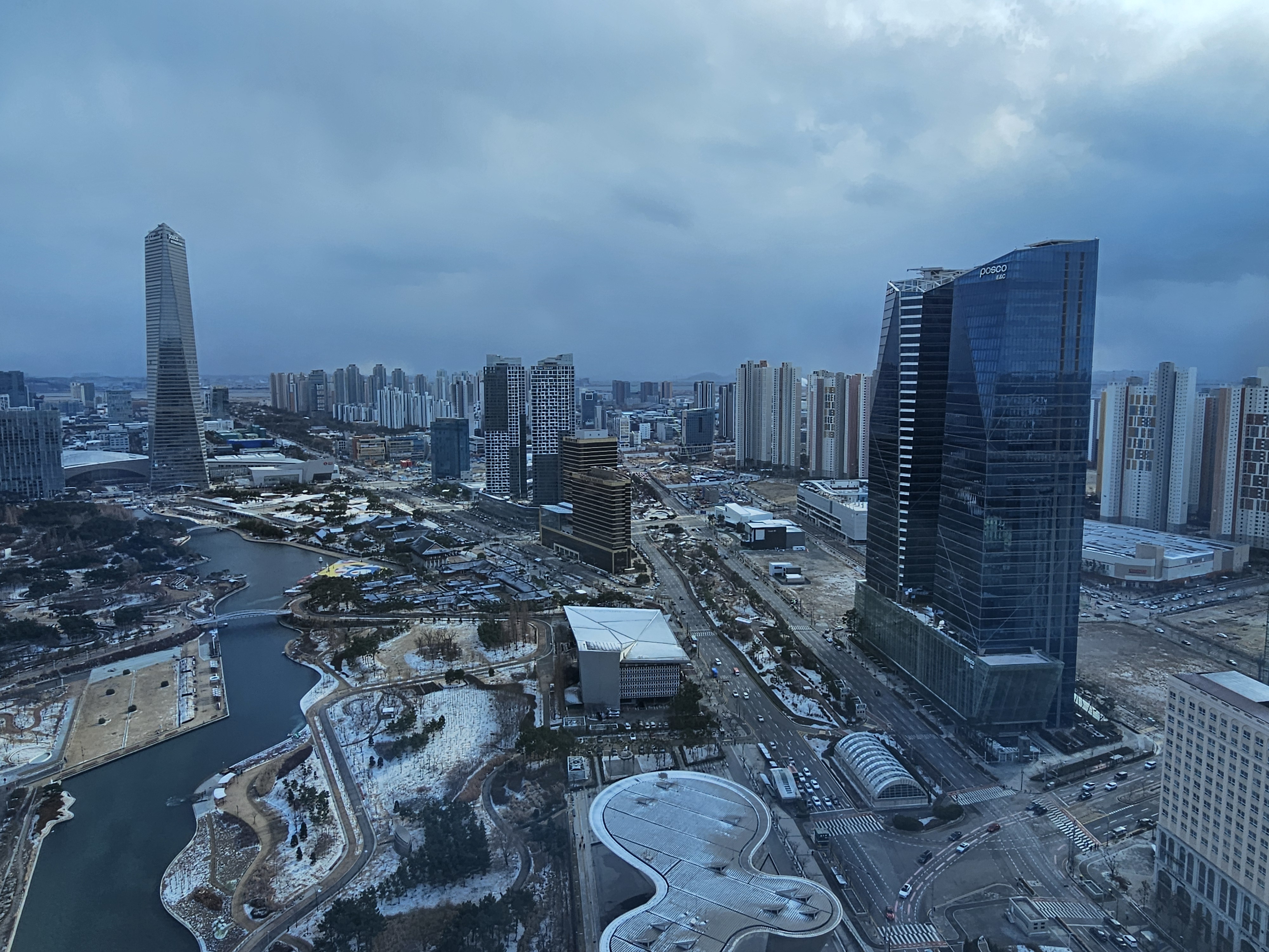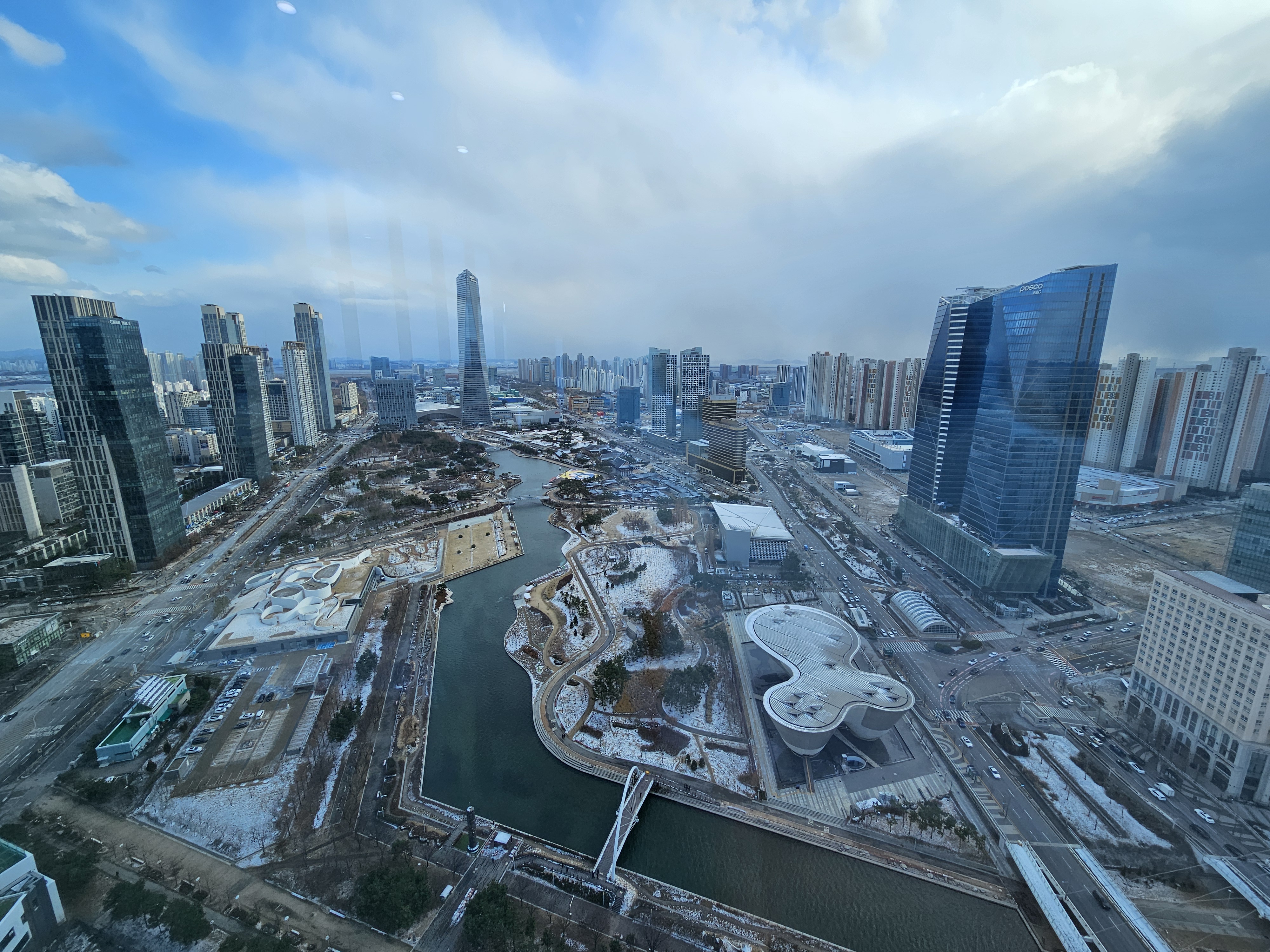 정면에 있는 빌딩은 포스코타워-송도로 송도국제업무단지의 중심에 자리한 높이 305m(68층)의 마천루입니다.