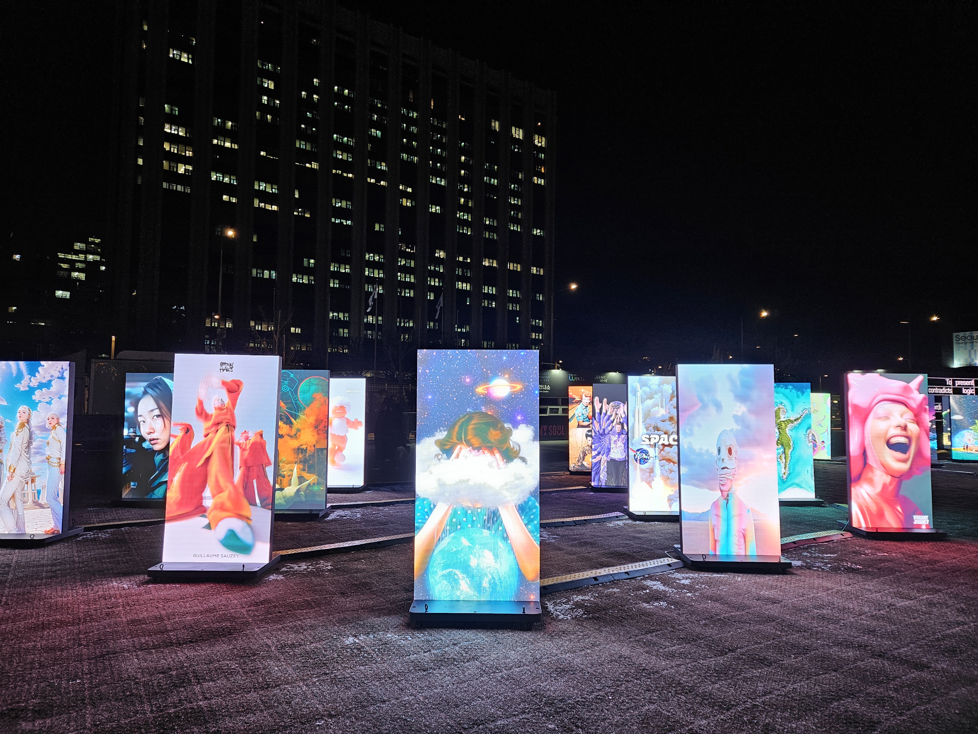 여러 국적의 미디어 아티스트 5명의 작품들은 대형 디지털 파사드로 연출되고 있습니다.