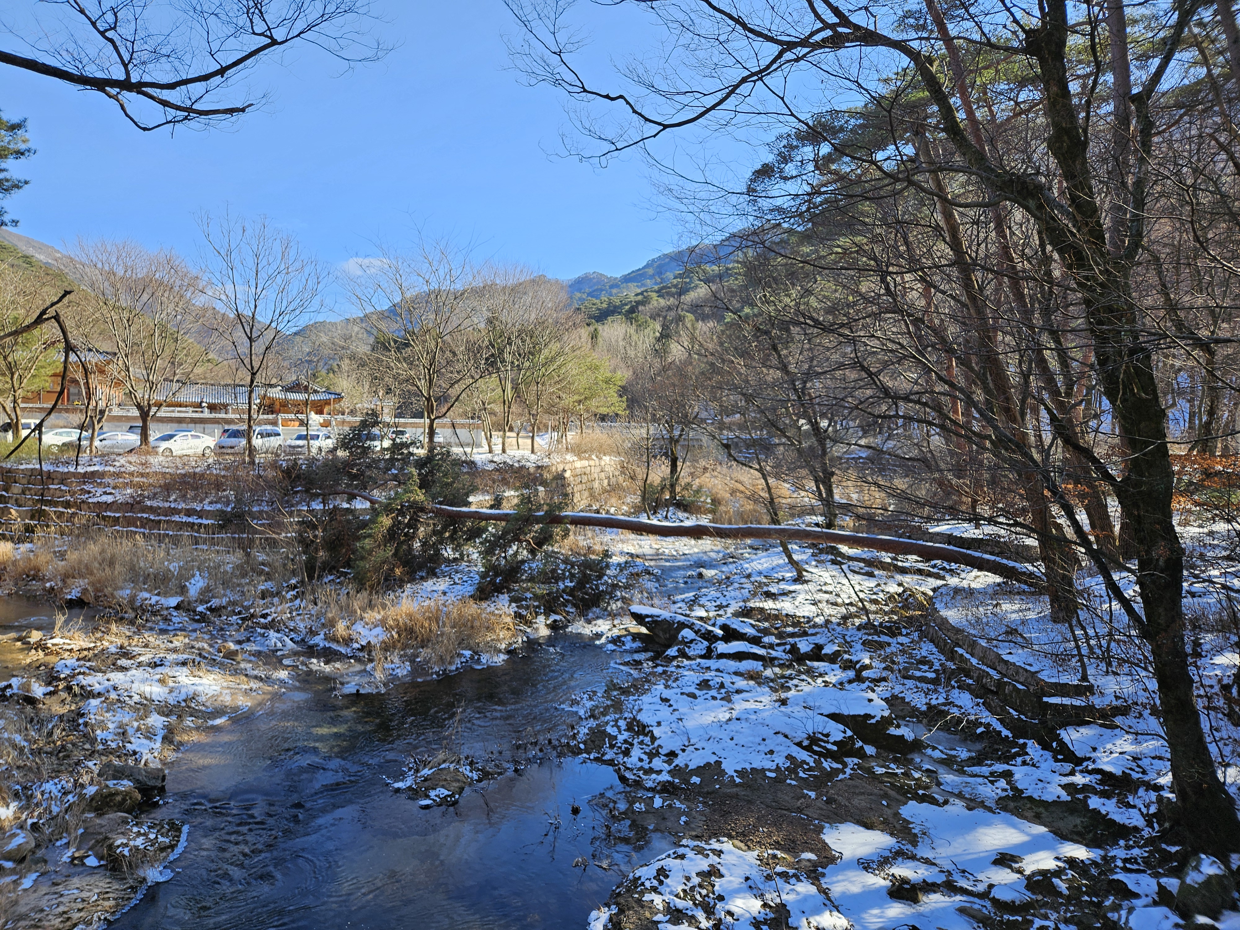 새벽에 내린 눈이 산에 남아 있는 상태의 법주사 진입로