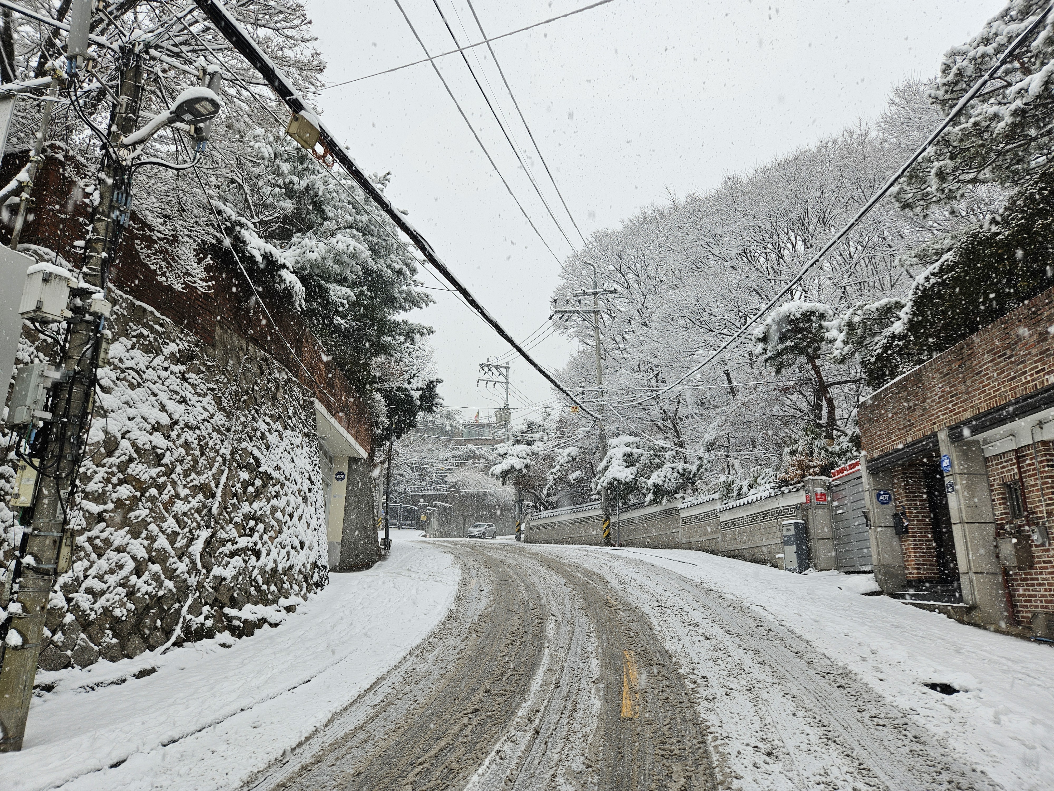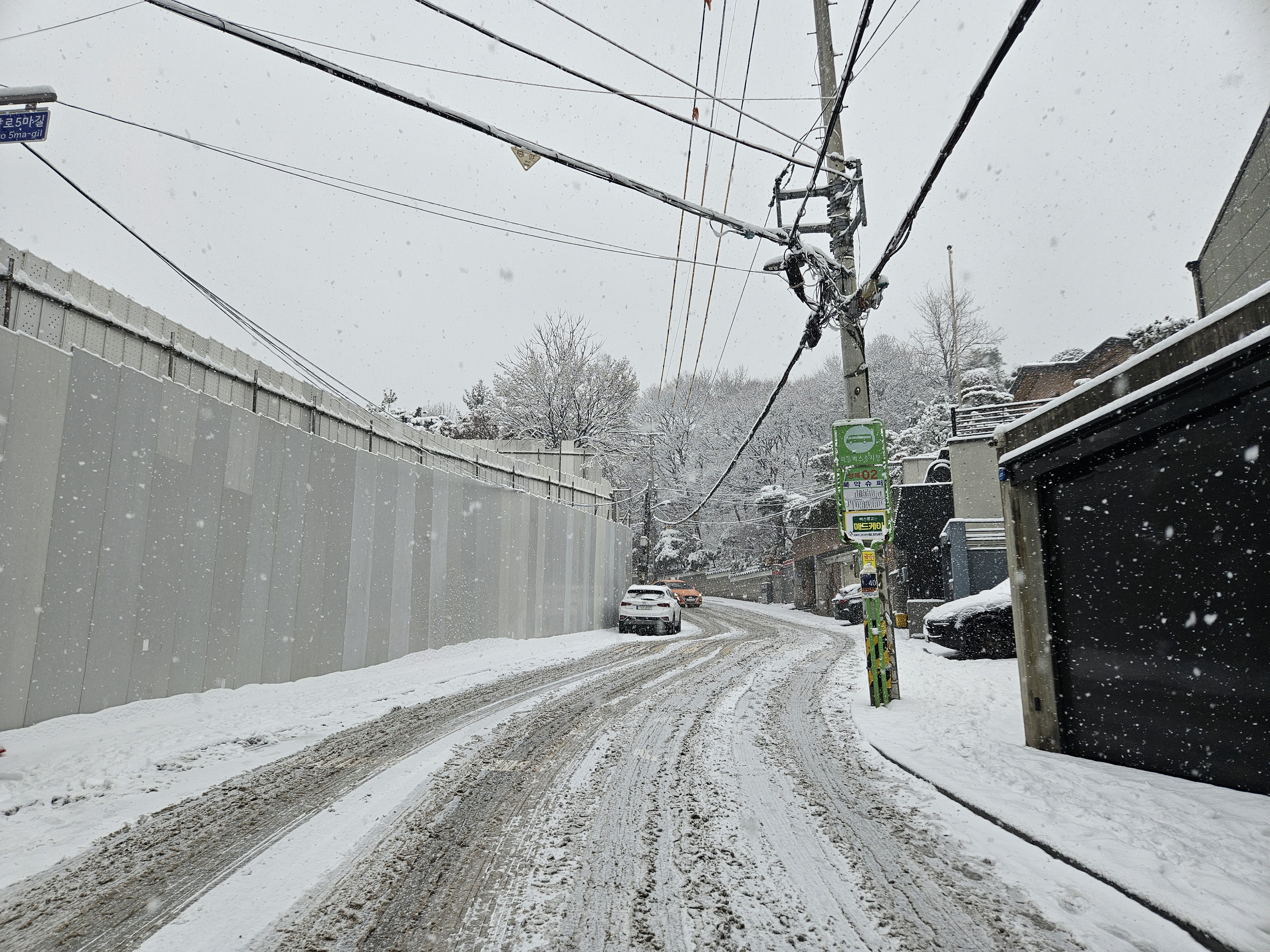 갑자기 많이 내린 눈으로 간선도로 제설이 급한지 이런 골목길까지는 제설을 할 수 없는 상태인 듯합니다.